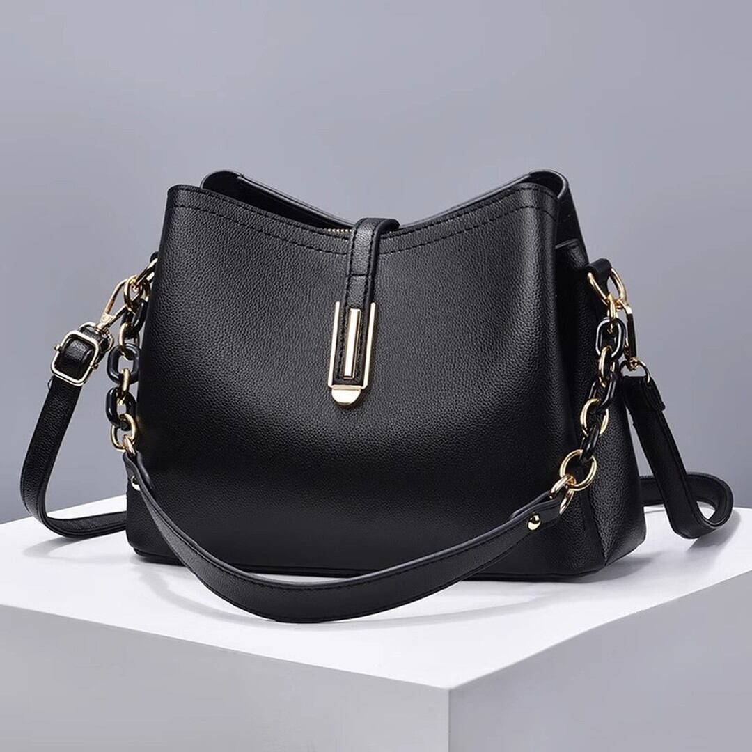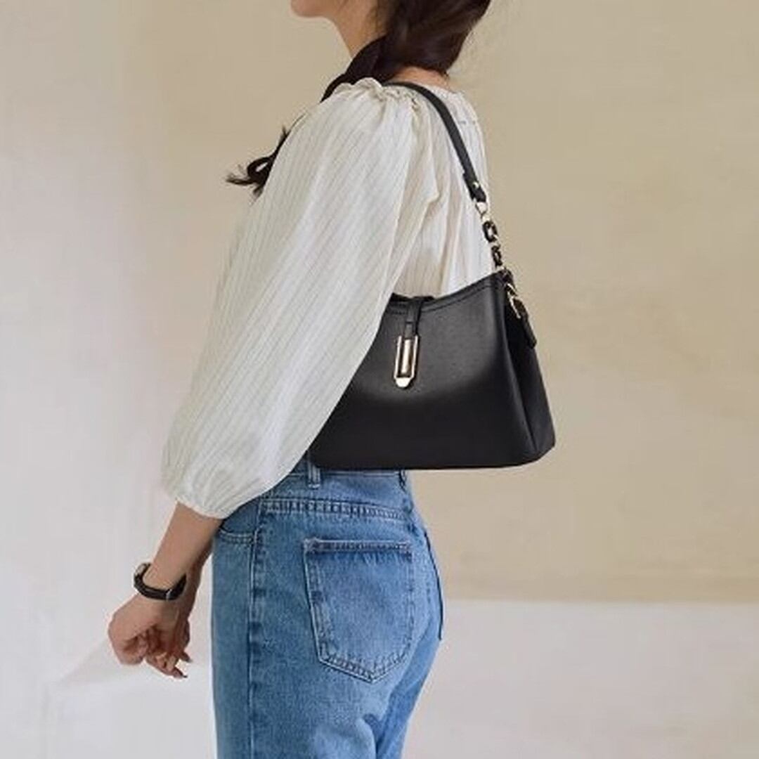 チェーンストラップがアクセントになり、シンプルなコーディネートに華やかさをプラスします。