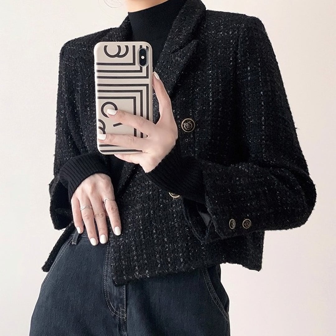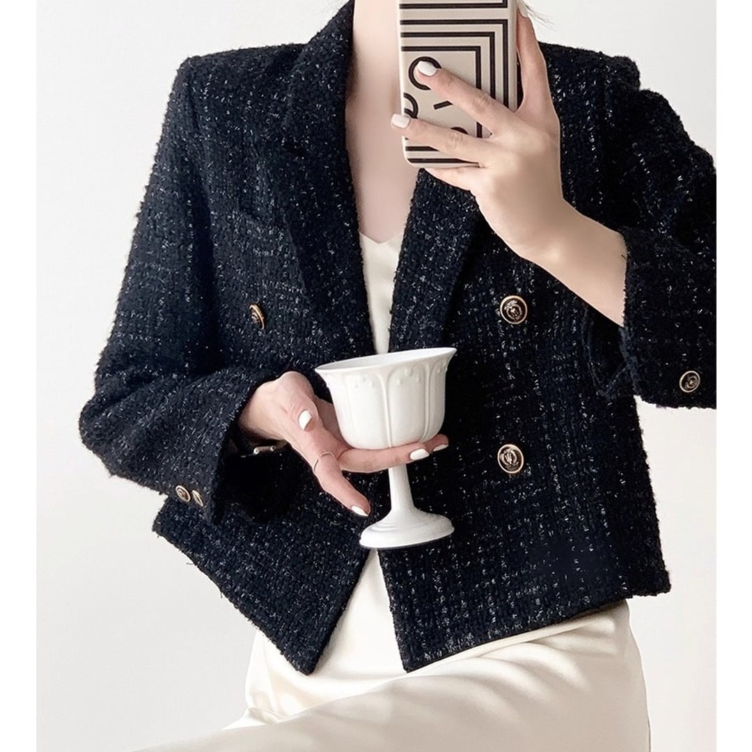 ダブルブレストのクロップド丈ジャケットは、洗練された印象を与えるアイテムです。普段使いはもちろん、少しフォーマルな場面にも対応できるので、ワードローブに一枚あると重宝します。