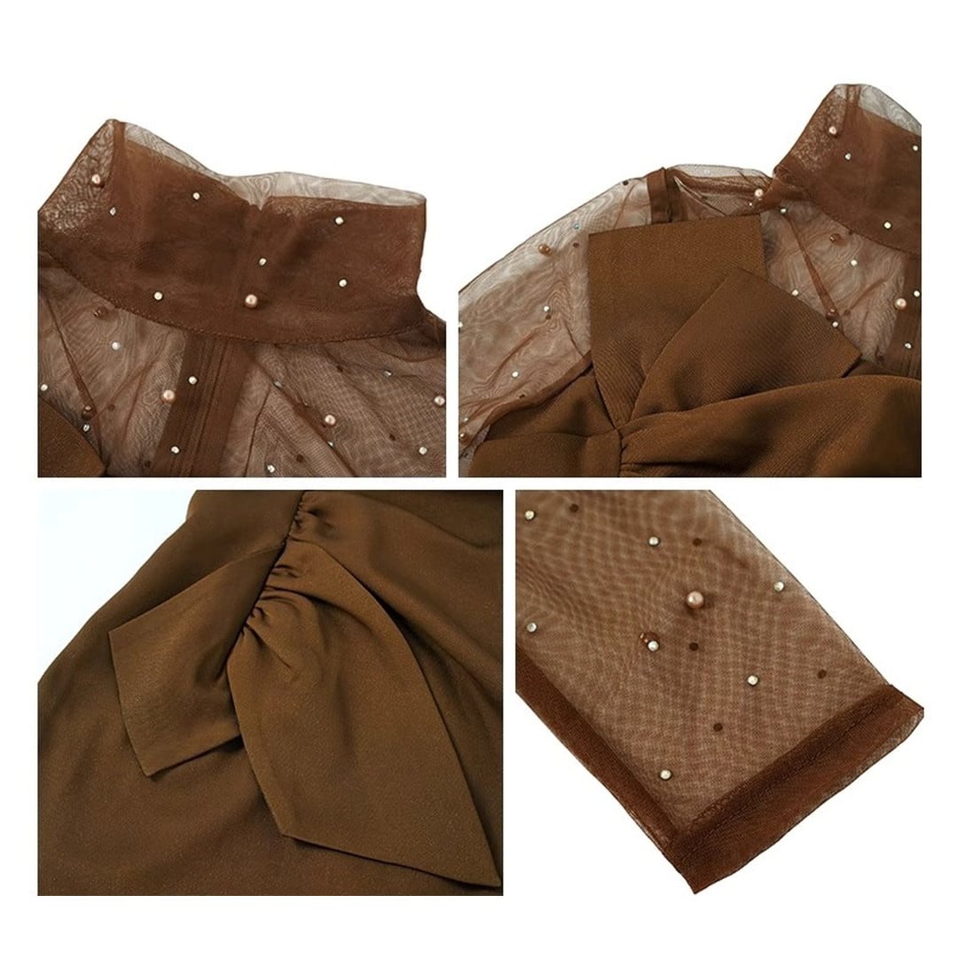 切り替えデザインが目を引くミディ丈の長袖ドレス。程よいタイトシルエットが、大人の女性らしさを引き立てます。首元はメッシュ素材でさりげない肌見せを演出。普段使いはもちろん、ちょっとしたパーティーシーンにもおすすめです。
