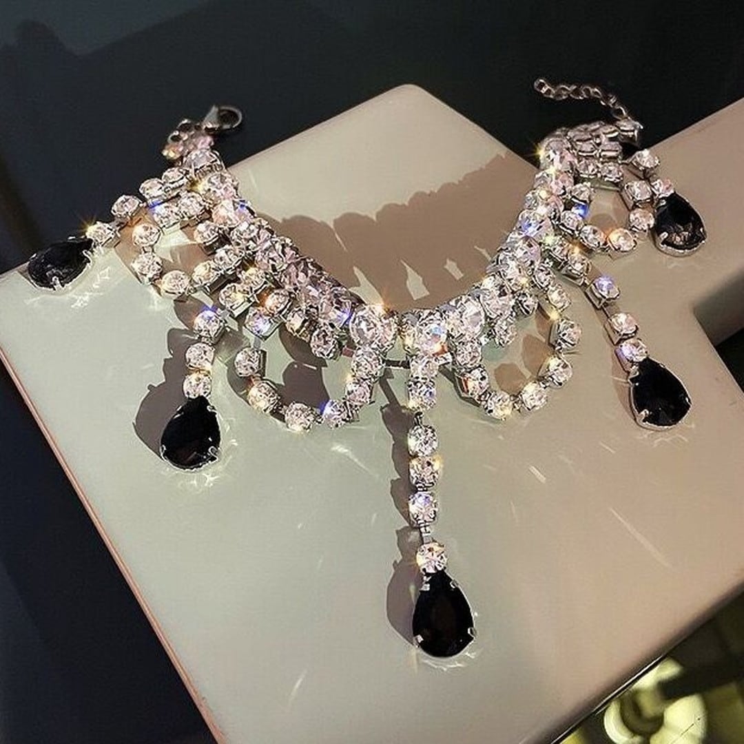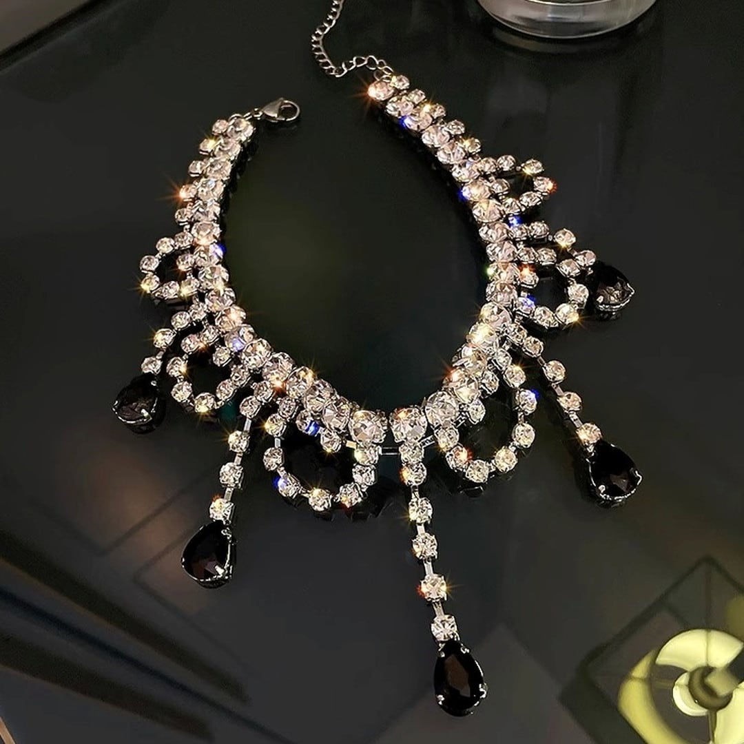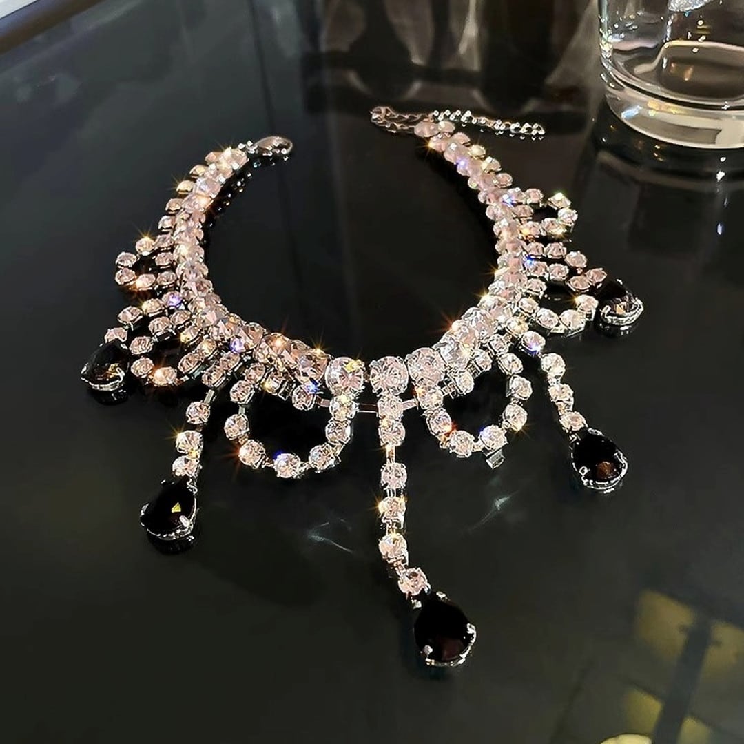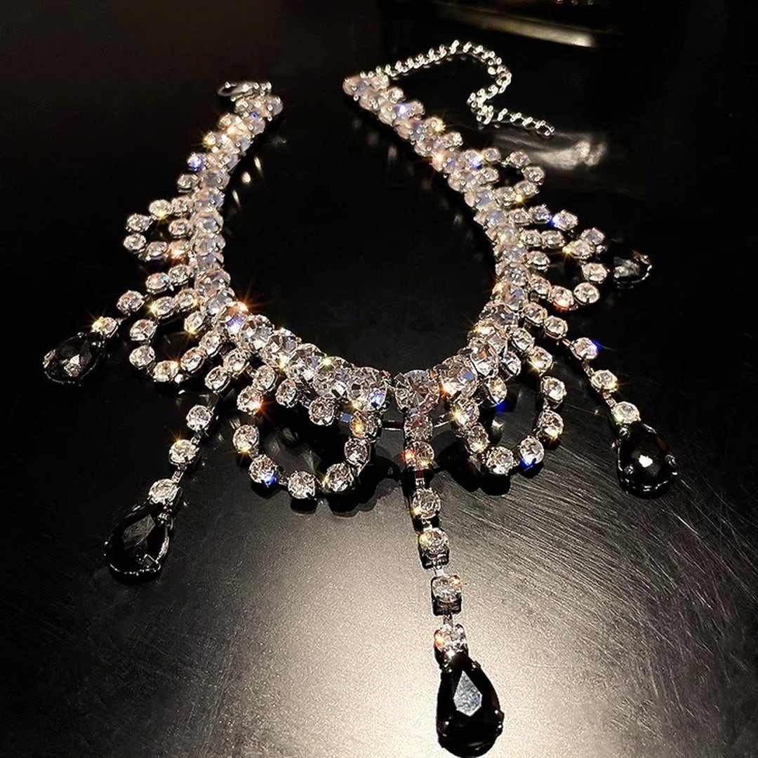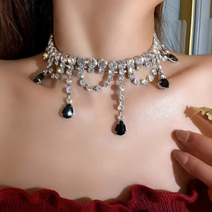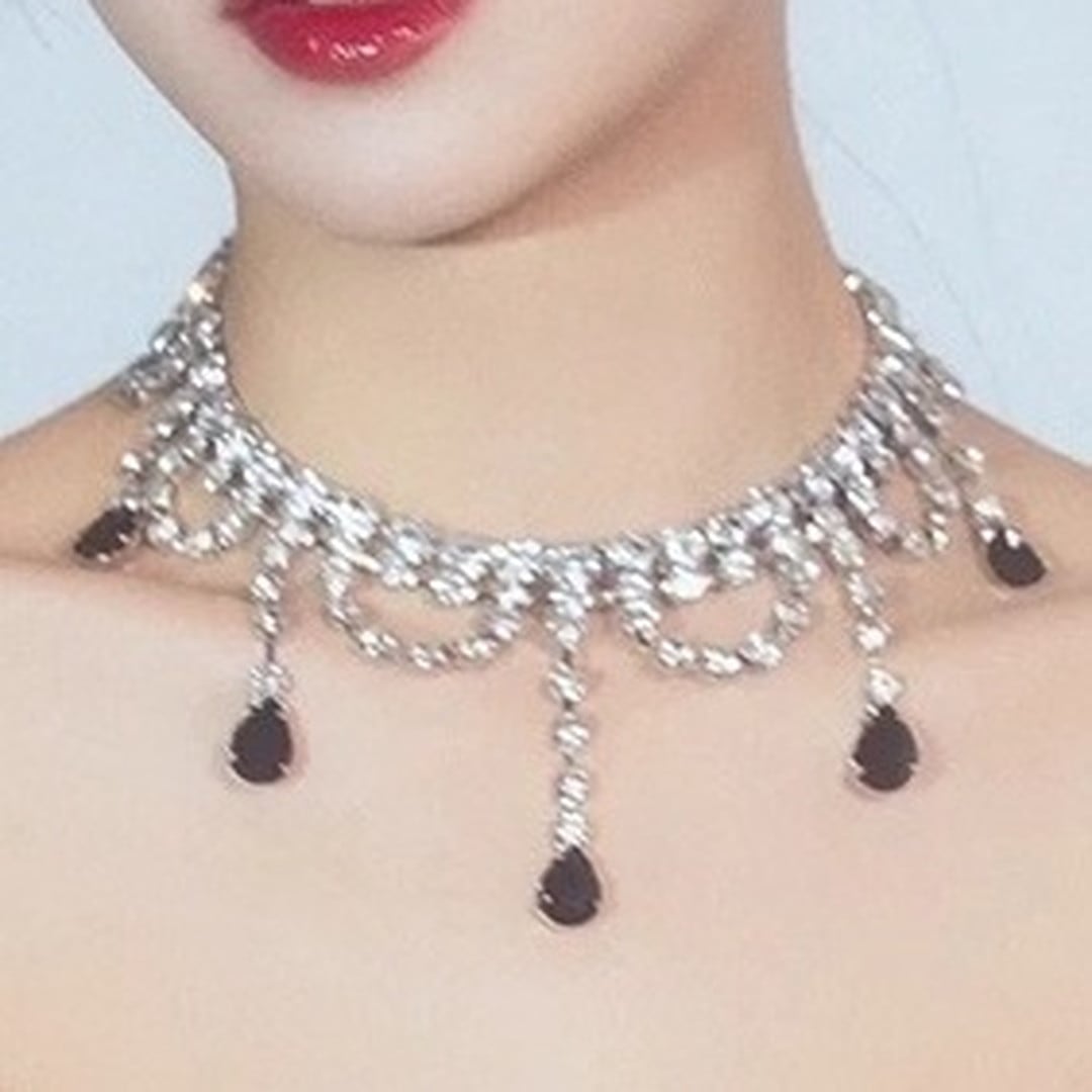 首元を華やかに彩るネックレス。ドロップ型の装飾が、デコルテを美しく演出します。特別な日はもちろん、普段使いにもおすすめです。