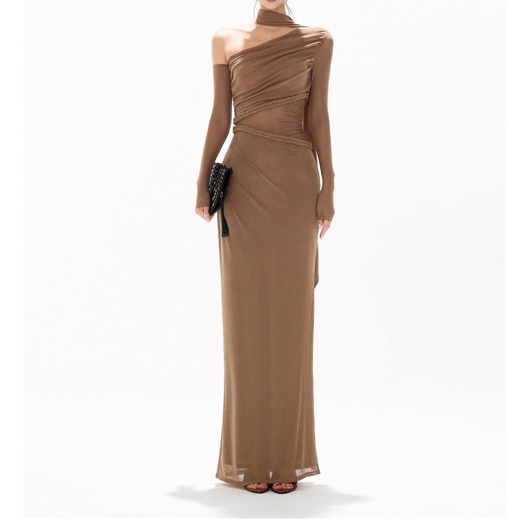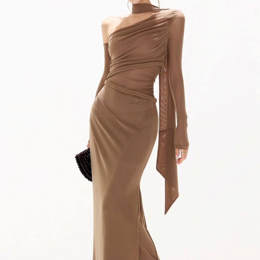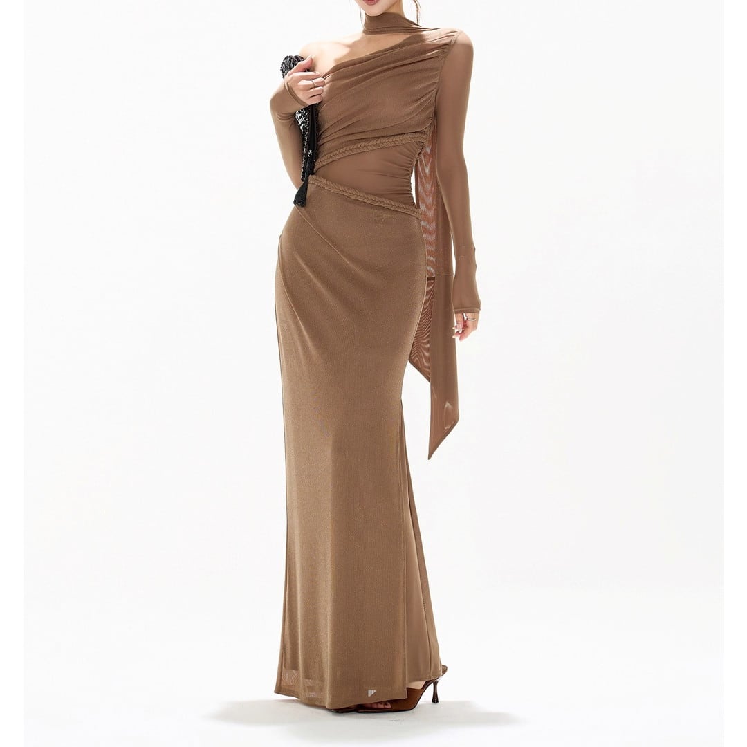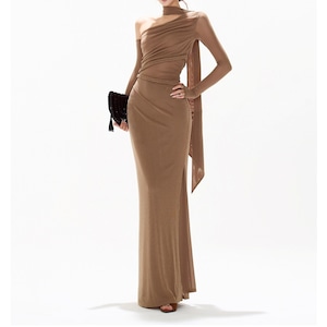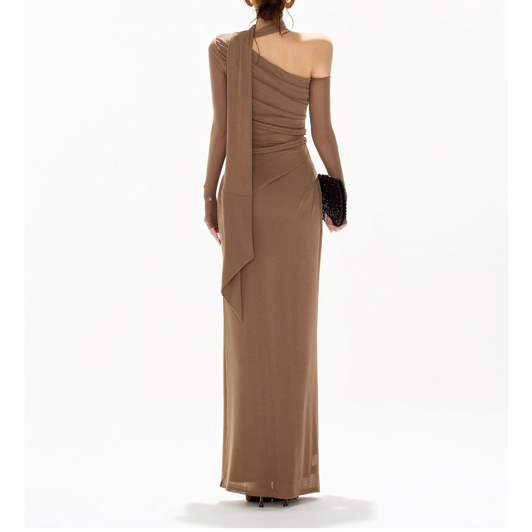 アシンメトリーなデザインが目を引く長袖マキシドレス。特別な日の装いにはもちろん、パーティーシーンにも最適です。程よい肌見せが、大人の女性らしさを演出します。