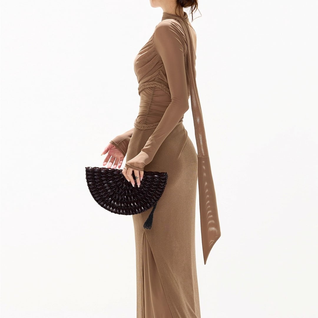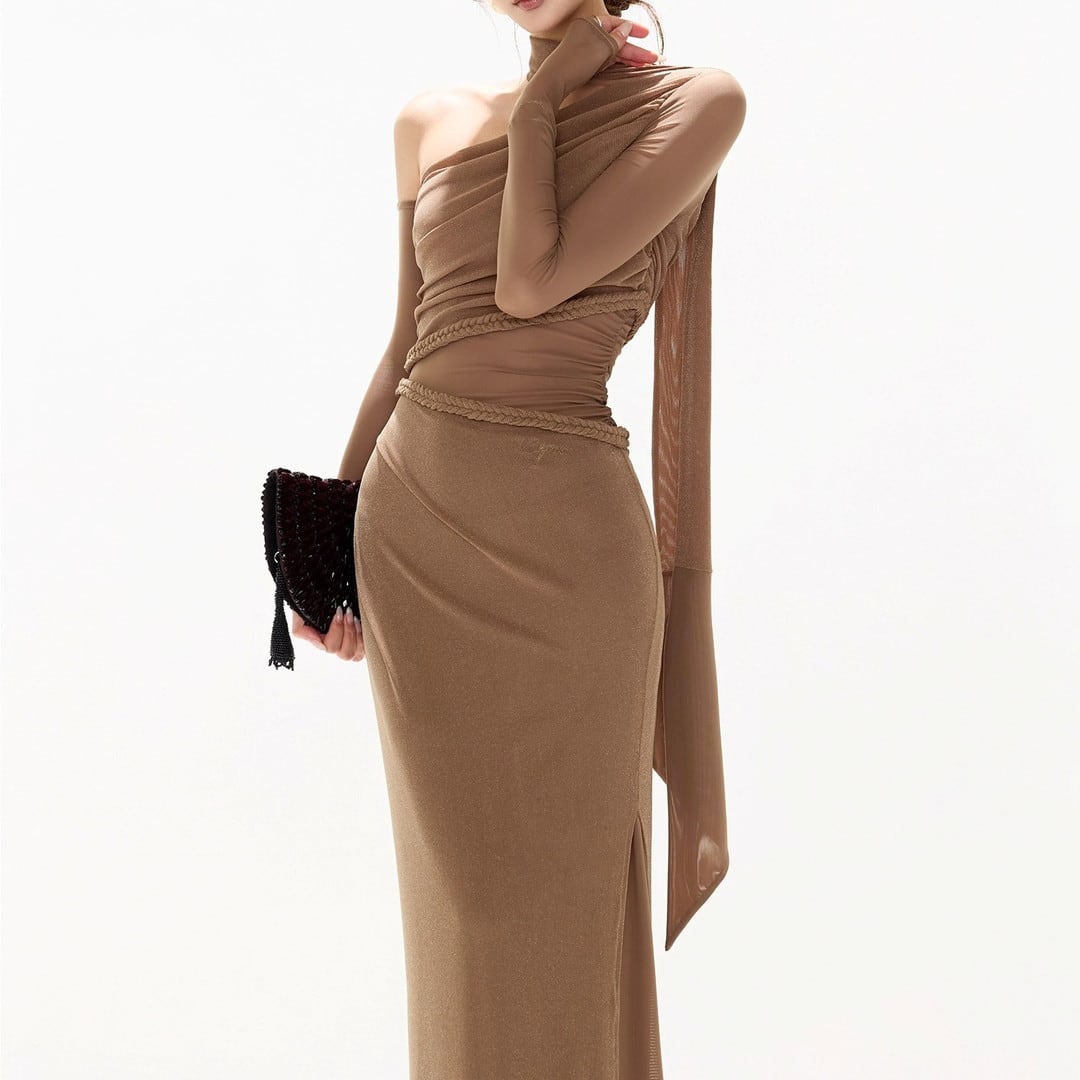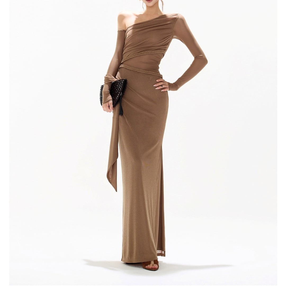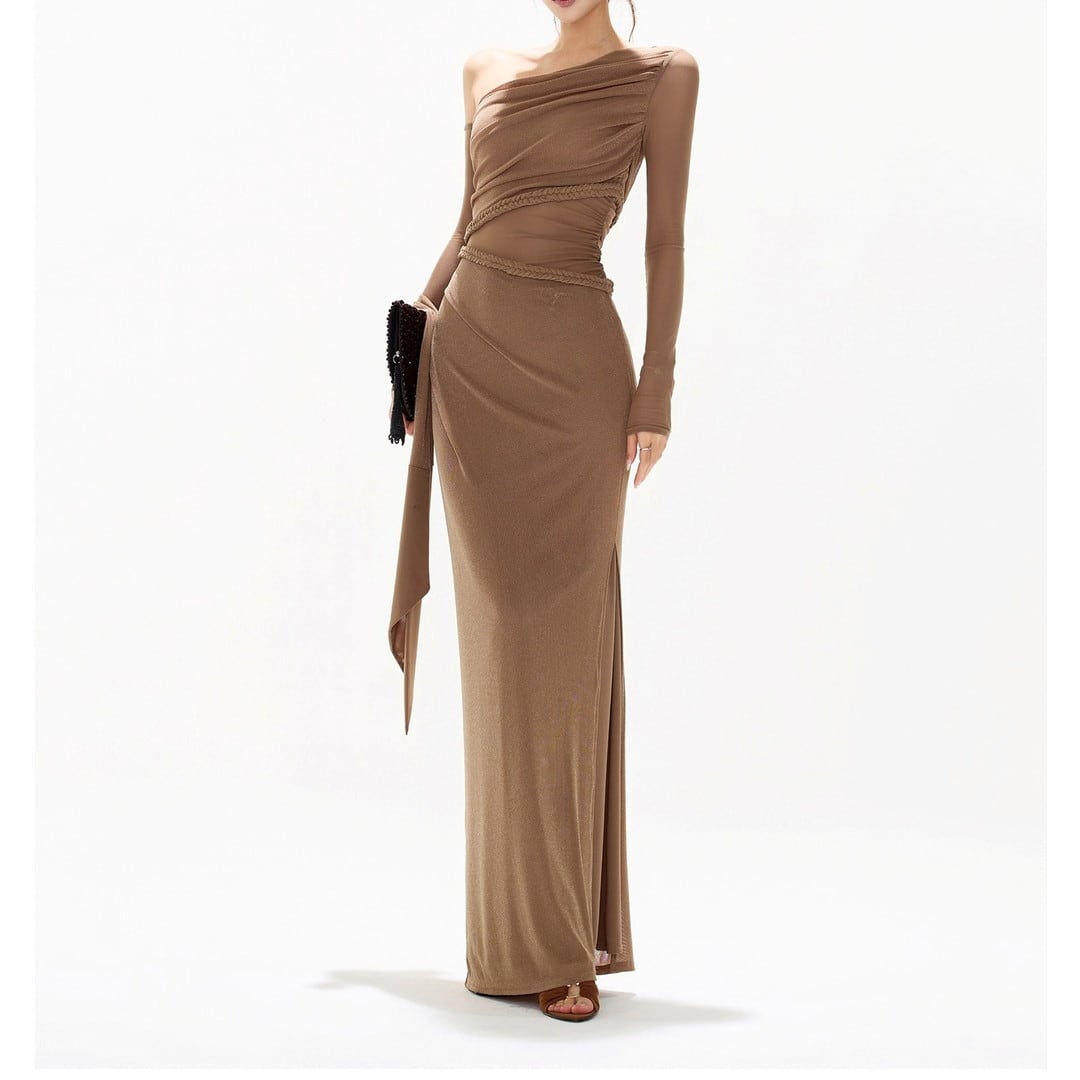 アシンメトリーなデザインが目を引く長袖マキシドレス。特別な日の装いにはもちろん、パーティーシーンにも最適です。程よい肌見せが、大人の女性らしさを演出します。