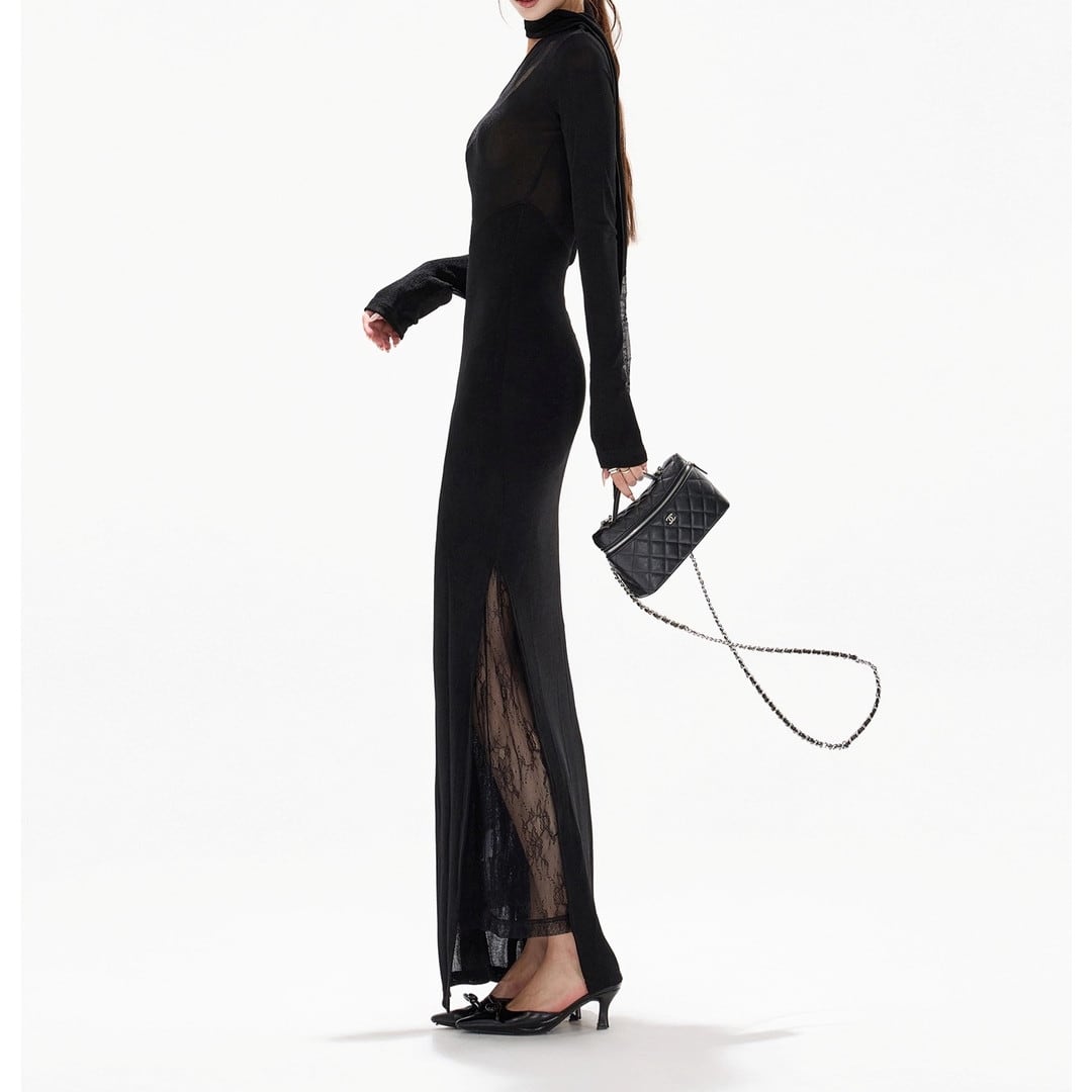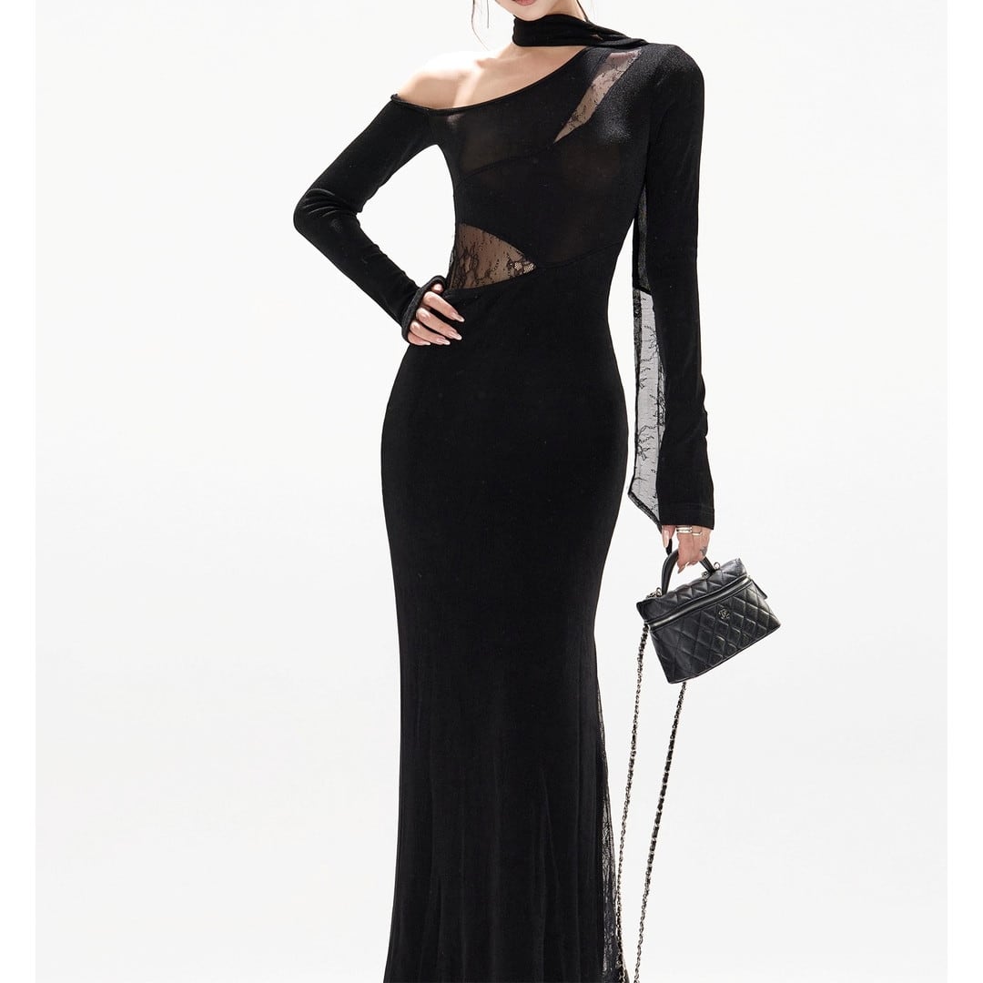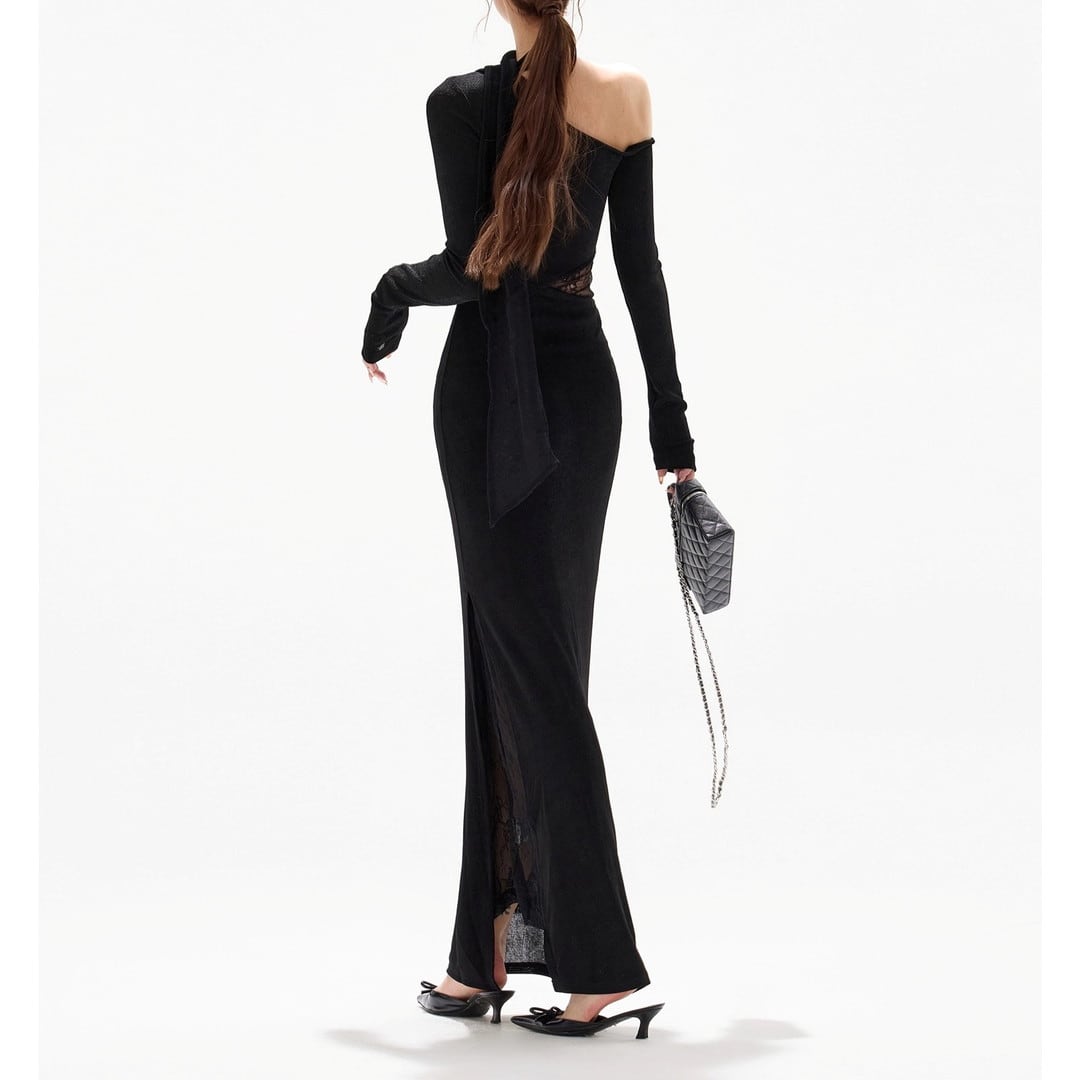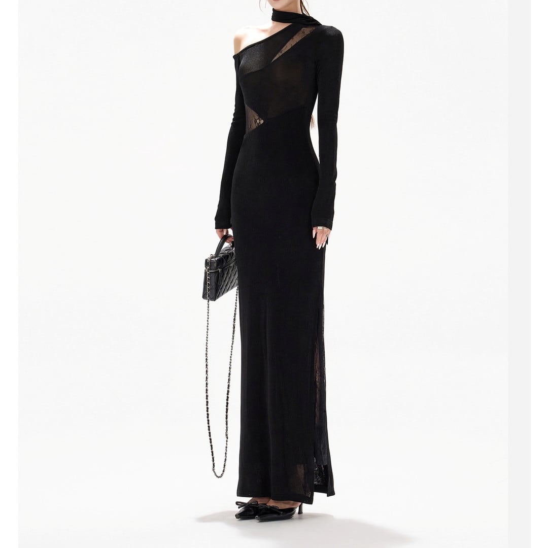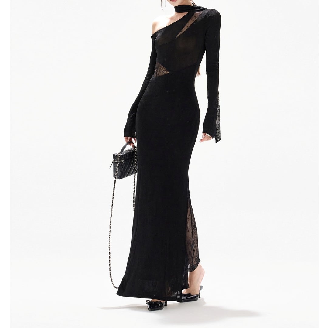 アシンメトリーなデザインが目を引くロングスリーブドレス。大胆なカットとタイトなシルエットが、洗練された大人の女性らしさを演出します。特別な日の装いはもちろん、パーティーシーンにも最適です。