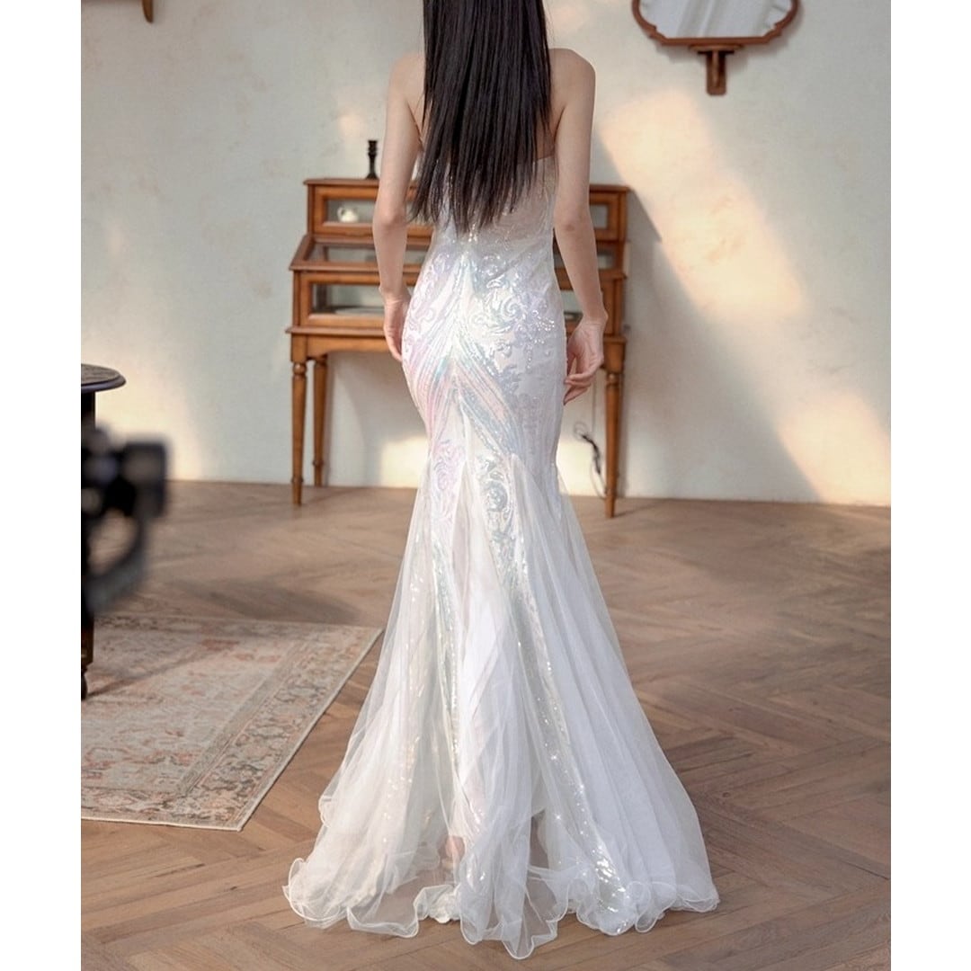 きらびやかなスパンコールが上品な華やかさを演出し、パーティーやイベントなど、特別な夜にふさわしい一着です。