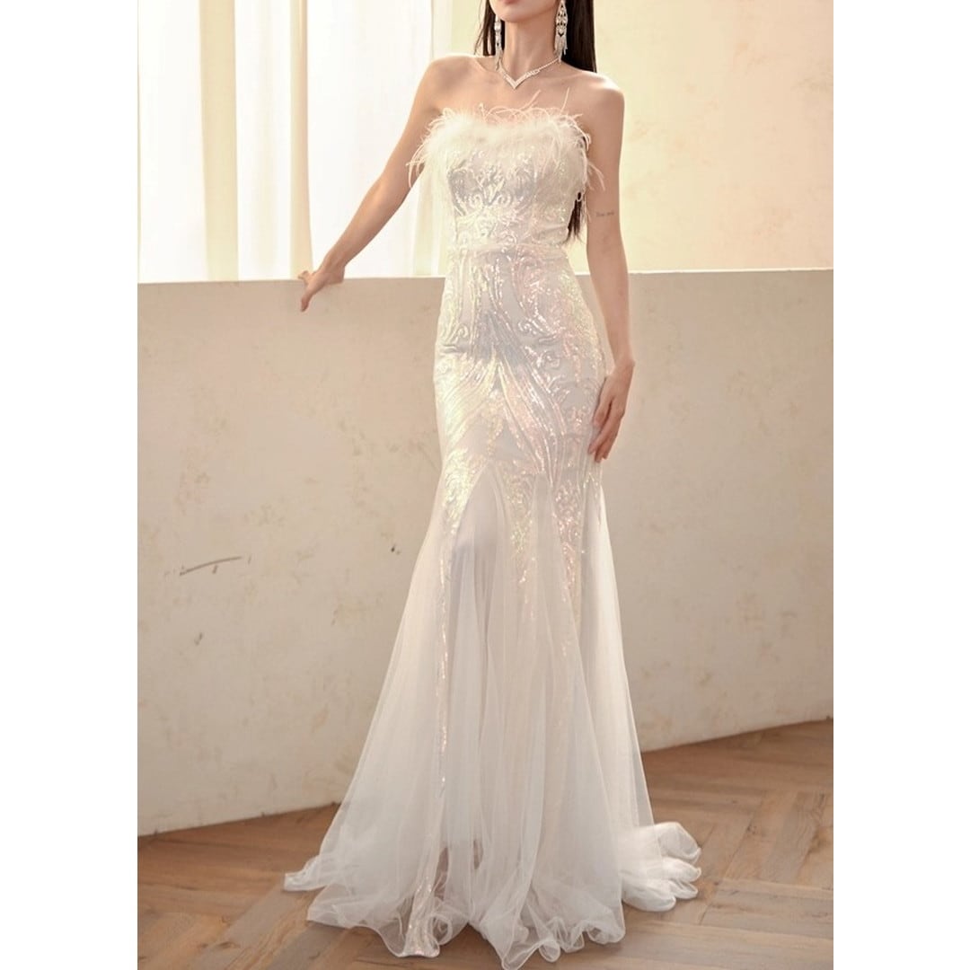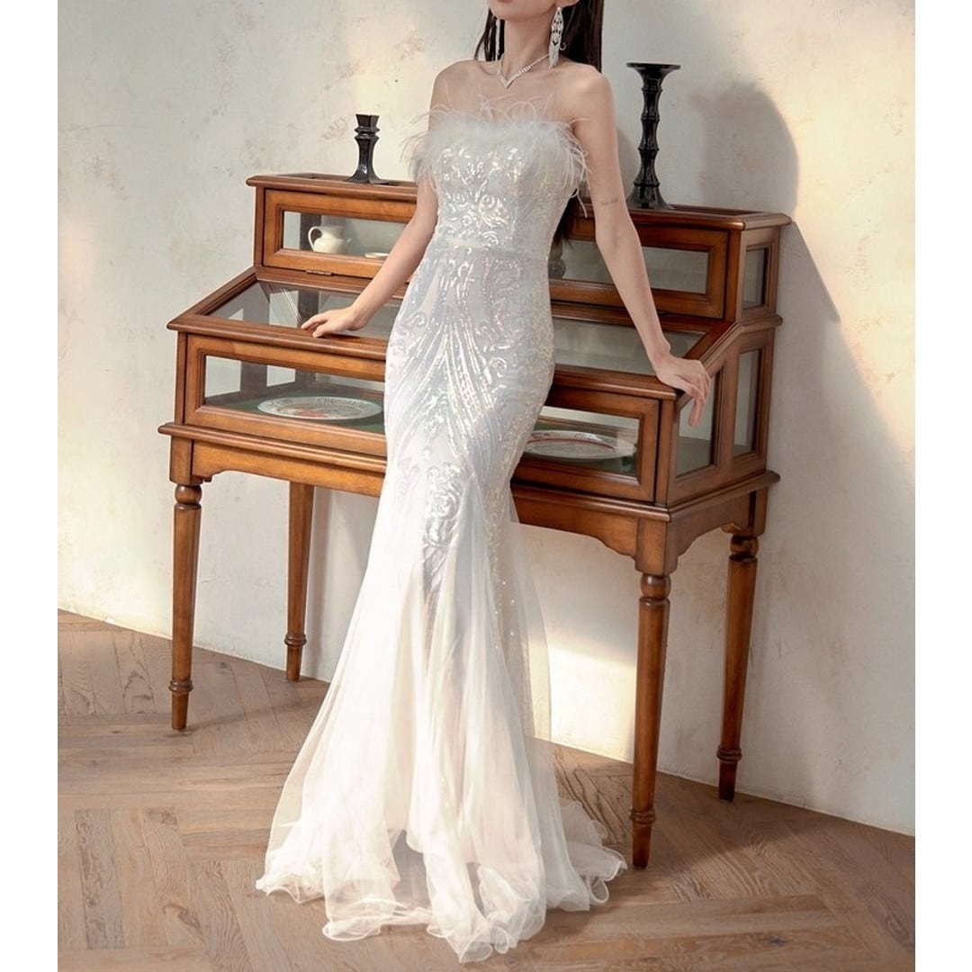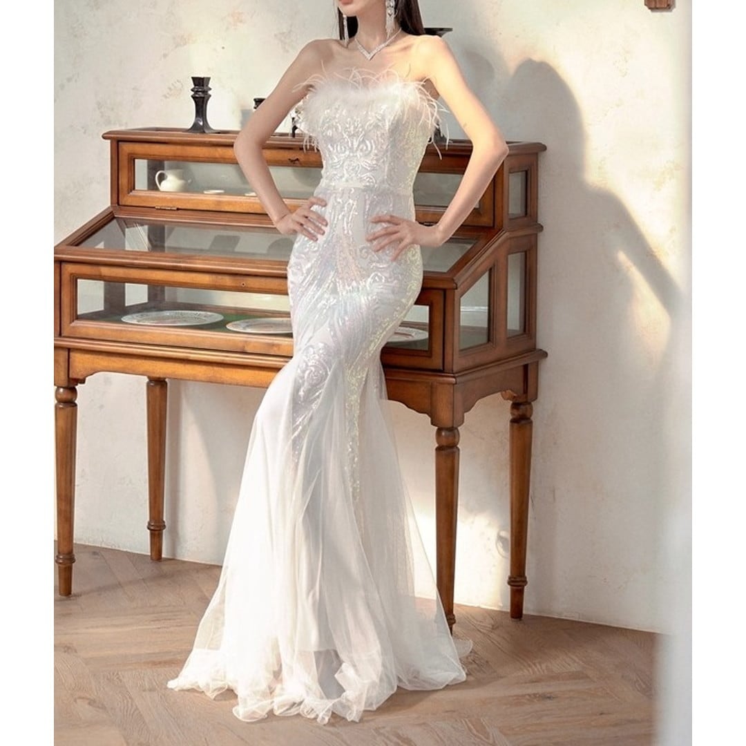 繊細なフェザーをあしらったビスチェと、ボディラインに沿うマーメイドシルエットが美しいイブニングドレスです。