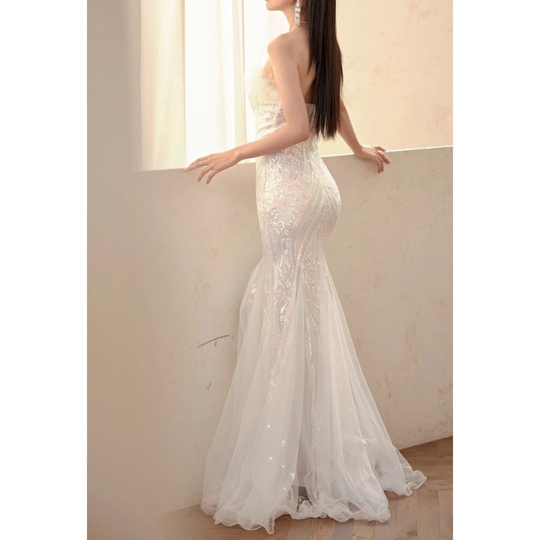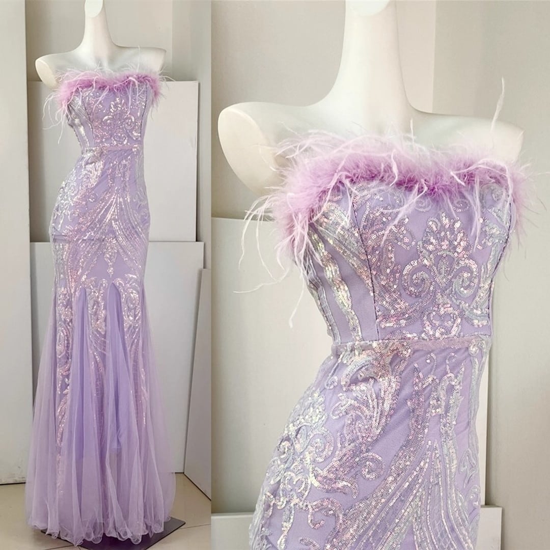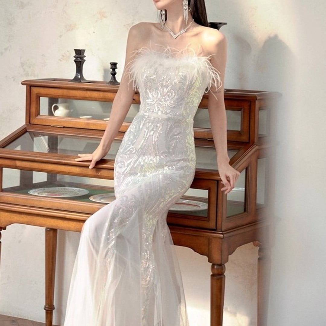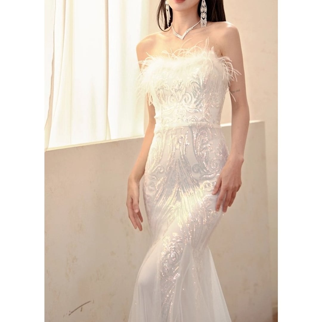 繊細なフェザーをあしらったビスチェと、ボディラインに沿うマーメイドシルエットが美しいイブニングドレスです。