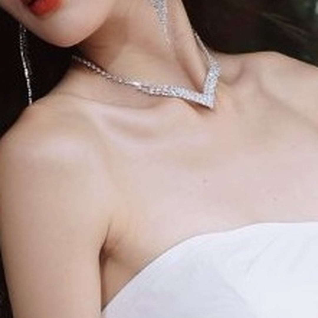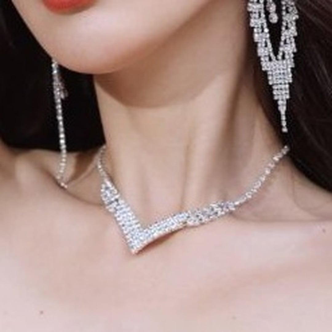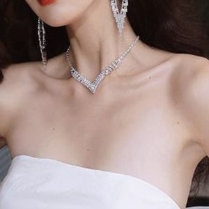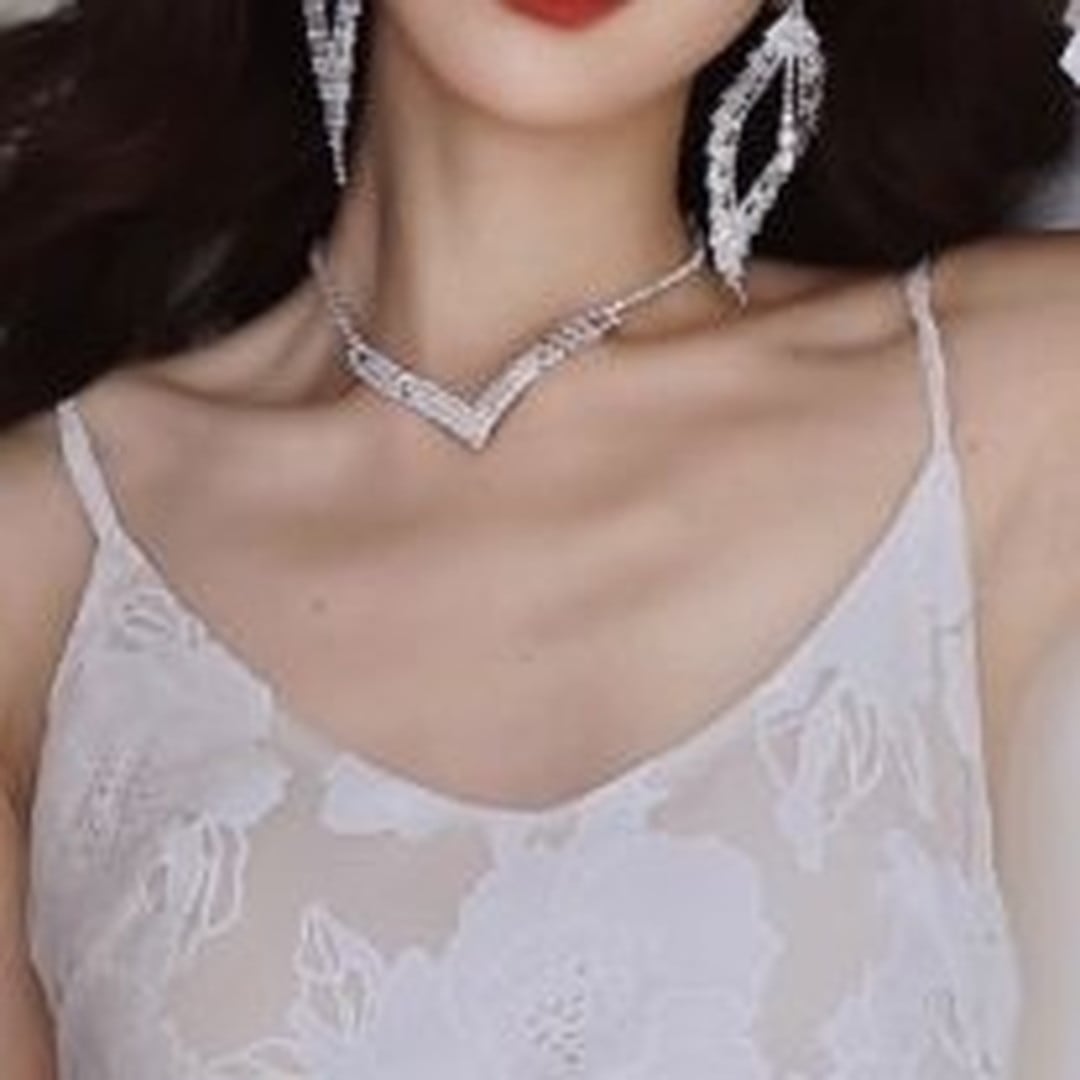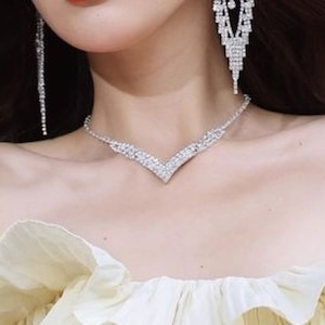 胸元を華やかに飾る、Y字型ネックレス。繊細なストーンが連なり、上品な輝きを放ちます。シンプルな装いにはもちろん、パーティーシーンなど華やかな場にもおすすめです。首元をすっきりと見せ、洗練された印象を与えます。