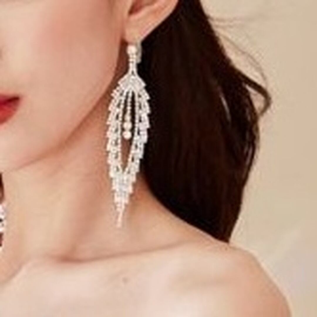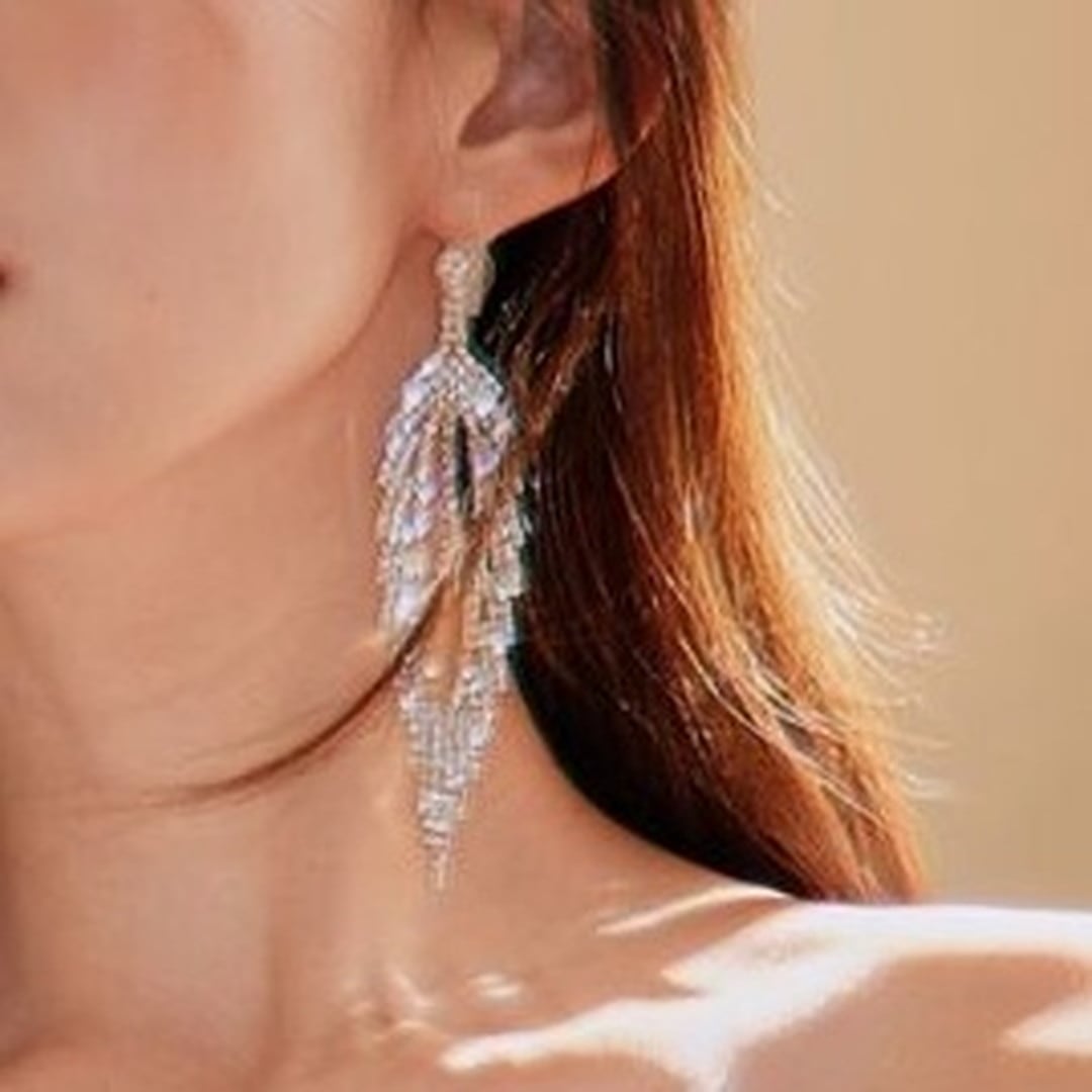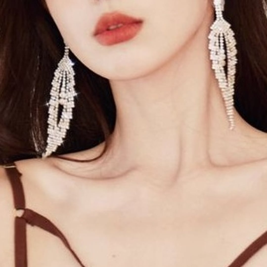 繊細な輝きを放つ、ドロップタイプのロングイヤリング。フェザーのようなデザインが、顔周りを華やかに彩ります。パーティーシーンはもちろん、普段使いにもアクセントとして取り入れやすいアイテムです。動くたびに優雅に揺れ、視線を捉えて、より一層美しさを引き立てます。