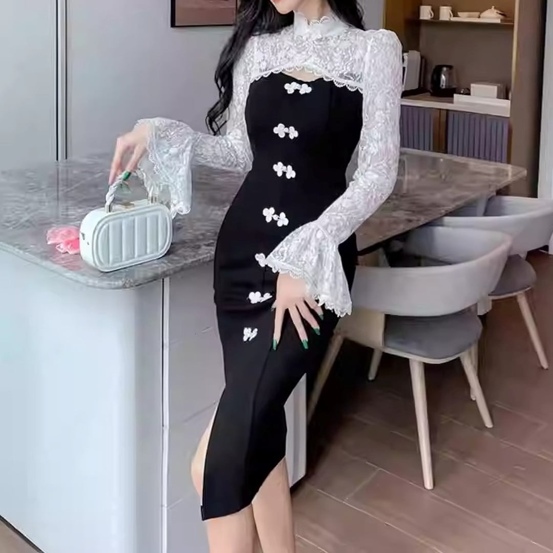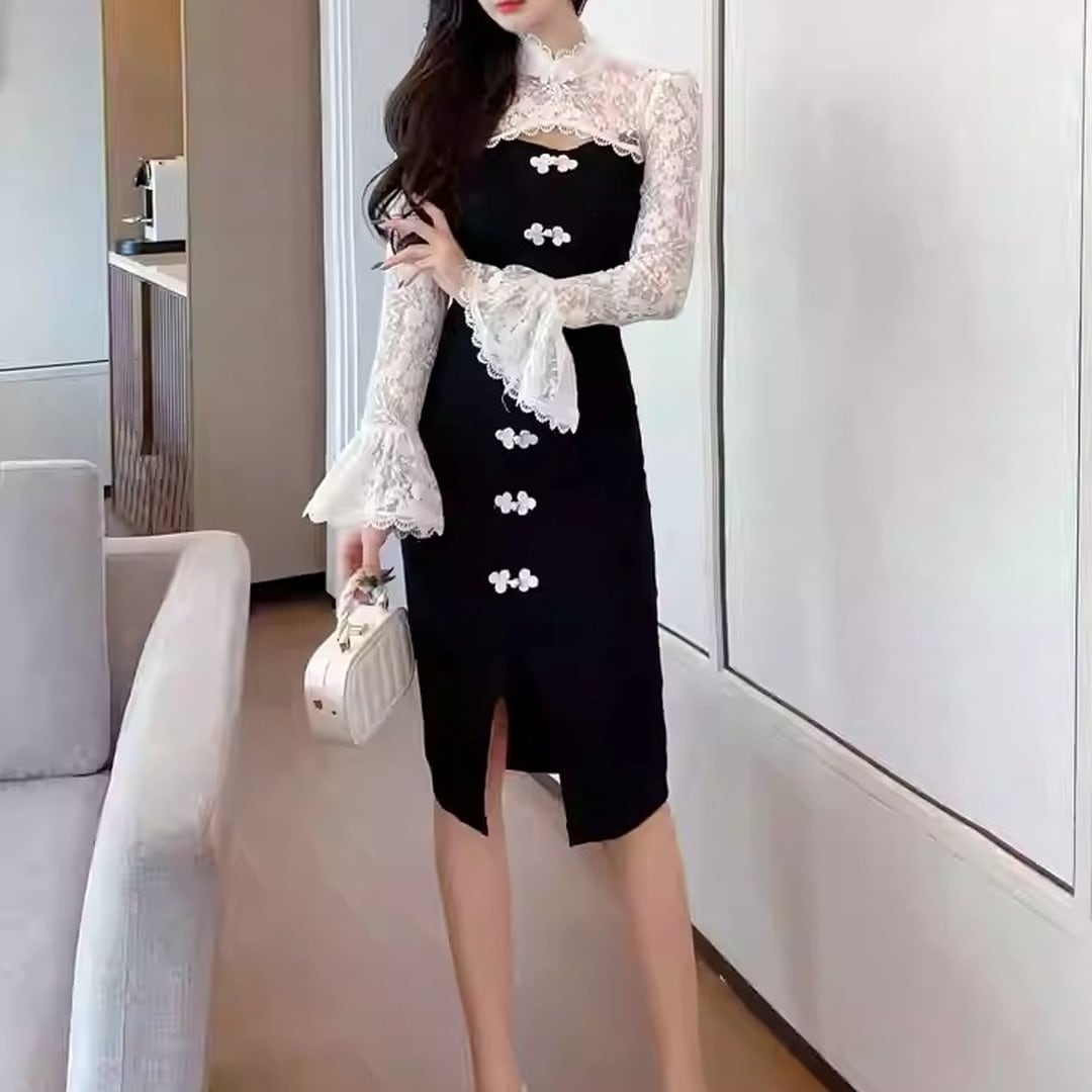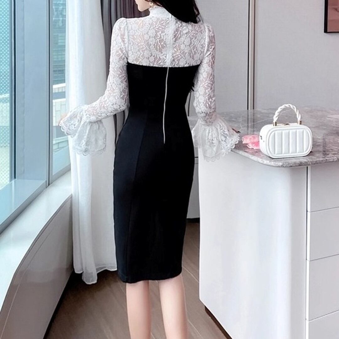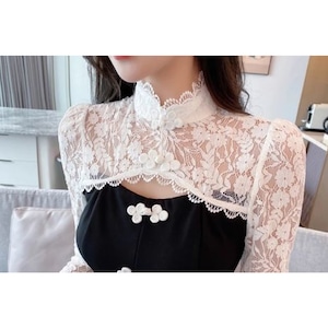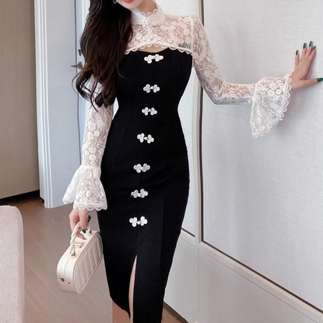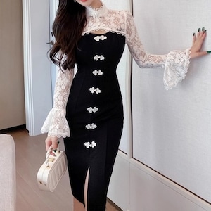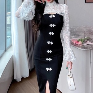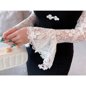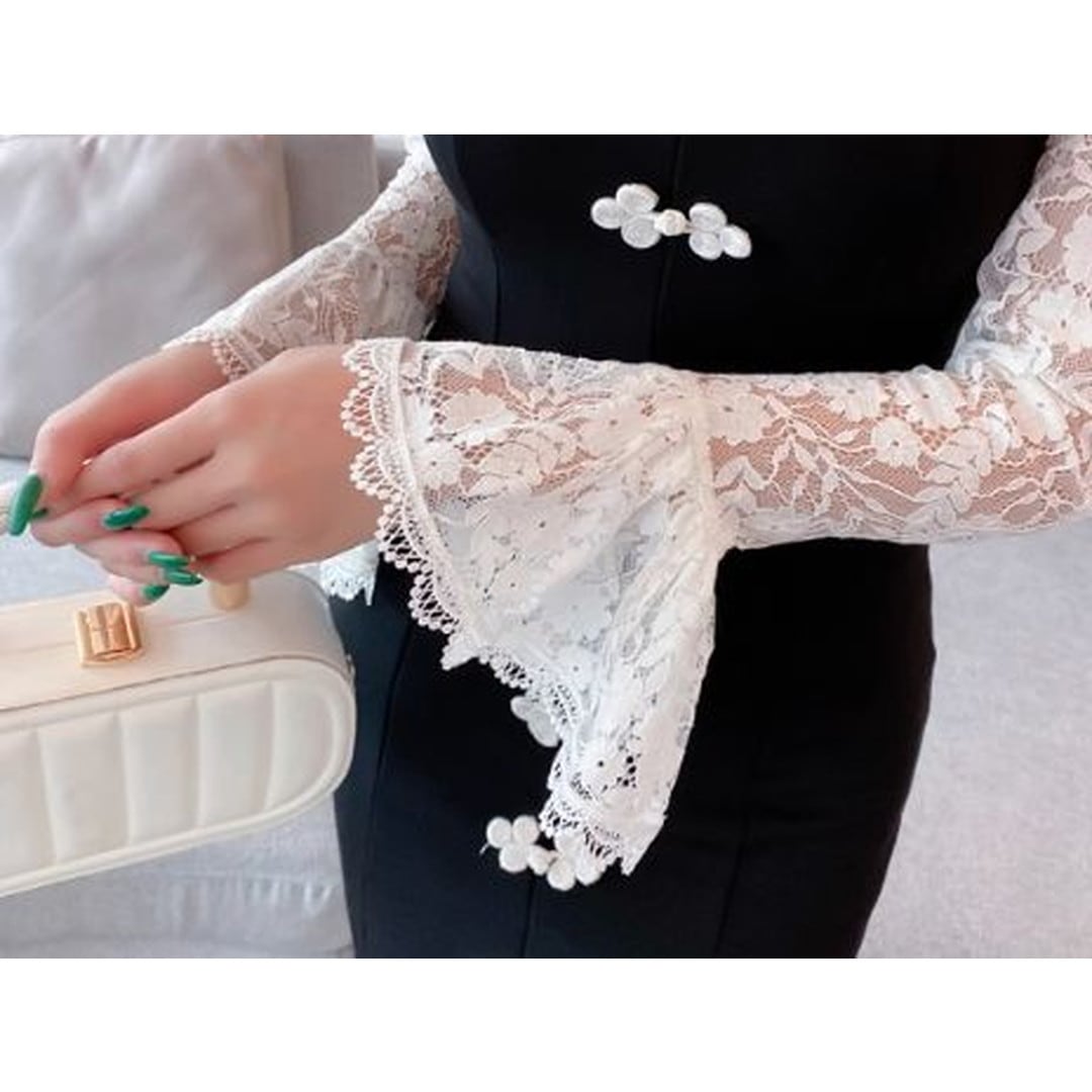 繊細なレースと、全体を上品にまとめるミディ丈が魅力的な一着。