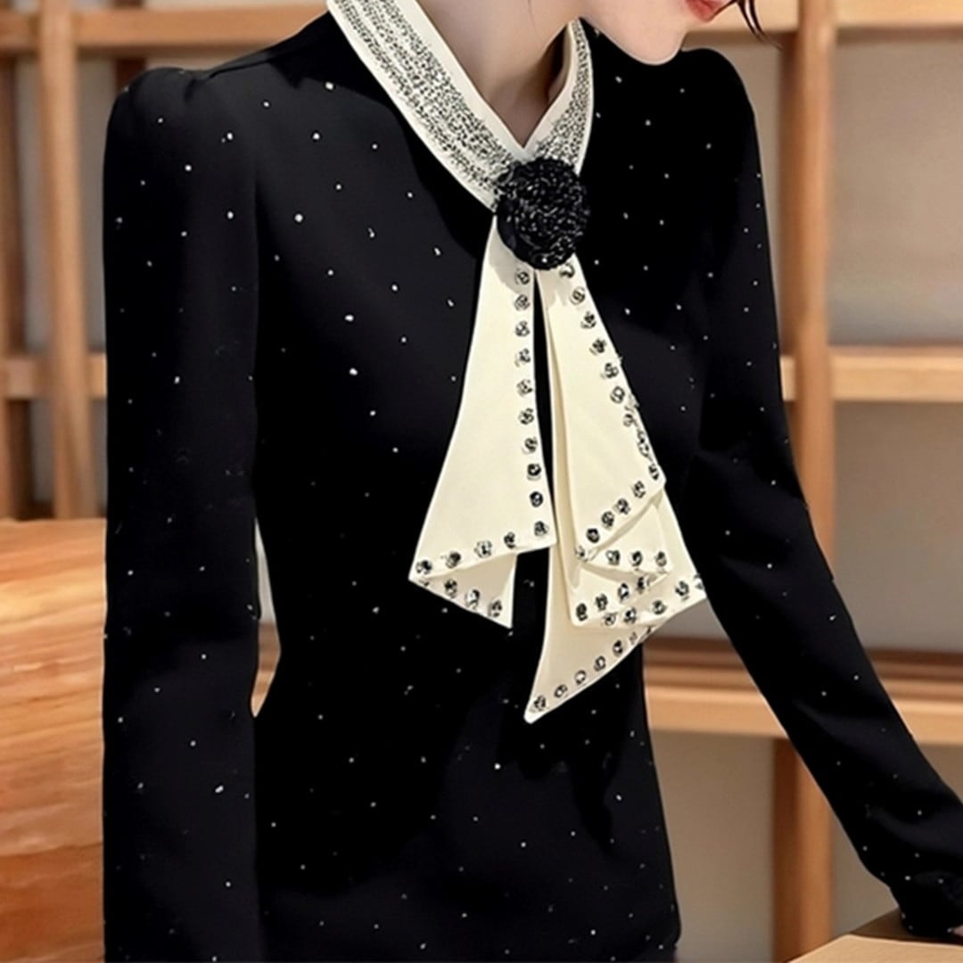 襟元のリボンタイがアクセントの長袖ブラウス。オフィススタイルにはもちろん、少しフォーマルな場面にも活躍します。上品なデザインで、大人の女性らしさを演出。