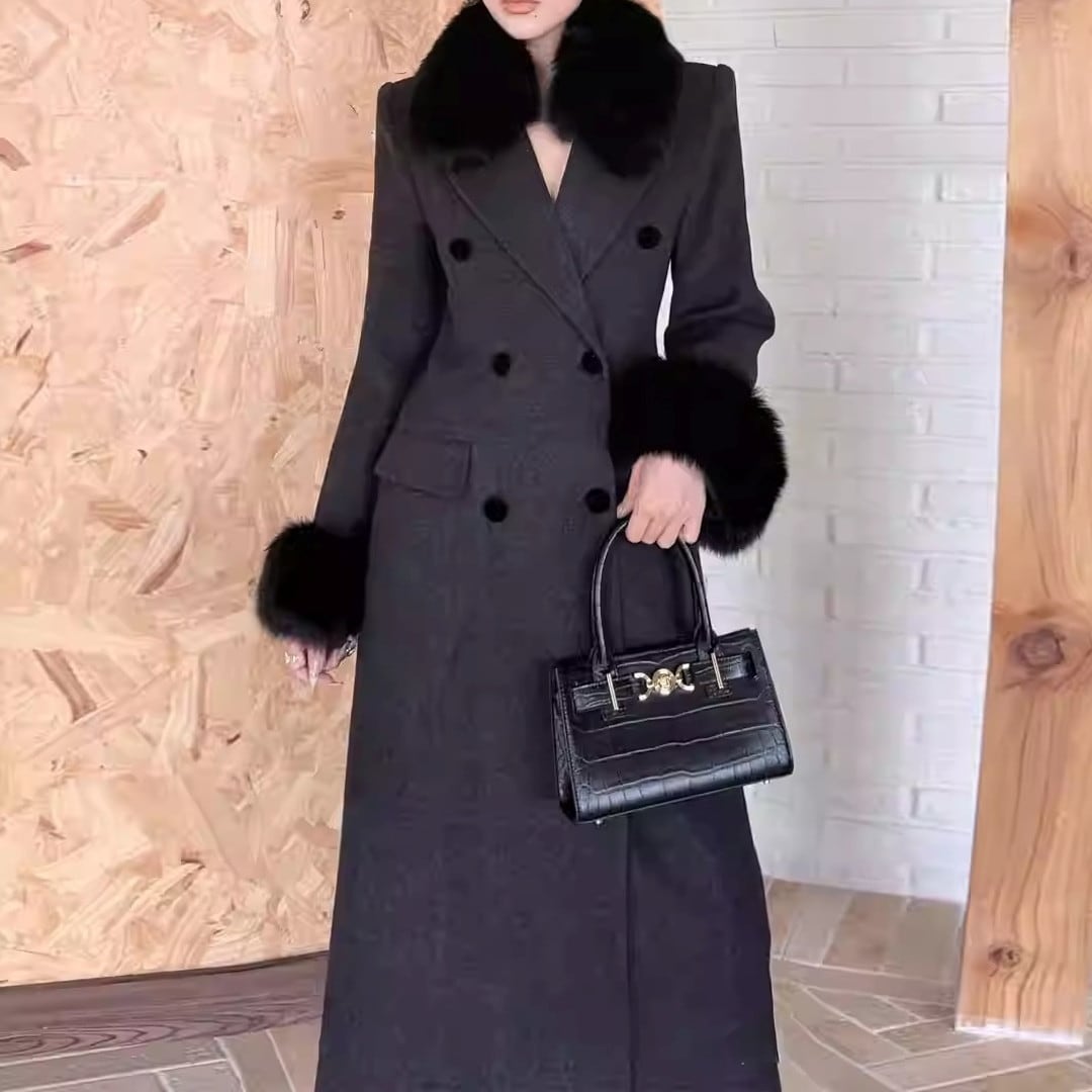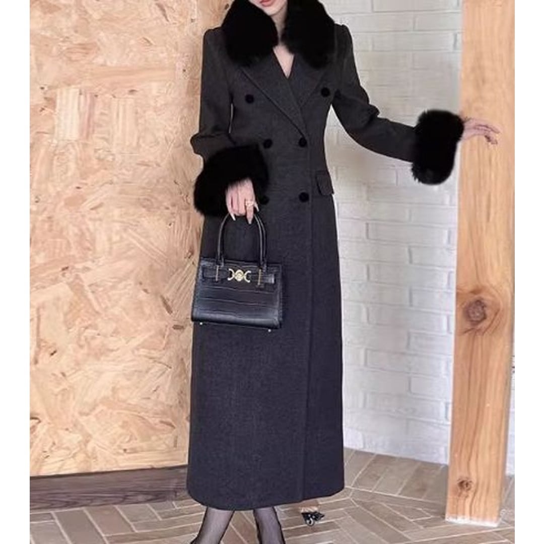 ファーの襟と袖口がアクセントとなり、上品な雰囲気を演出します。