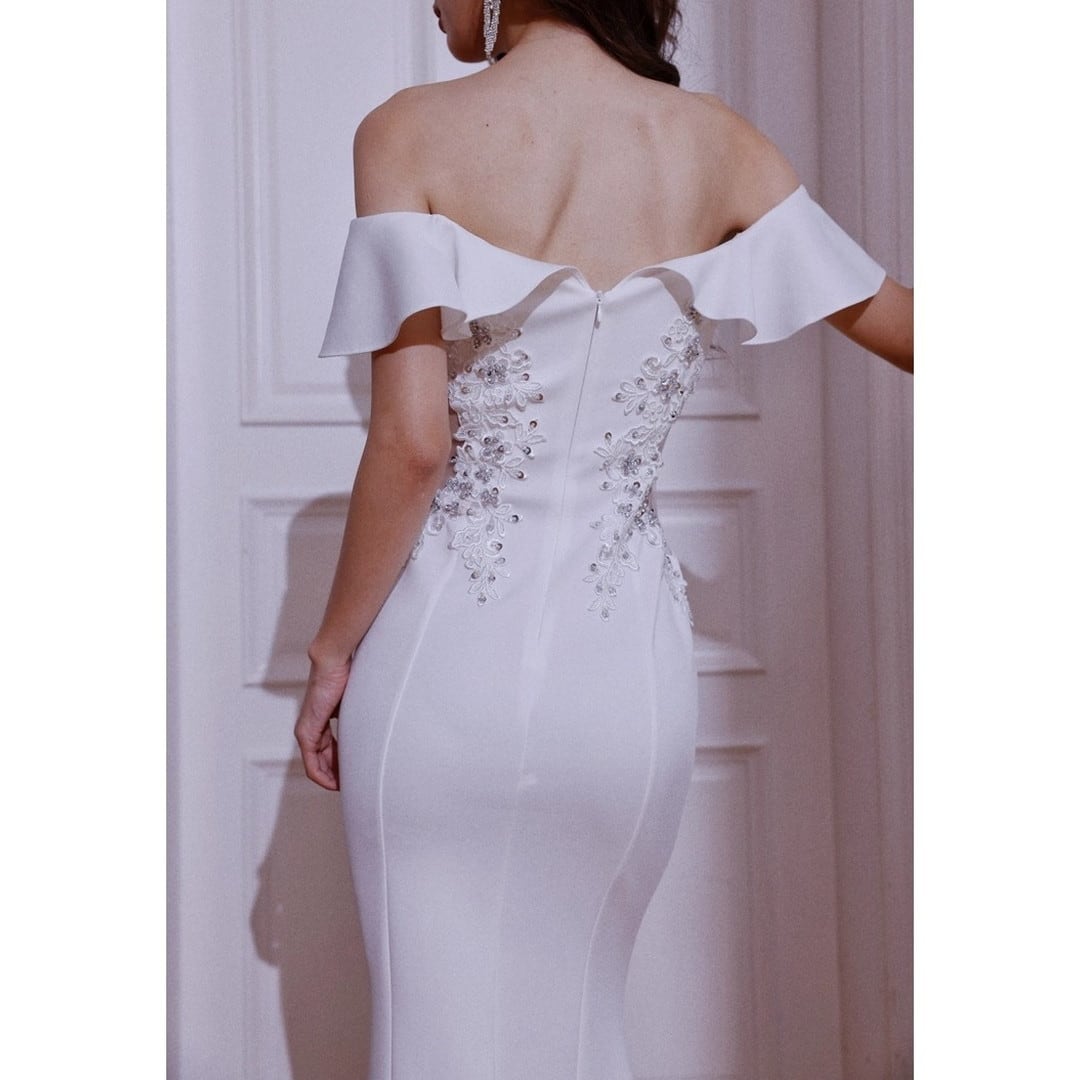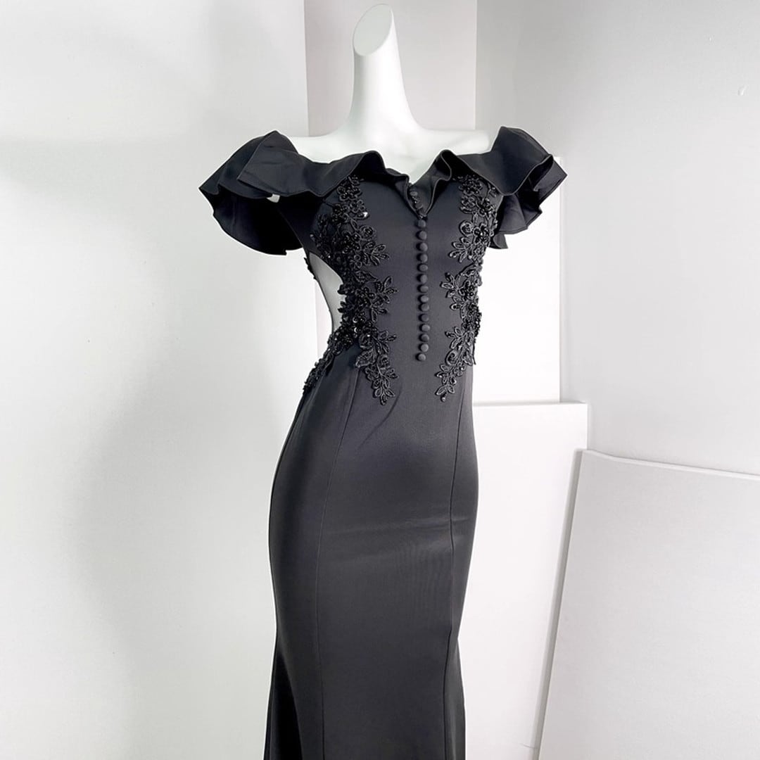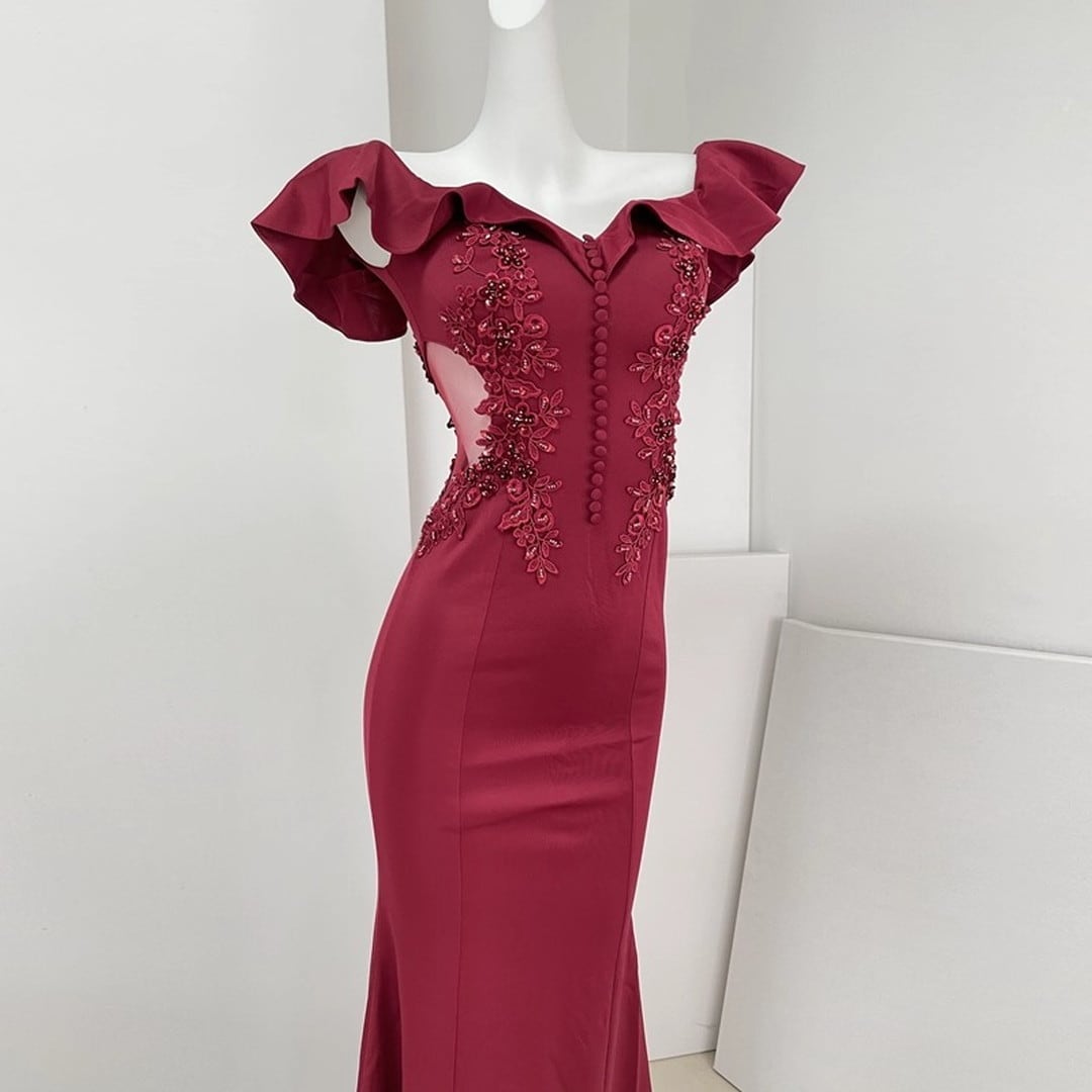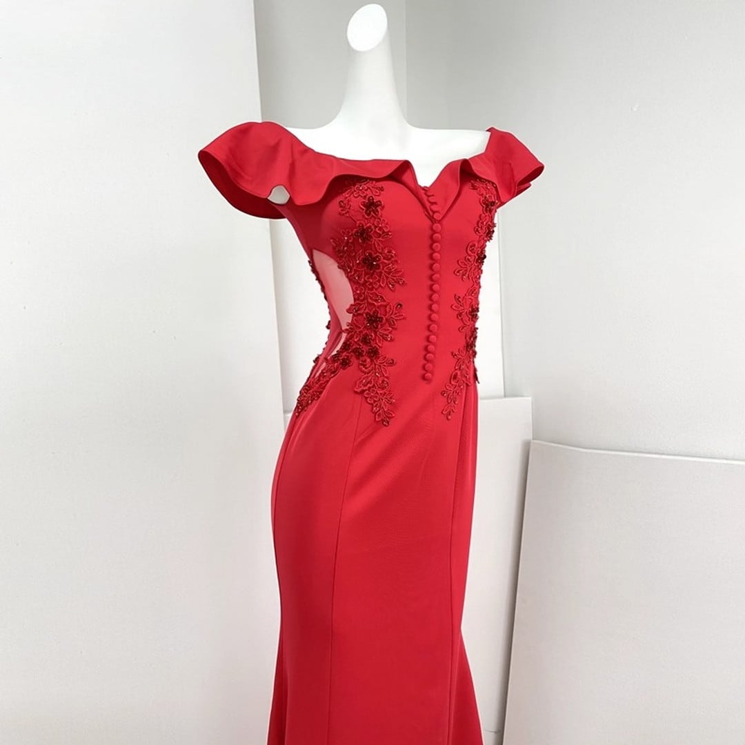 オフショルダーデザインがデコルテを美しく演出し、優雅な印象を与えるロングドレス。フリルがフェミニンな雰囲気をプラスし、マーメイドラインがボディラインを美しく引き立てます。特別な日のパーティーやイベントに最適な一着です。