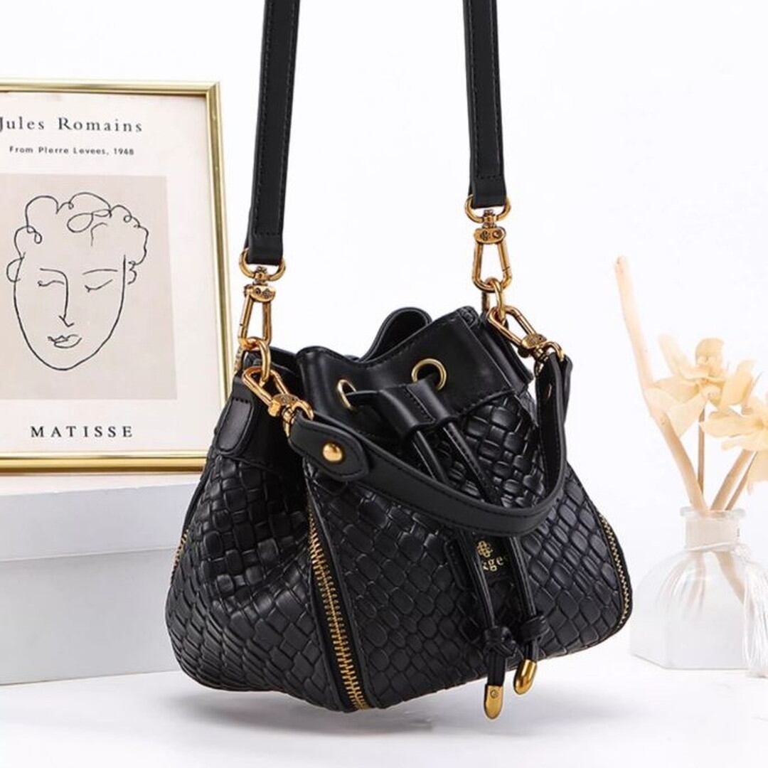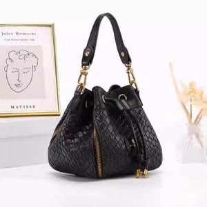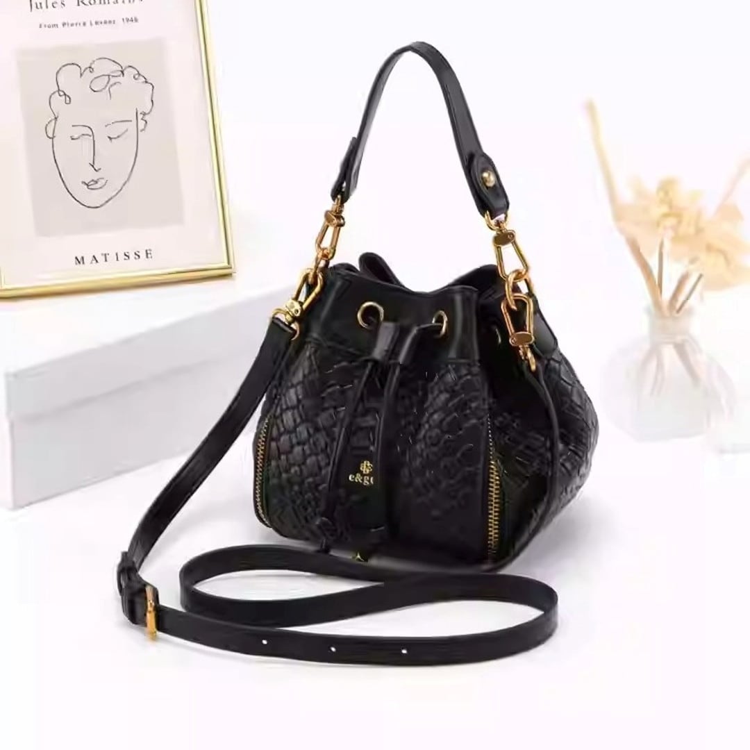 普段使いに最適な、ドローストリングタイプのフェイクレザーハンドバッグです。
