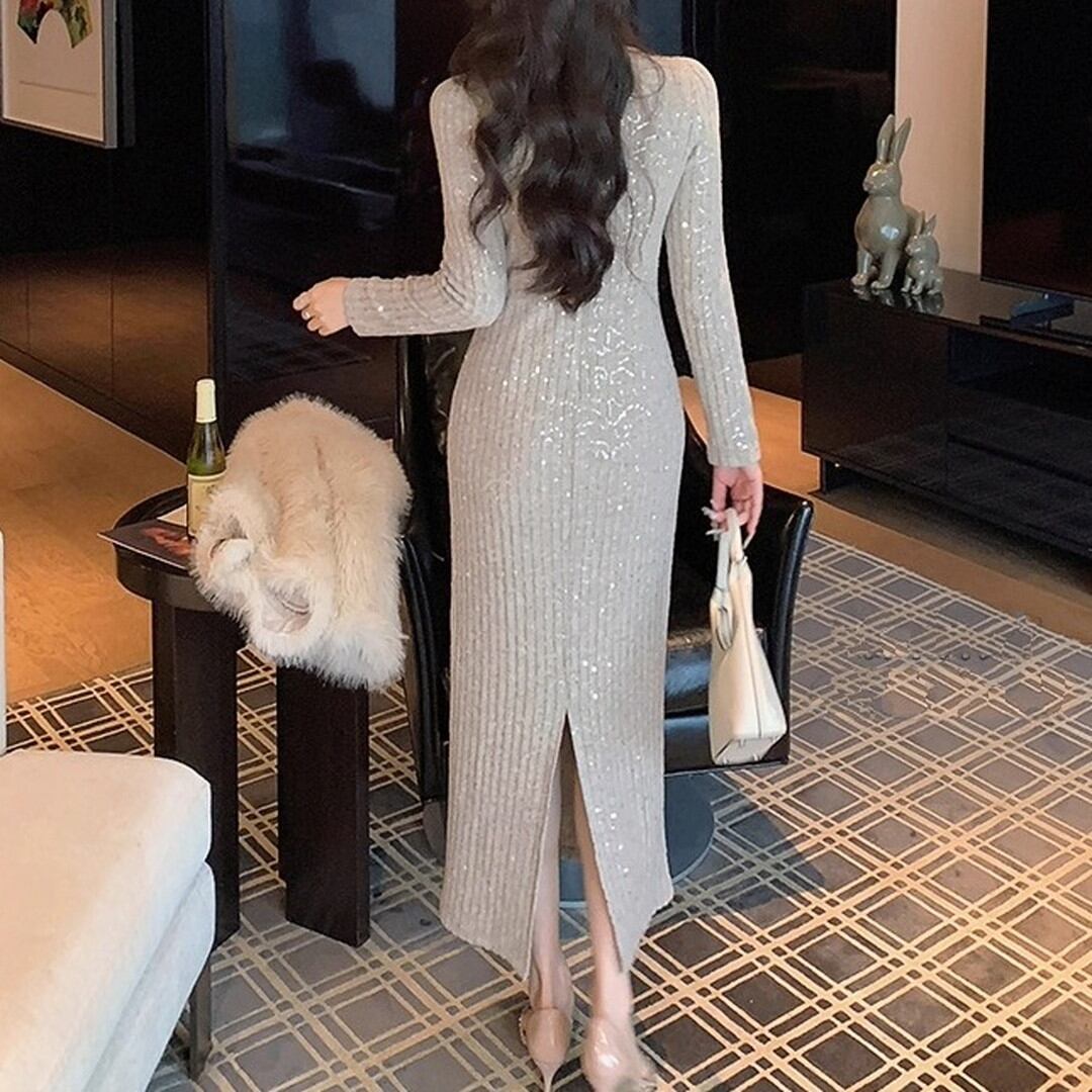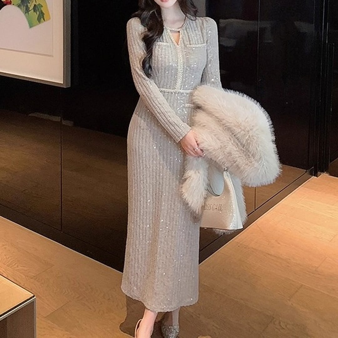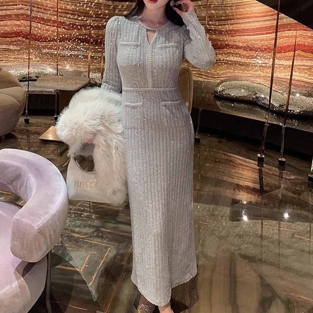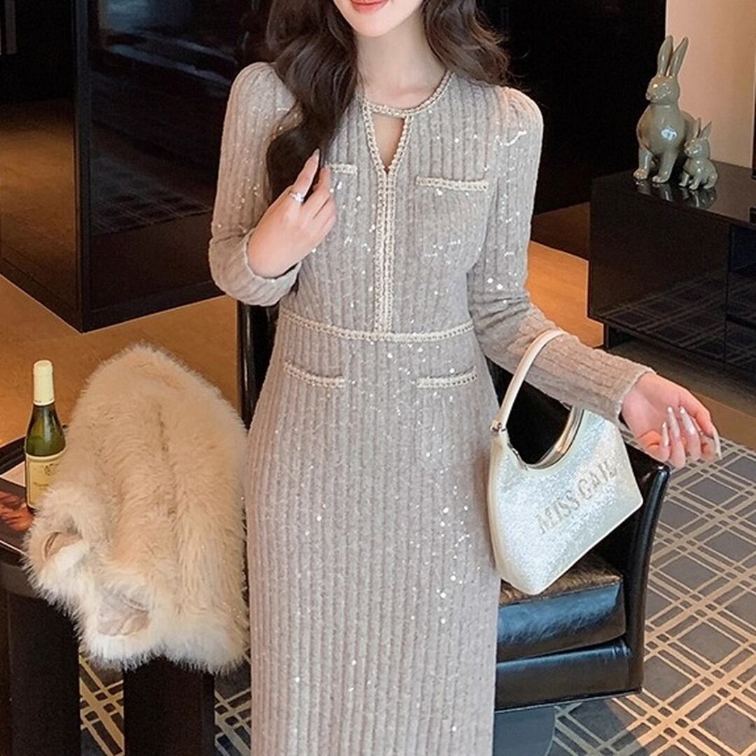 上品な印象を与える、長袖ミディ丈タイトドレス。縦のラインを強調するデザインで、スタイルアップ効果も期待できます。落ち着いた色合いと控えめな装飾が、洗練された大人の女性らしさを演出。ちょっとしたお出かけや、レストランでのお食事など、様々なシーンで活躍します。
