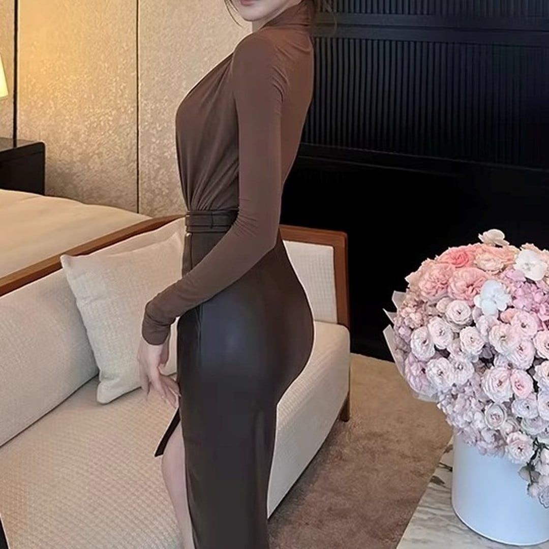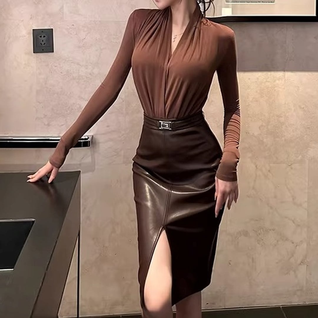 深めのVネックがデコルテを美しく見せる長袖ボディスーツ。オフィスでのきちんと感のあるスタイリングから、夜のデートまで、幅広いシーンで活躍します。ボトムスにインすることで、ウエスト周りをすっきりと見せ、スタイルアップ効果も期待できます。