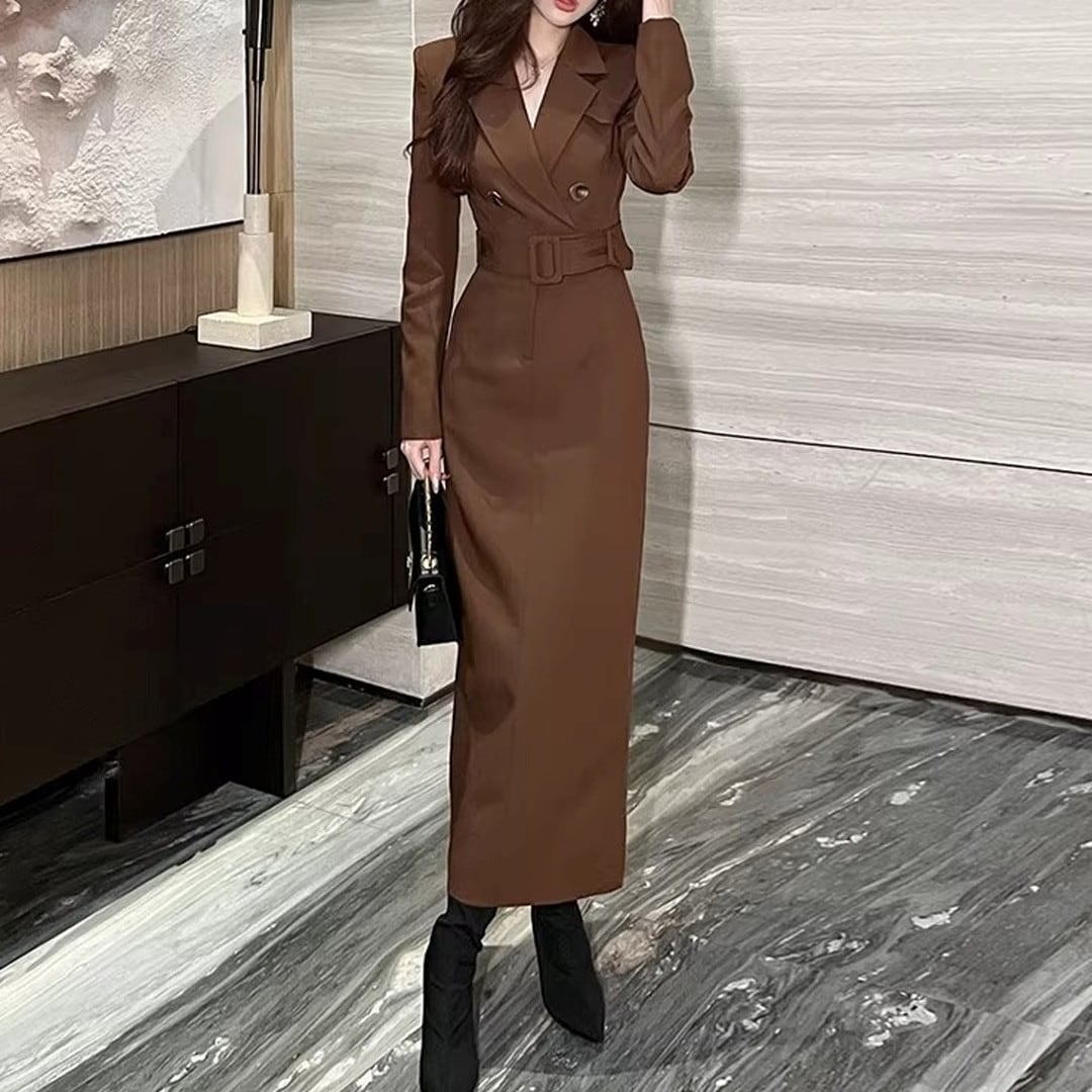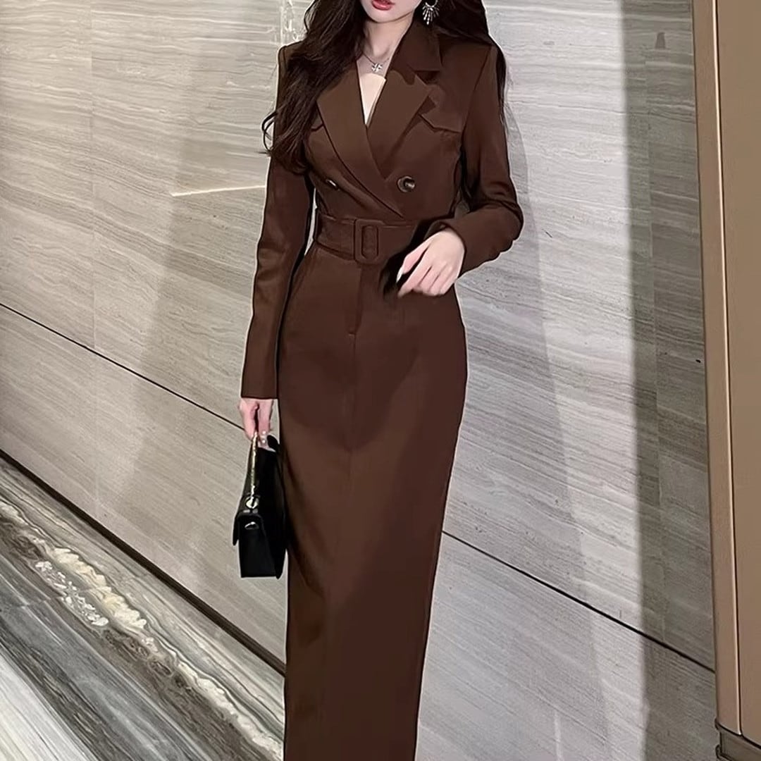 ダブルブレストのデザインが目を引く、洗練された印象のマキシドレス。共布のベルトがウエストマークとなり、スタイルアップ効果も期待できます。オフィスでのビジネスシーンはもちろん、アクセサリーをプラスすれば、パーティーやイベントにも対応できる汎用性の高い一着です。