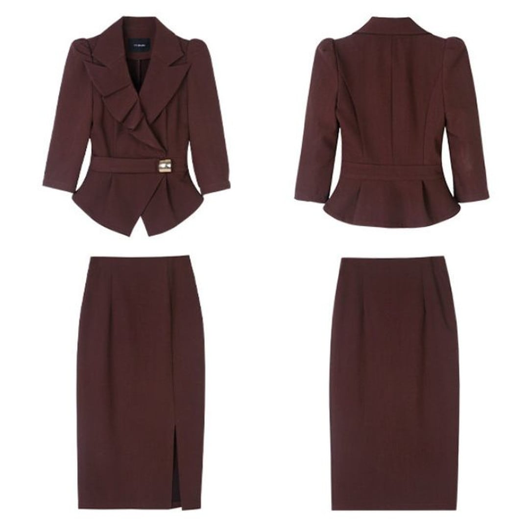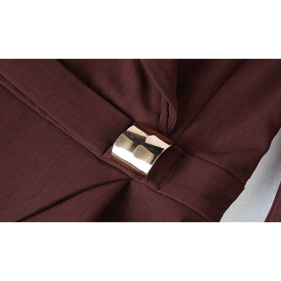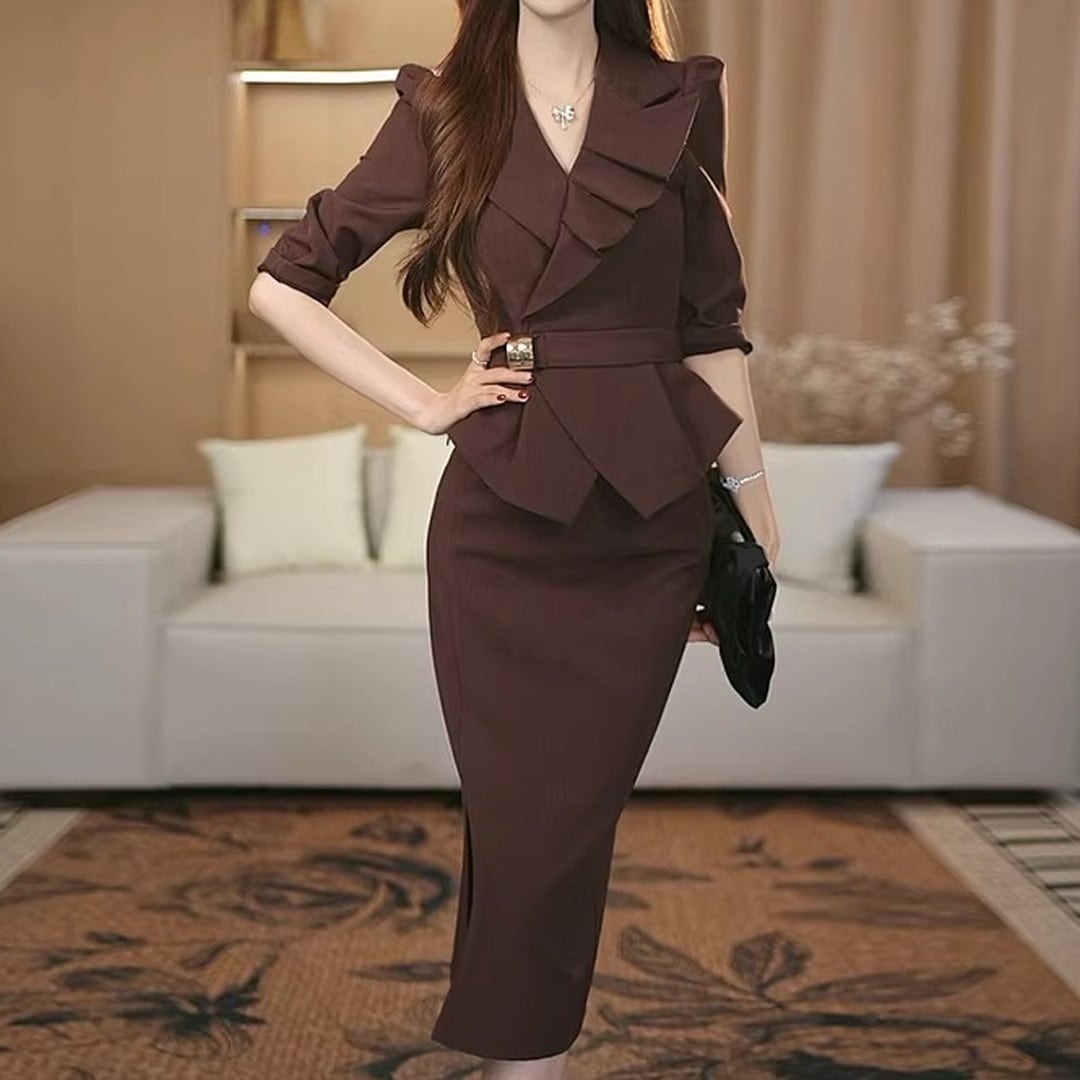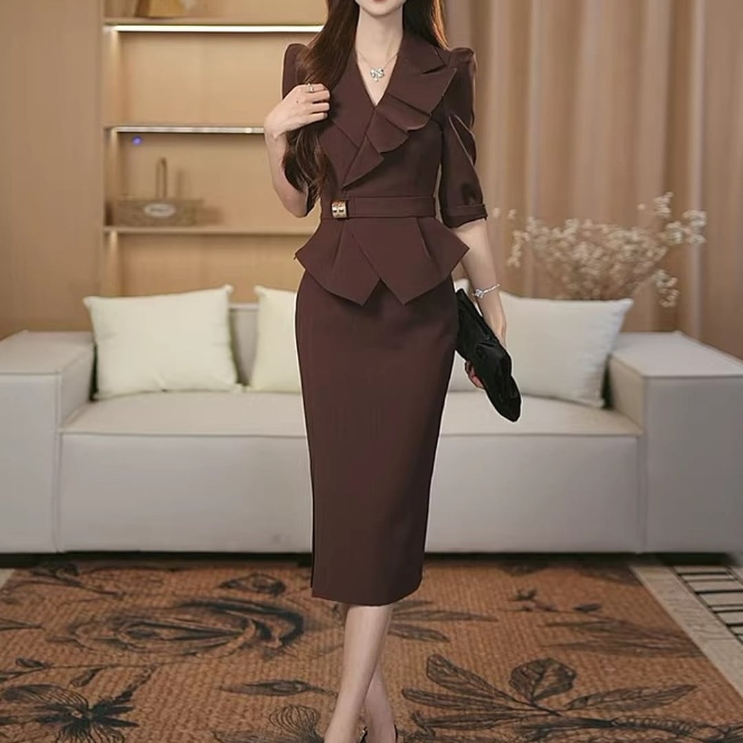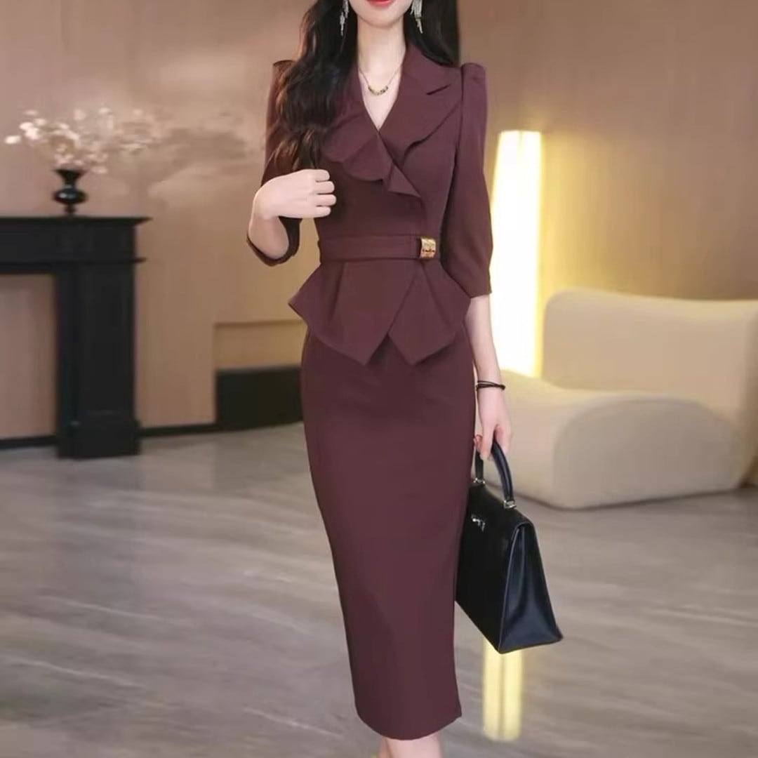 フリルのトリムがアクセントになった、七分袖のミディ丈ドレスです。付属のベルトでウエストマークすることで、スタイルアップ効果も期待できます。オフィスでの着用はもちろん、ちょっとしたお食事会などにもおすすめです。上品で落ち着いた印象を与えます。
