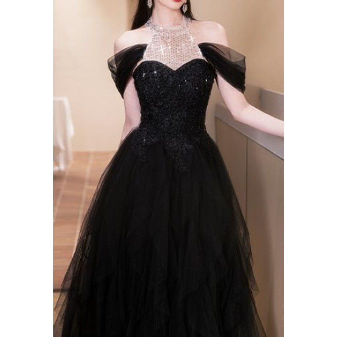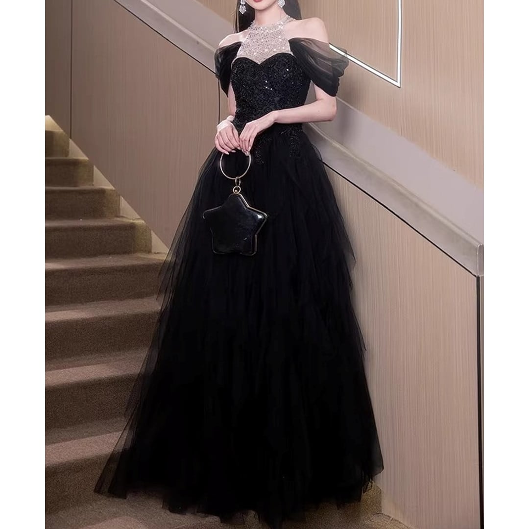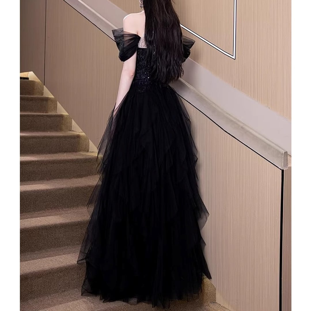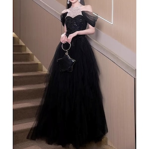 特別な夜にふさわしい、洗練されたオフショルダーのマキシ丈イブニングドレス。デコルテを美しく見せるオフショルダーデザインと、上品な透け感のある素材が、大人の女性らしさを引き立てます。パーティーや結婚式など、華やかなシーンで存在感を放ち、周囲の視線を釘付けにすることでしょう。