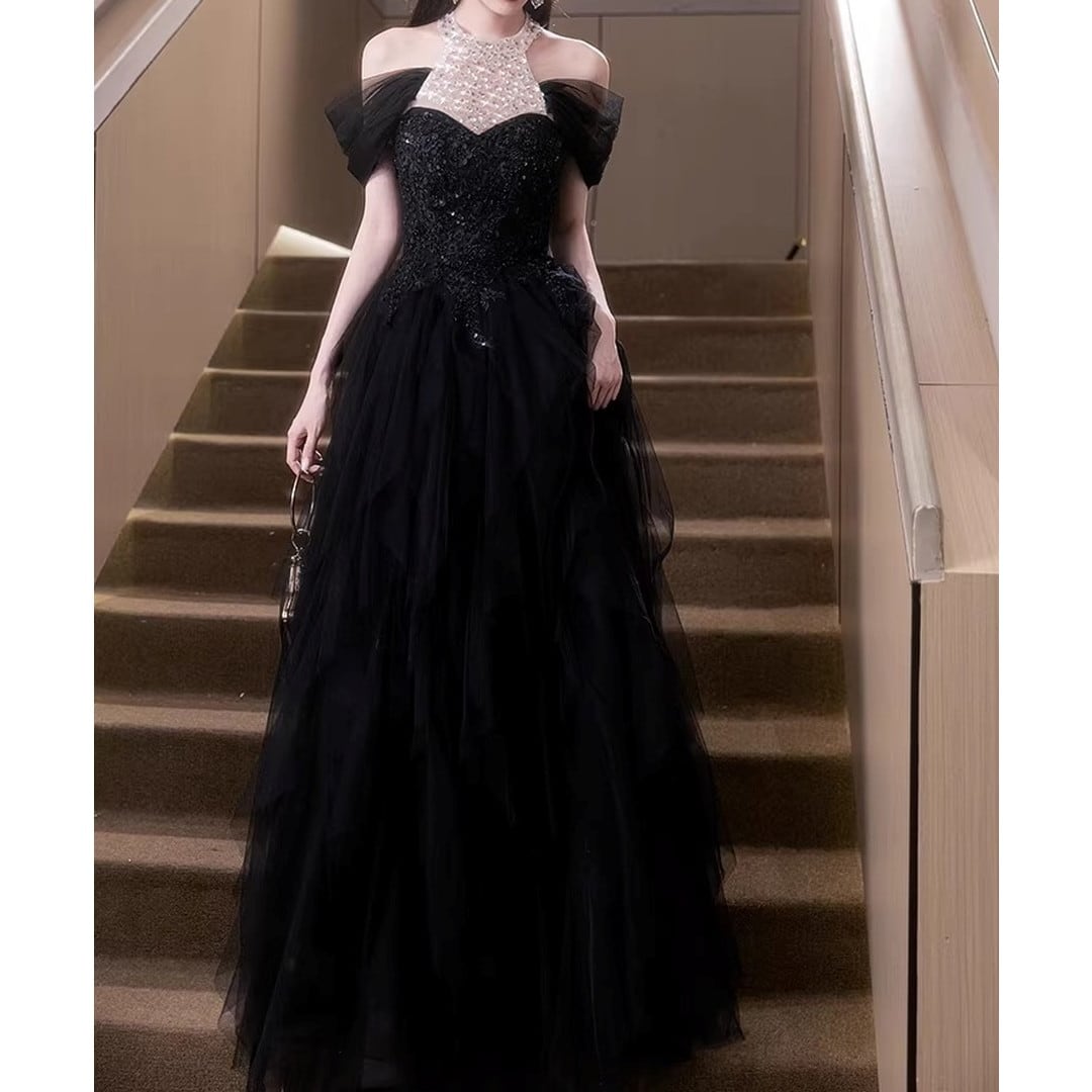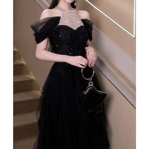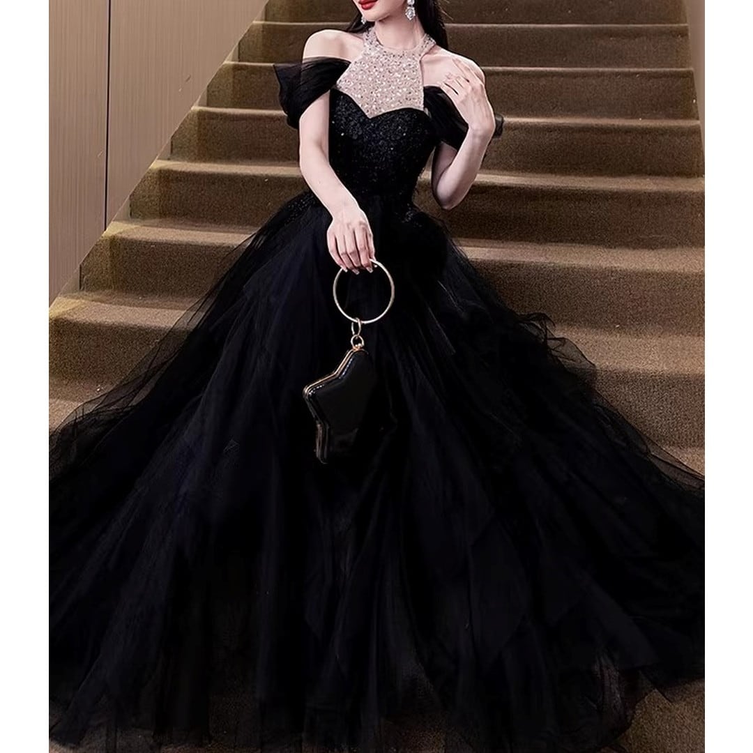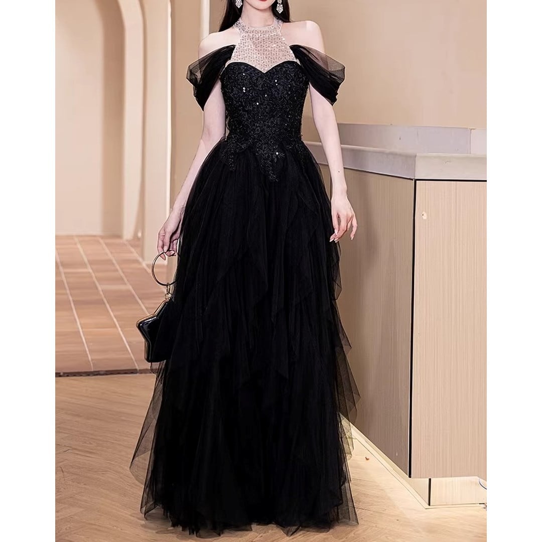 特別な夜にふさわしい、洗練されたオフショルダーのマキシ丈イブニングドレス。デコルテを美しく見せるオフショルダーデザインと、上品な透け感のある素材が、大人の女性らしさを引き立てます。パーティーや結婚式など、華やかなシーンで存在感を放ち、周囲の視線を釘付けにすることでしょう。