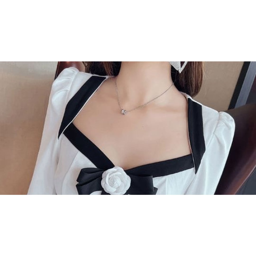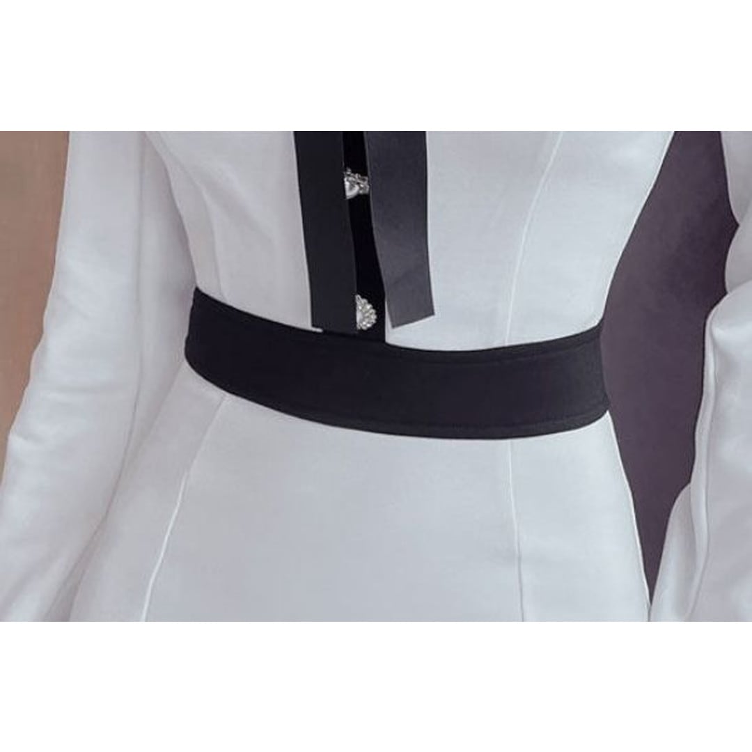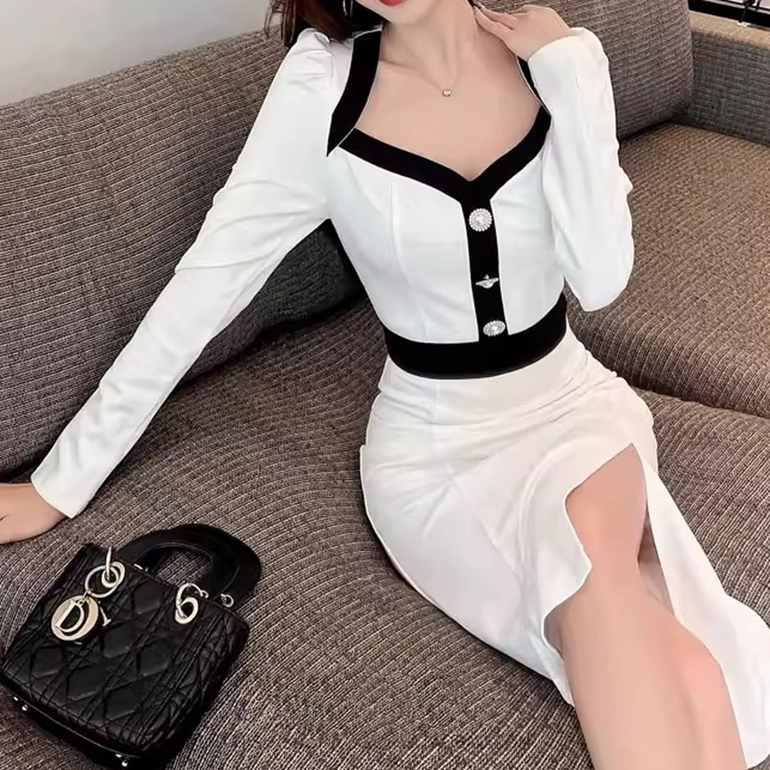 リボンとバイカラーの配色が目を引くミディ丈のドレス。長袖なので、ちょっとしたレストランでのお食事や、お呼ばれなどのフォーマルなシーンにもぴったり。スリットが入っているので、足さばきが良く、上品さの中にも動きやすさをプラス。