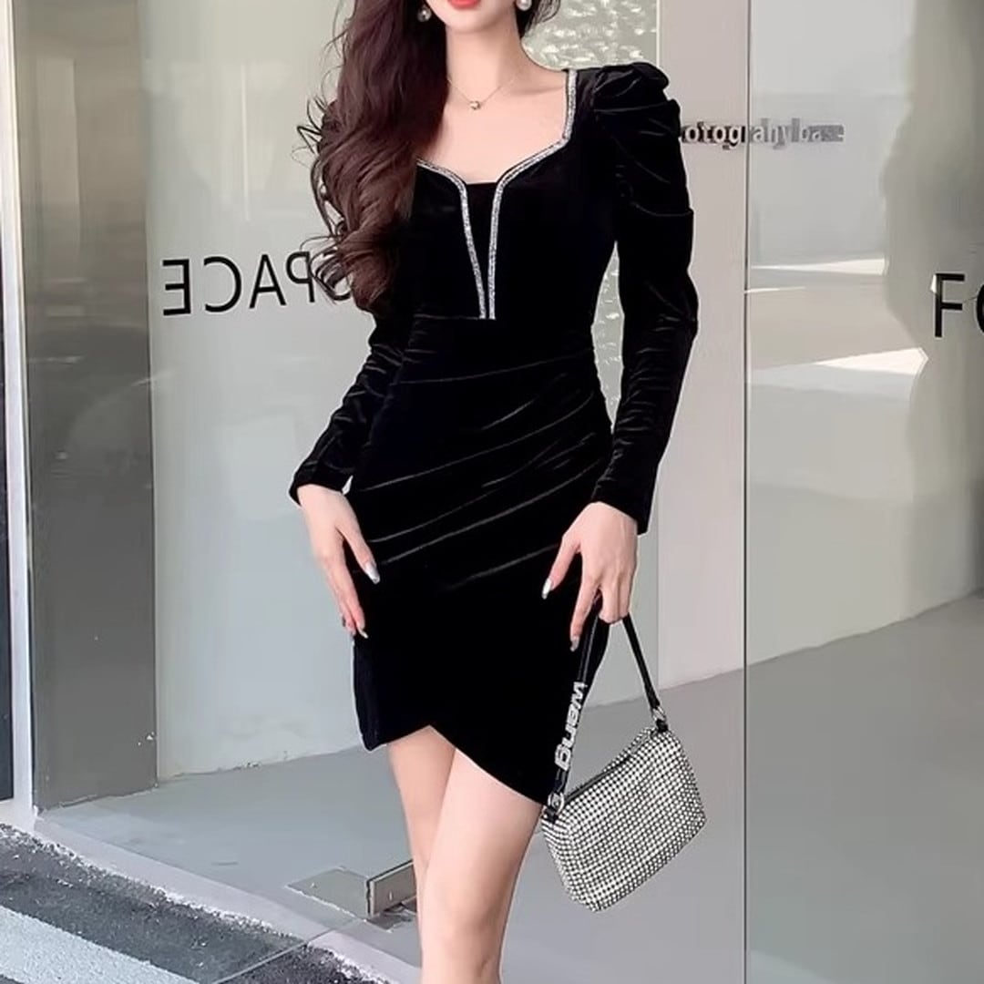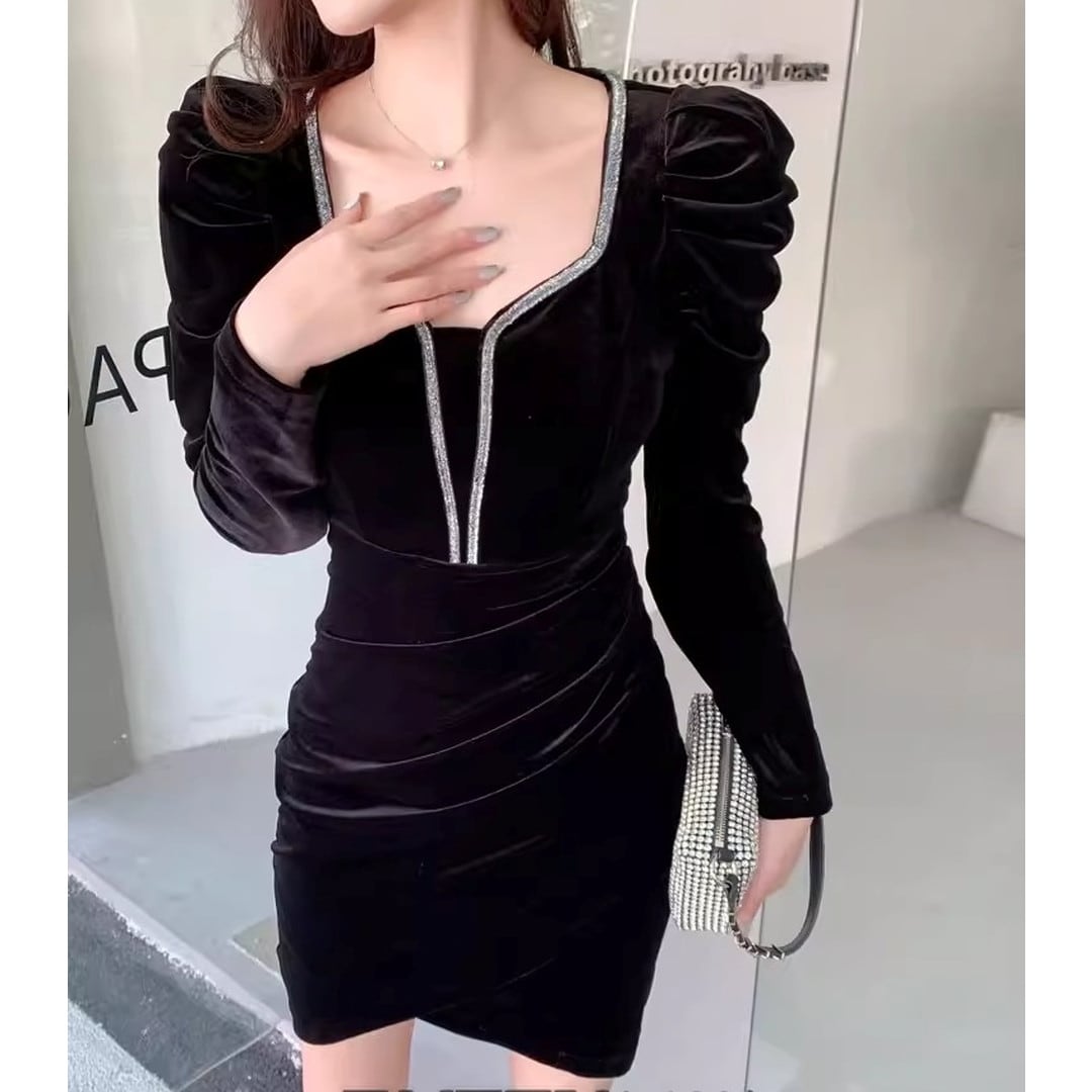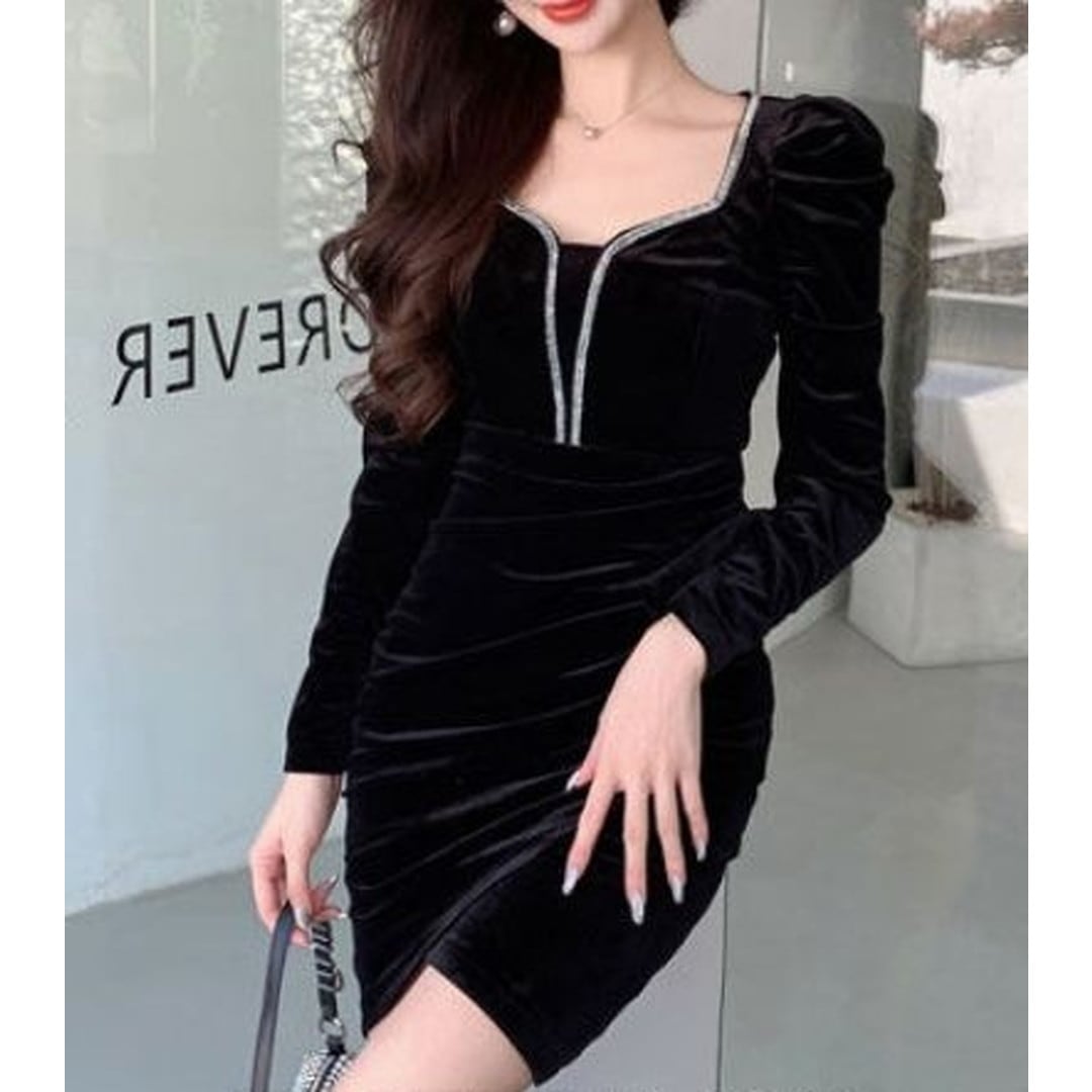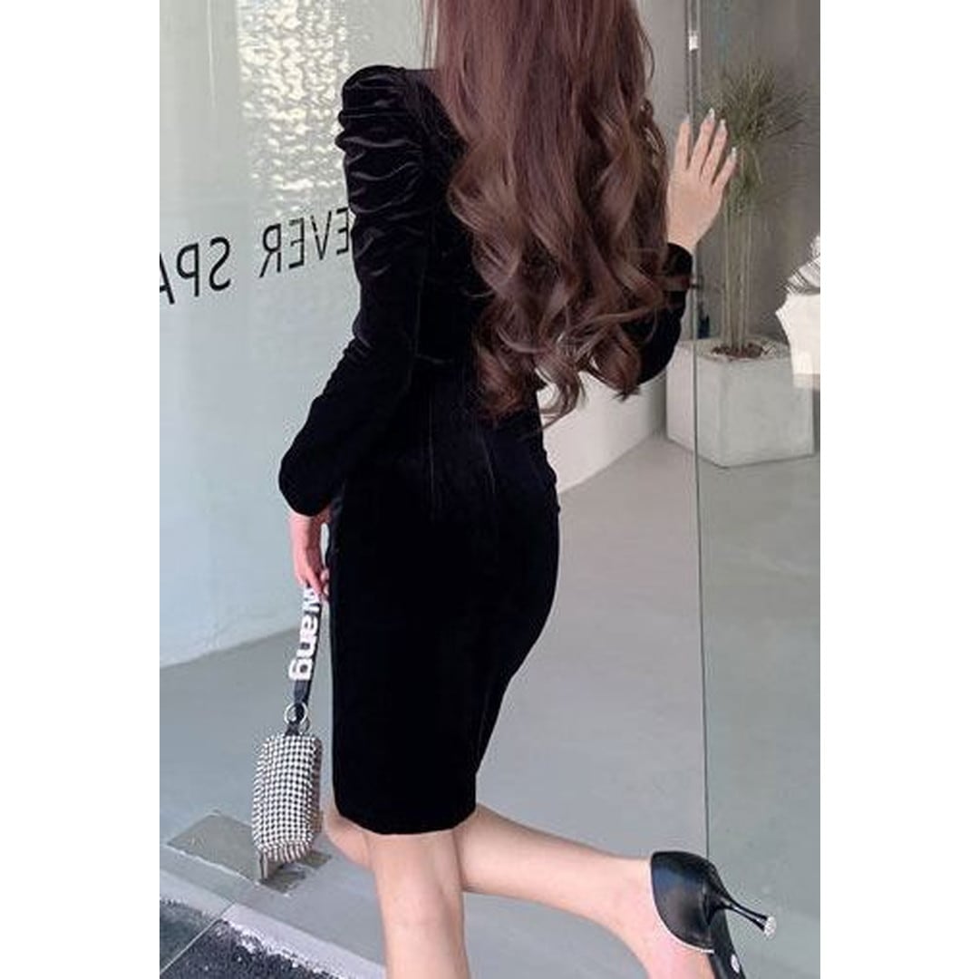 パフスリーブが特徴的な長袖ミニドレス。程よいミニ丈で、パーティーシーンや特別な日のお出かけにぴったりです。胸元のラインストーンがアクセントとなり、上品な印象をプラスします。