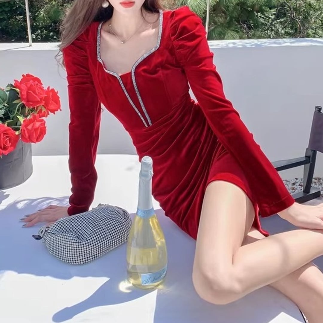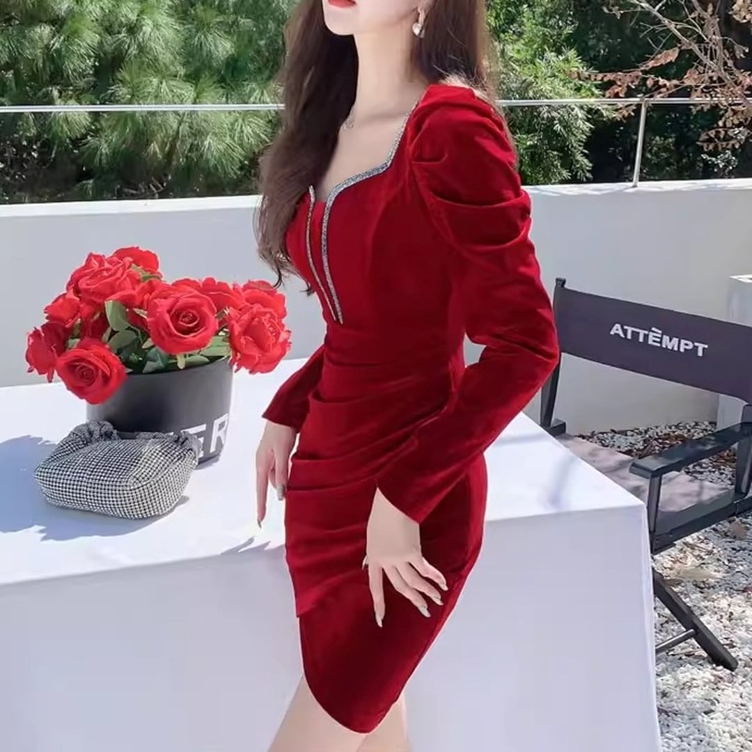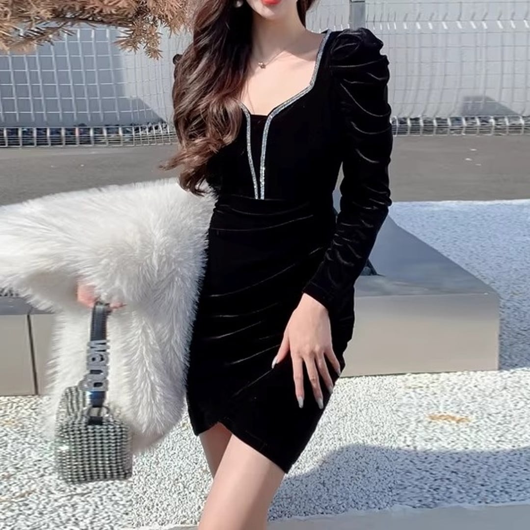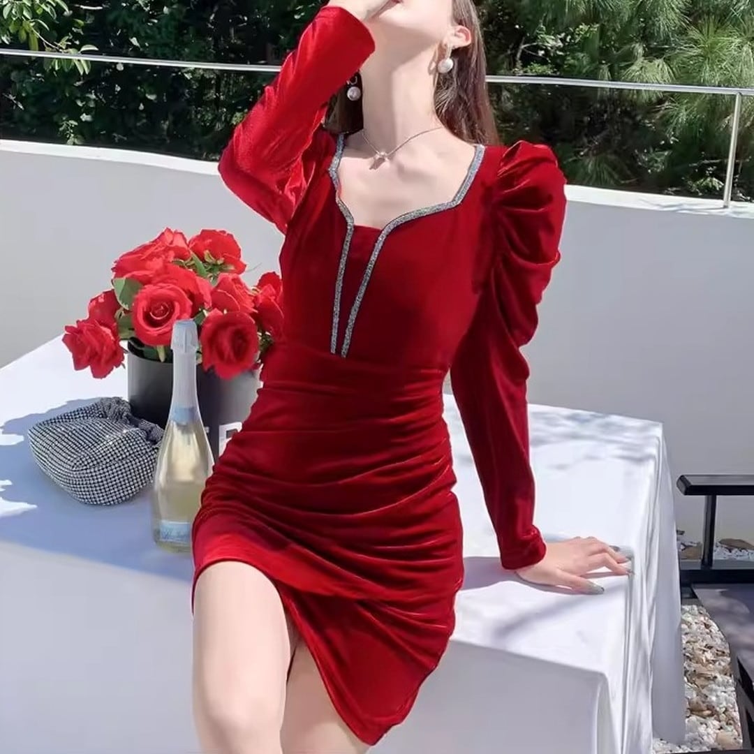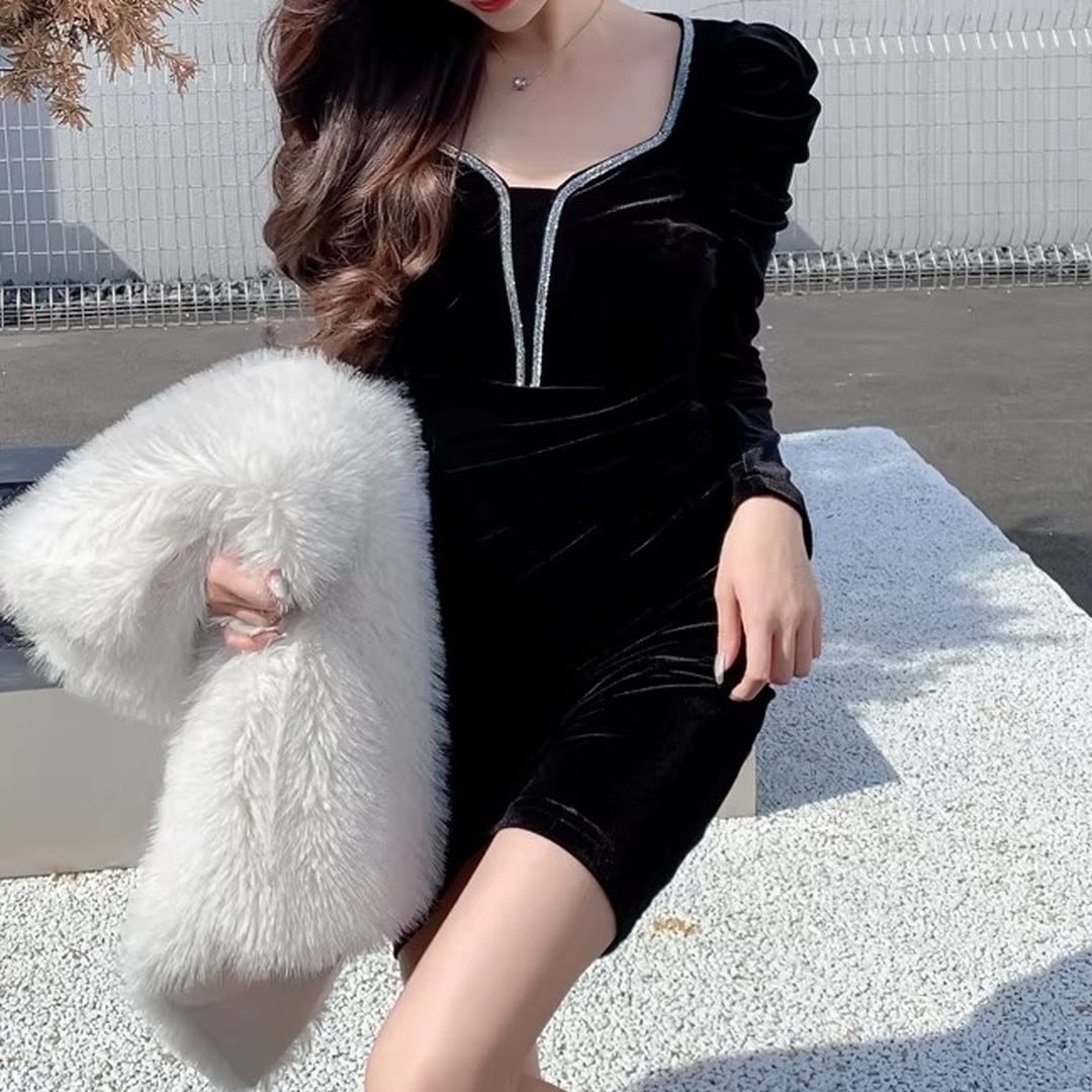 パフスリーブが特徴的な長袖ミニドレス。程よいミニ丈で、パーティーシーンや特別な日のお出かけにぴったりです。胸元のラインストーンがアクセントとなり、上品な印象をプラスします。