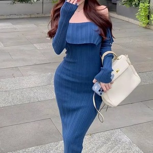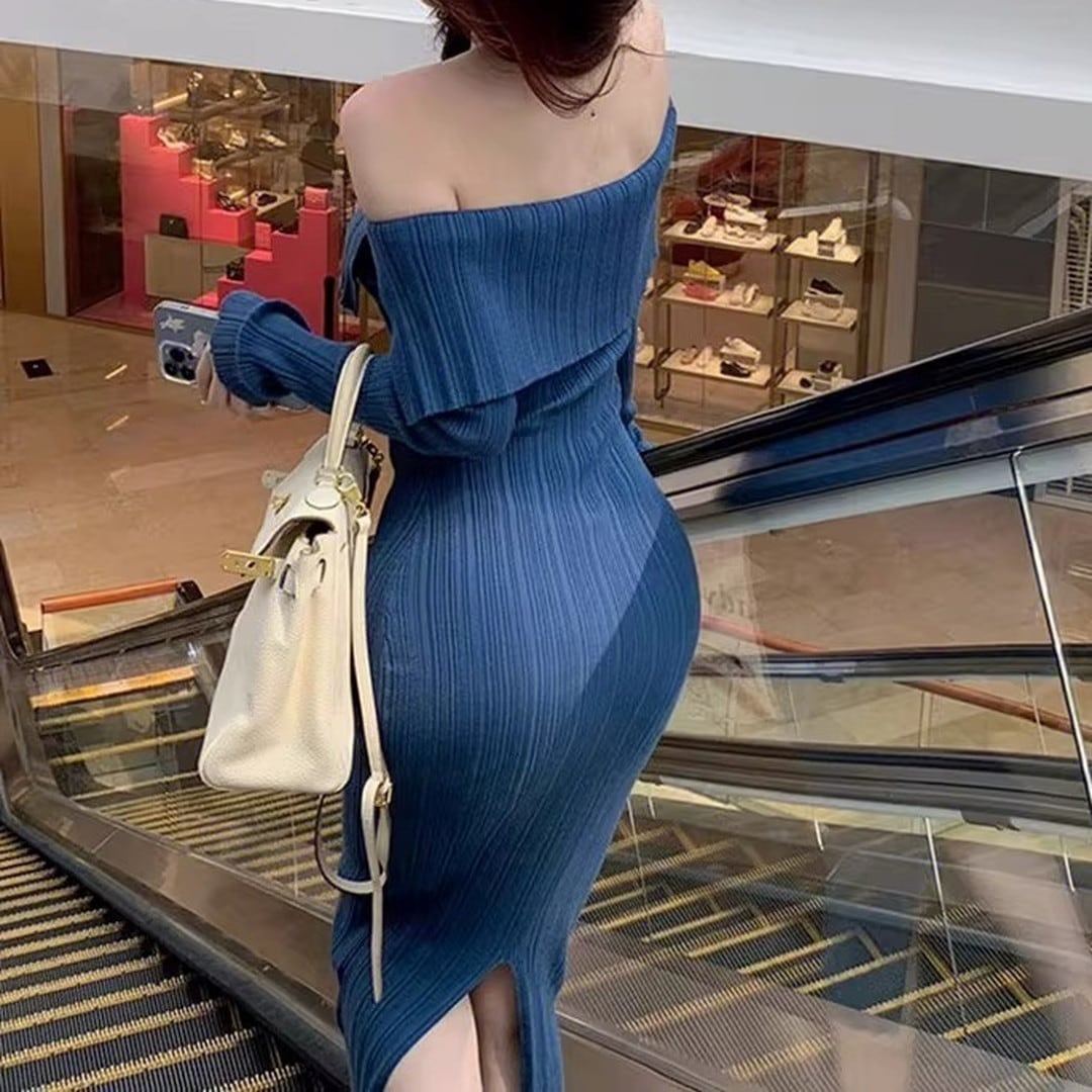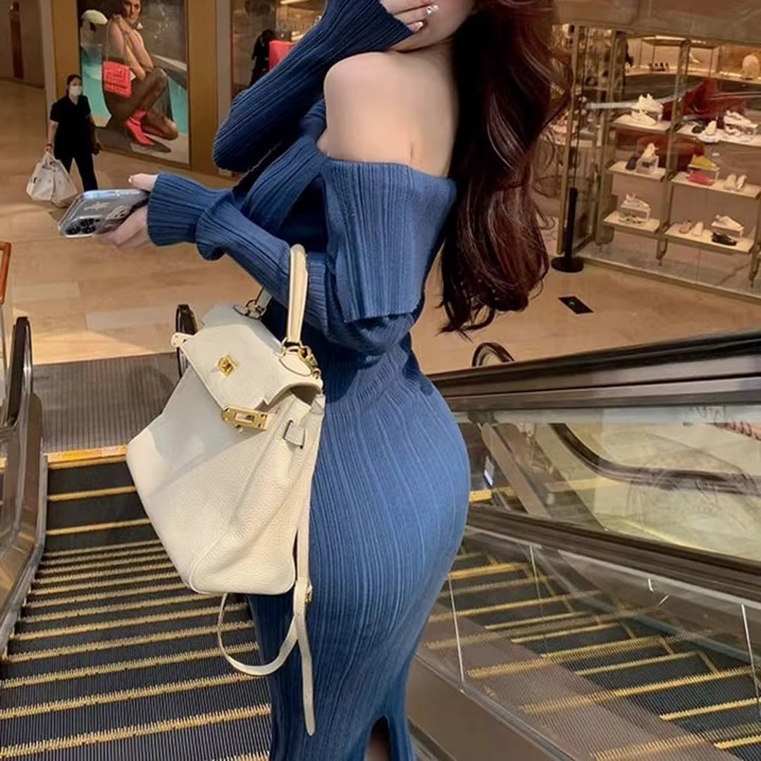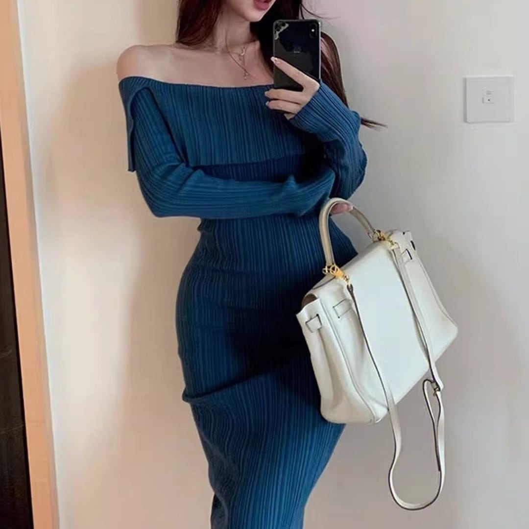 上品な肌見せが叶うオフショルダーデザインのミディ丈ニットワンピース。
