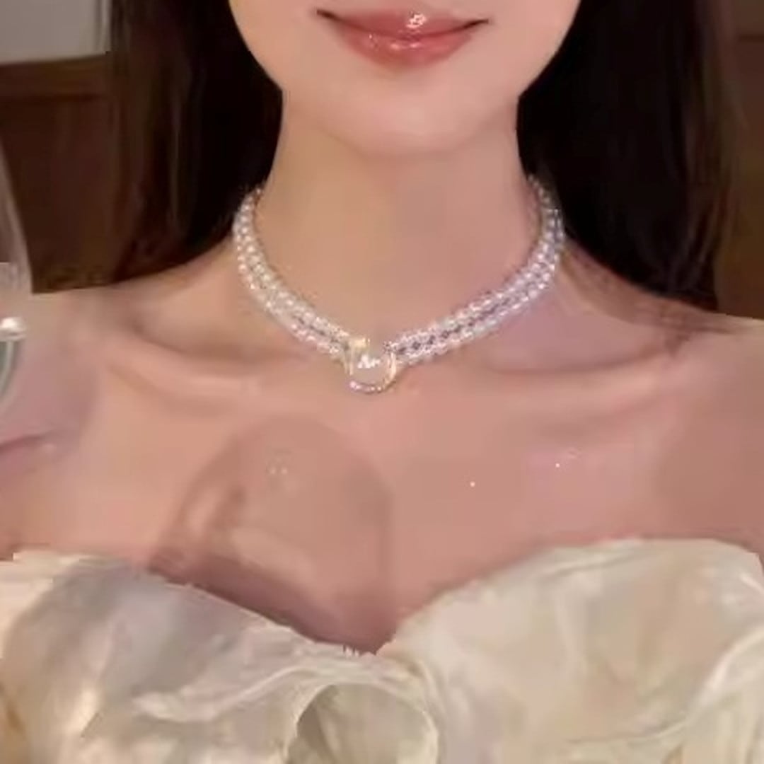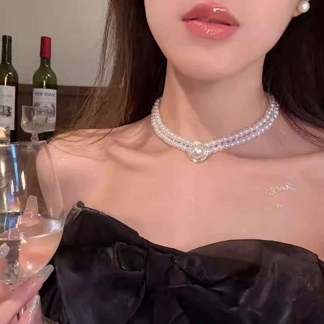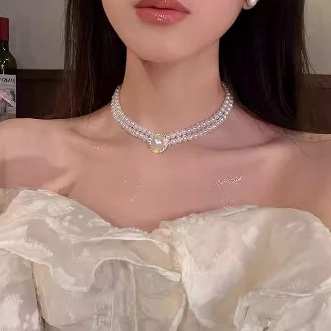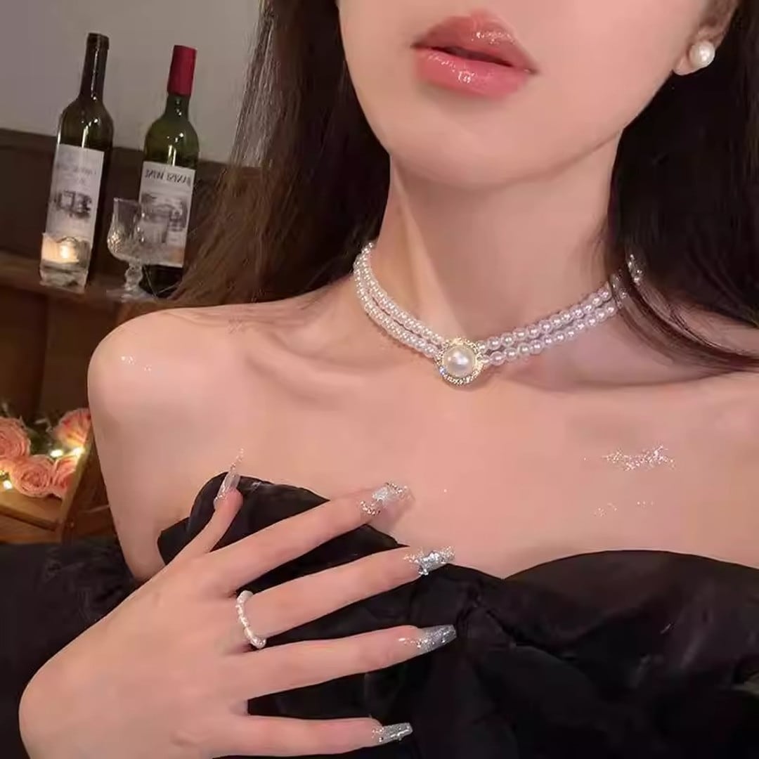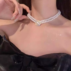 上品な輝きを放つ2連のネックレス。中央にあしらわれたパール調のモチーフが、洗練された印象を与えます。パーティーシーンはもちろん、普段使いにもおすすめです。首元を華やかに演出し、あなたの魅力を引き立てます。