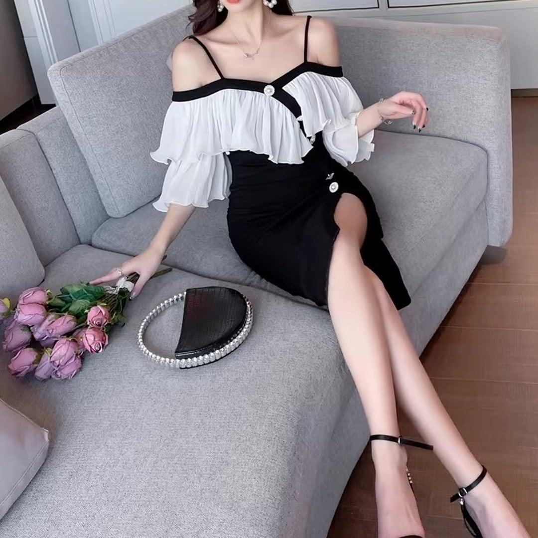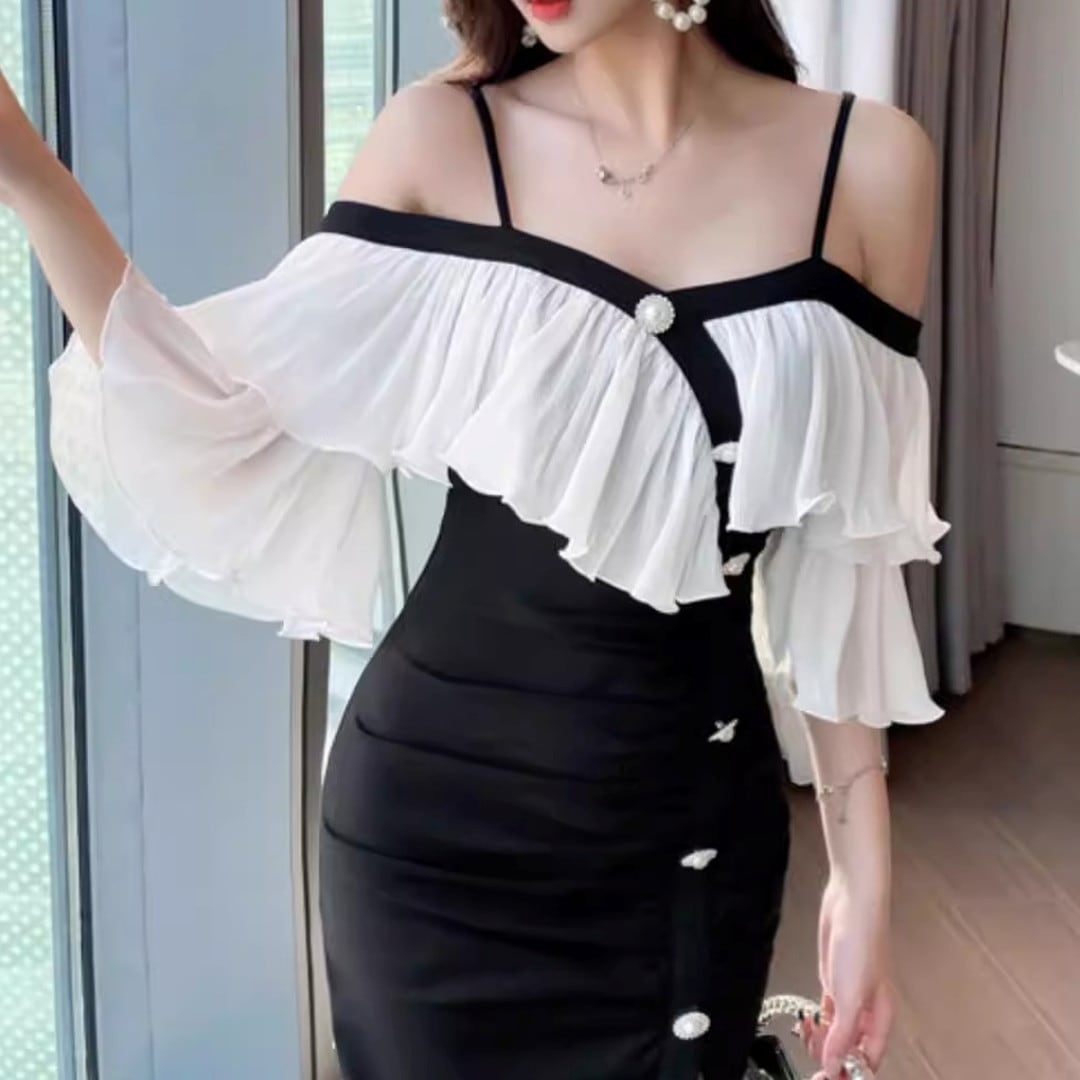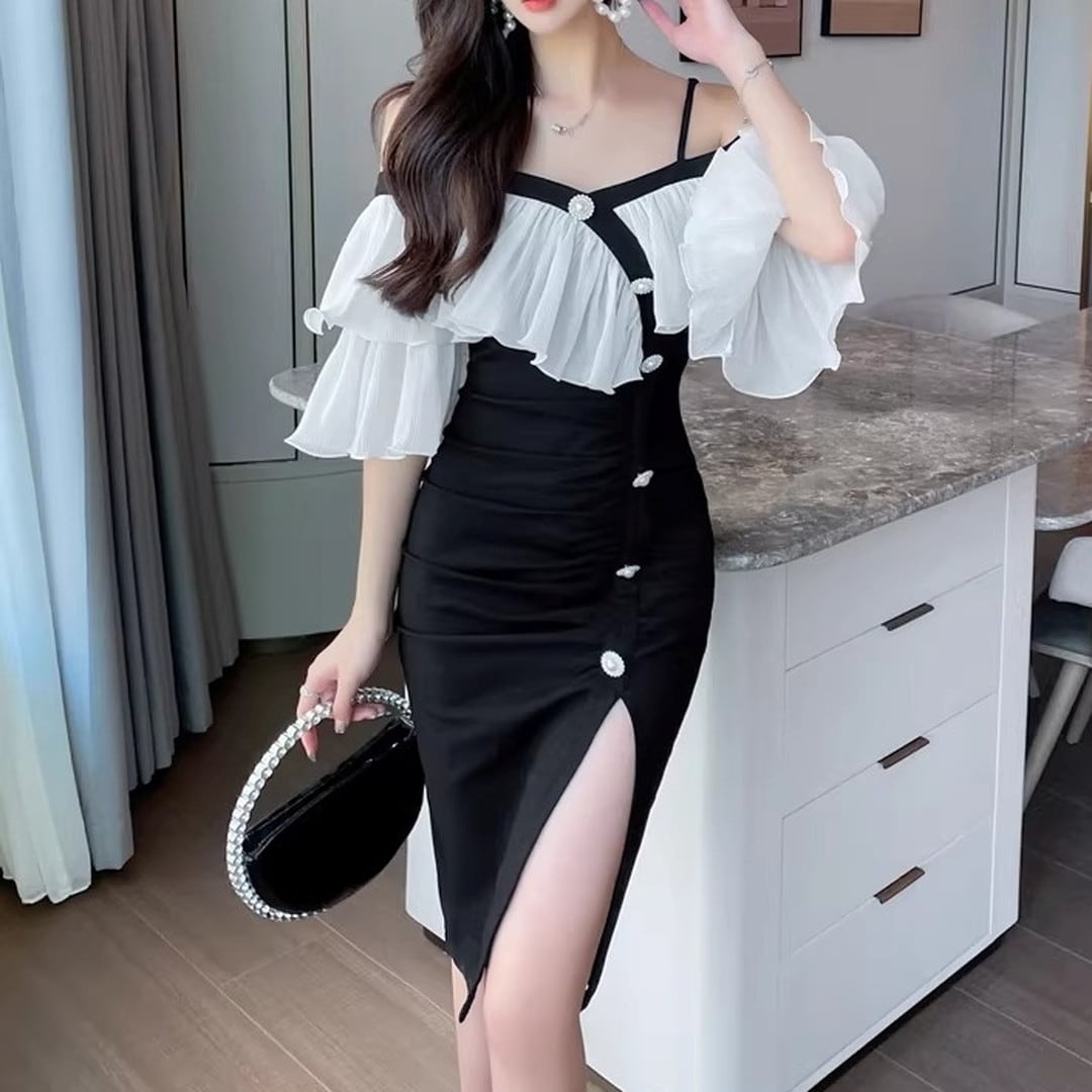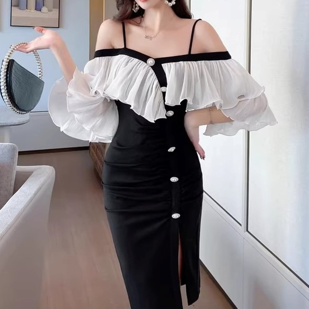 オフショルダーデザインが、デコルテを美しく見せてくれるミディドレス。肩のフリルがフェミニンな印象を与え、エレガントな雰囲気を演出します。フロントにはボタンがあしらわれ、さりげないアクセントに。スリット入りで足さばきも良く、動きやすさも考慮されています。特別な日の装いや、パーティーシーンにもおすすめです。