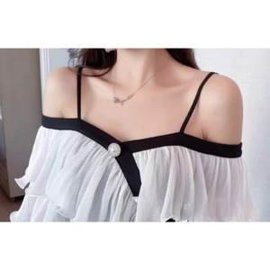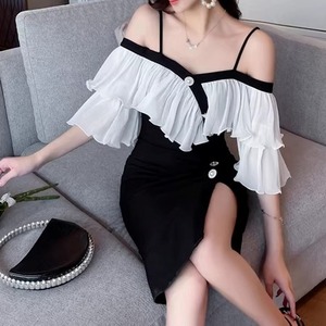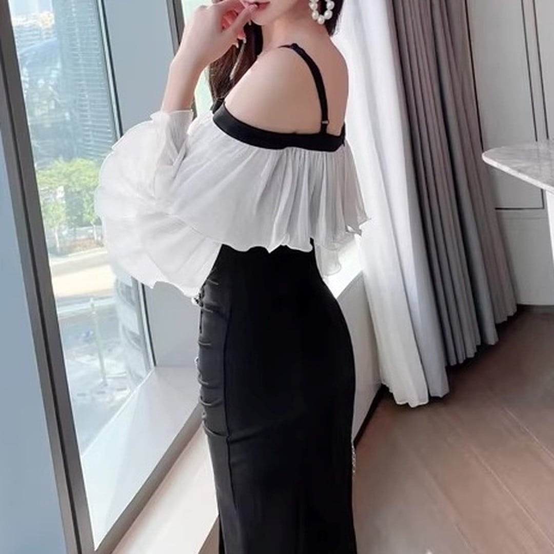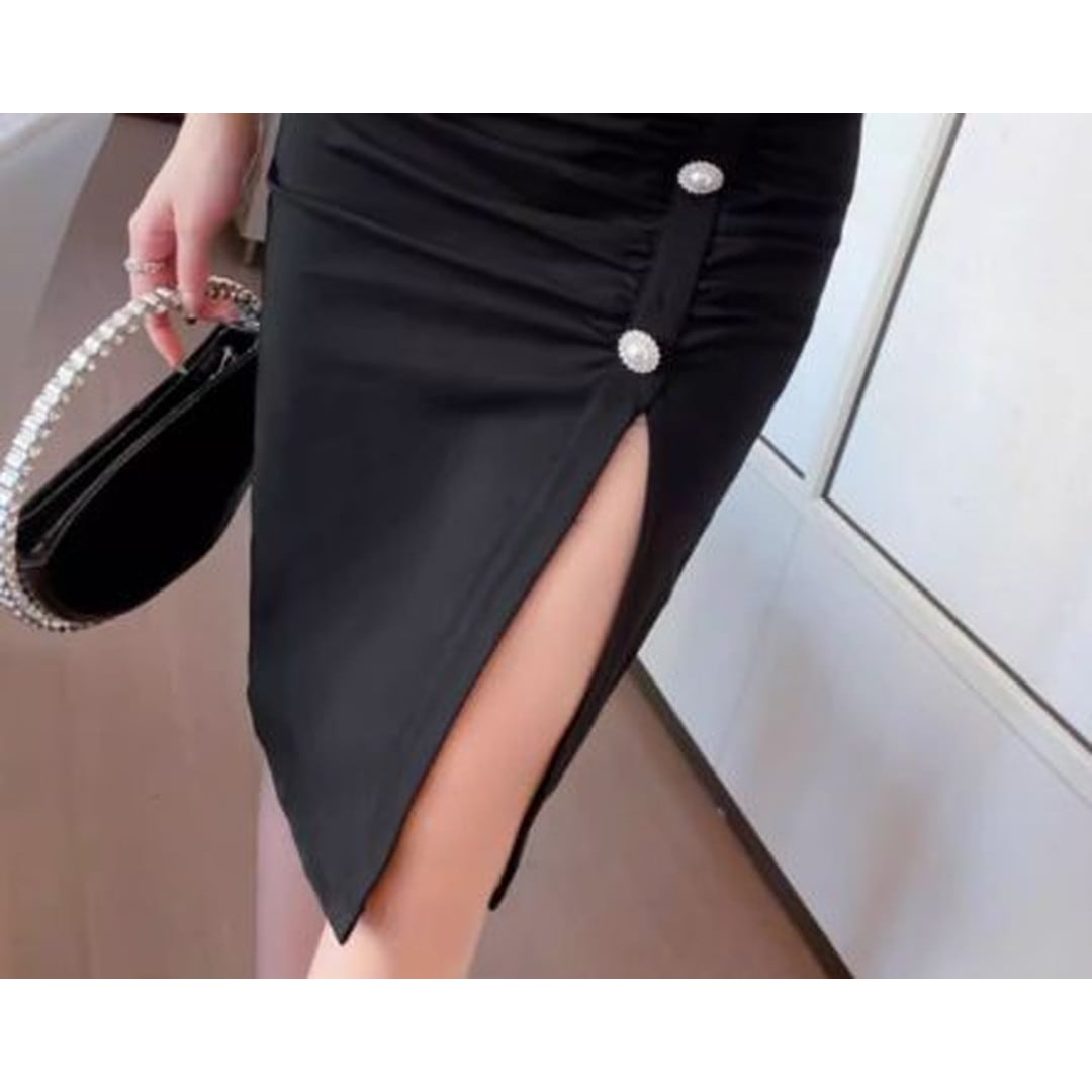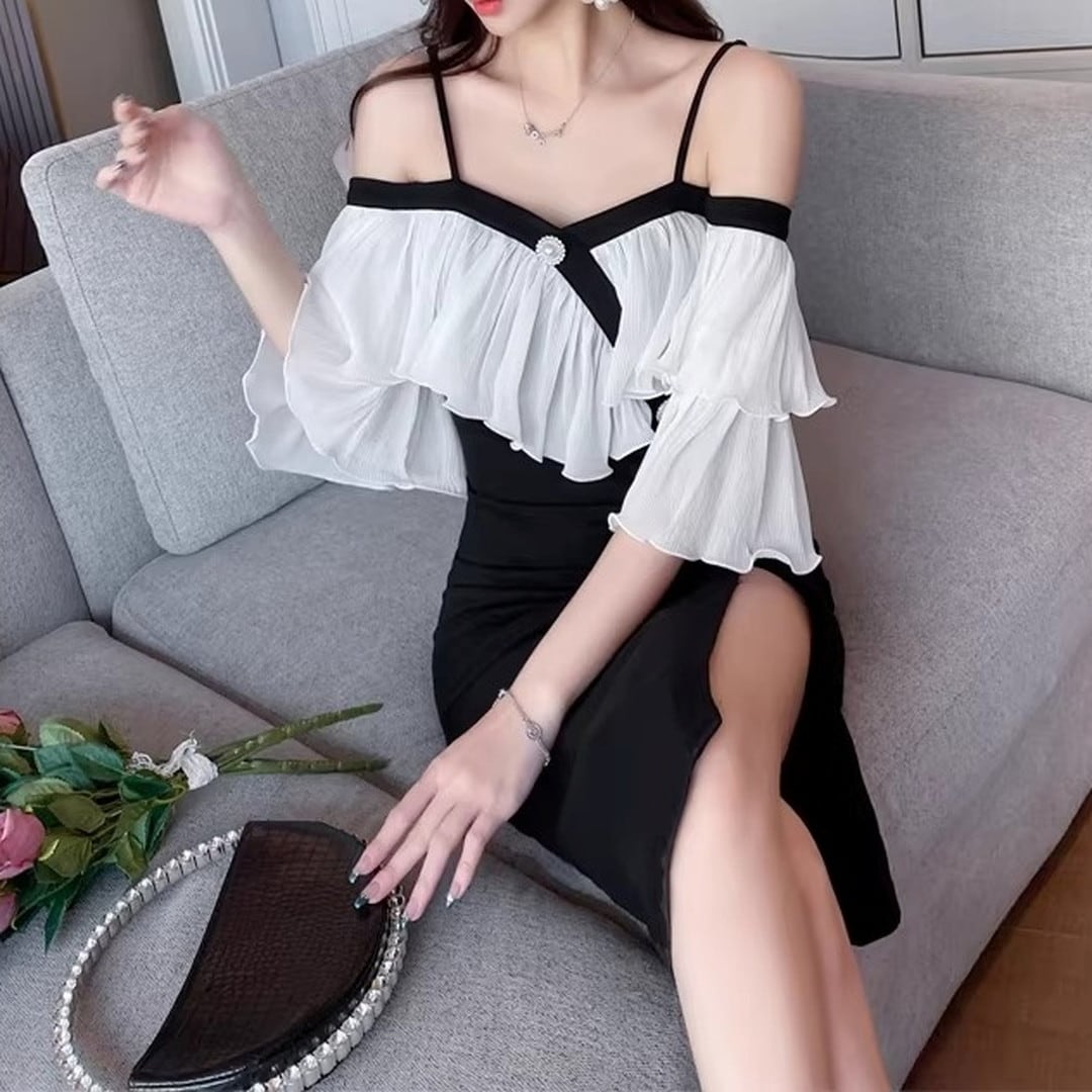 オフショルダーデザインが、デコルテを美しく見せてくれるミディドレス。肩のフリルがフェミニンな印象を与え、エレガントな雰囲気を演出します。フロントにはボタンがあしらわれ、さりげないアクセントに。スリット入りで足さばきも良く、動きやすさも考慮されています。特別な日の装いや、パーティーシーンにもおすすめです。