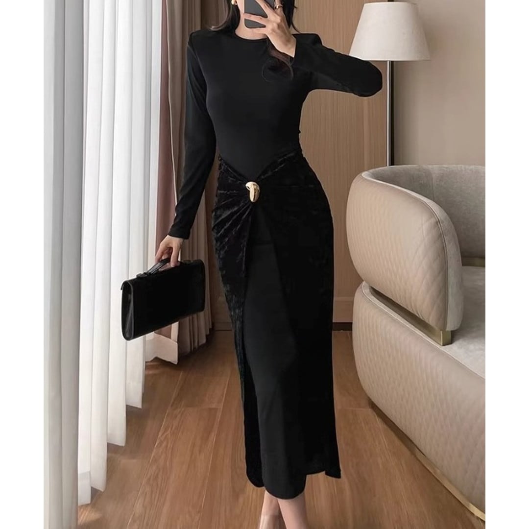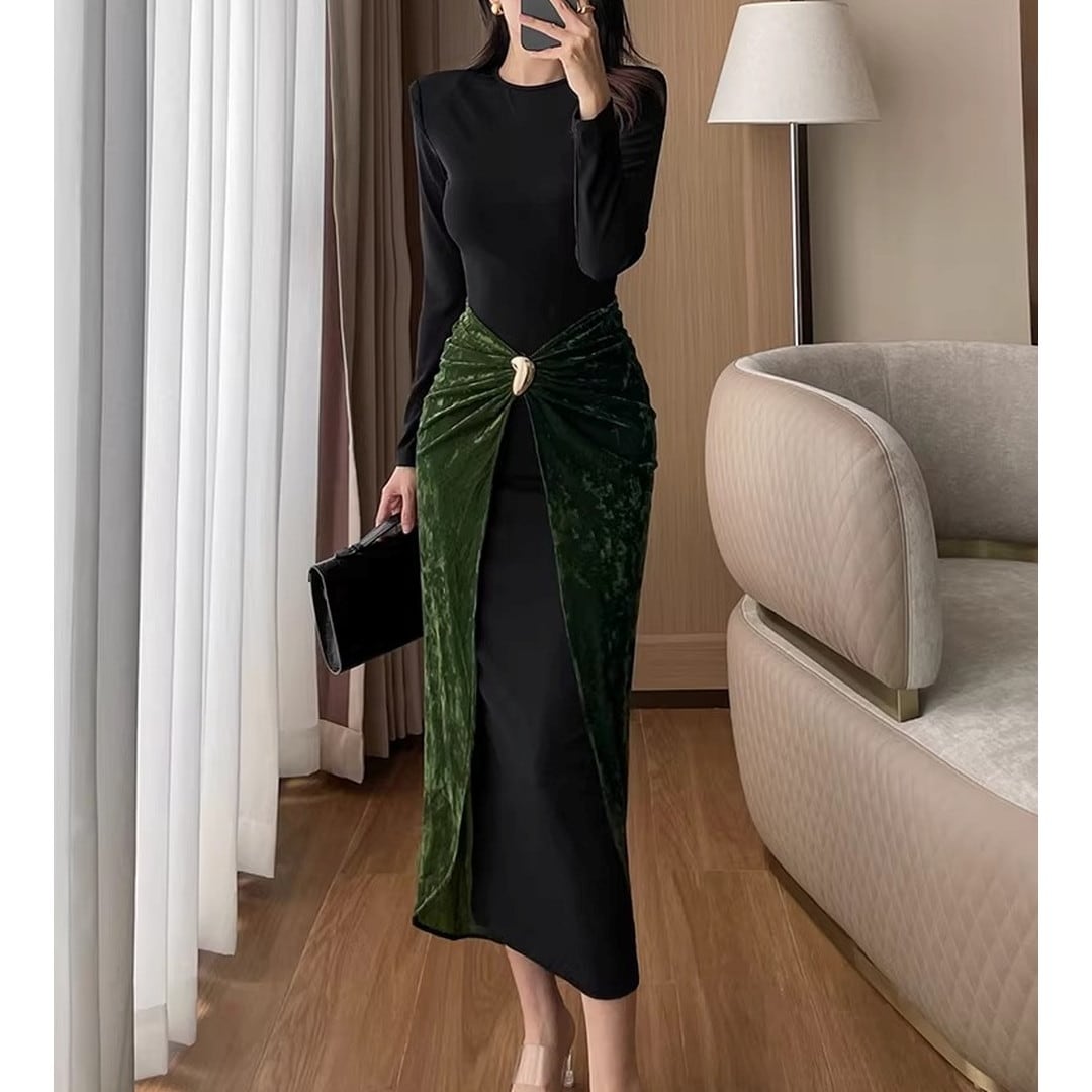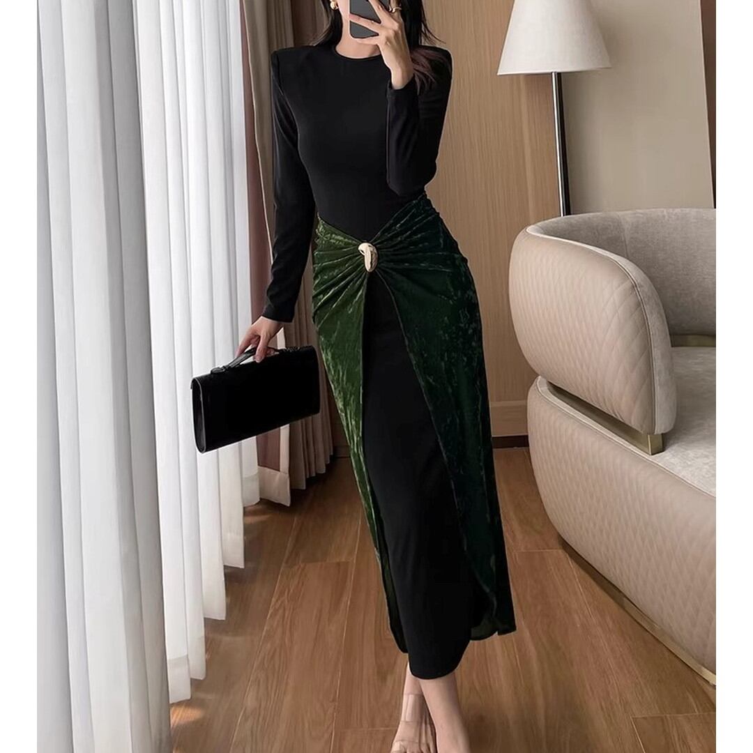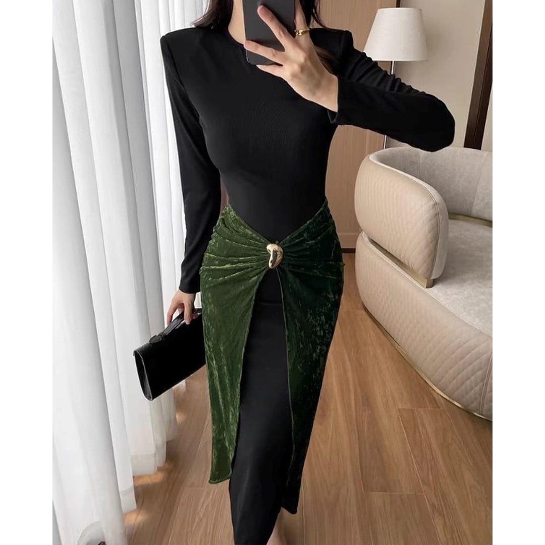 エレガントな装いを叶えるミディ丈の長袖ワンピース。ラップスタイルのデザインが、洗練された大人の女性らしさを演出します。全体を引き締めるブラックカラーに、深みのあるグリーンのラップ部分がアクセントとなり、華やかな印象に。パーティーシーンや特別な日のディナーなど、様々なシーンで活躍します。