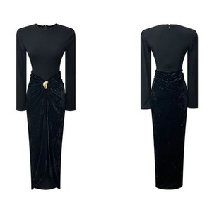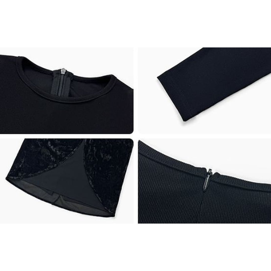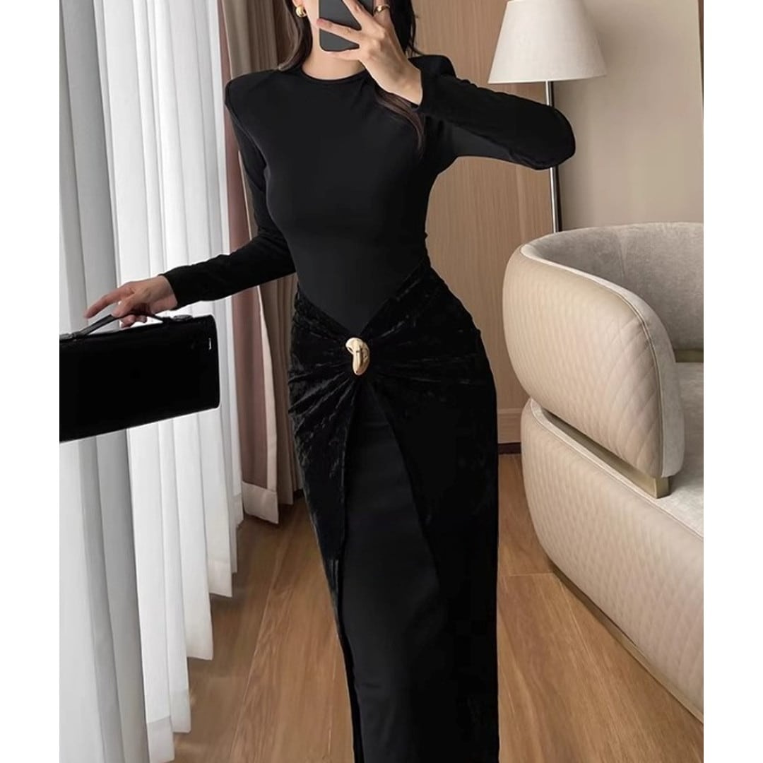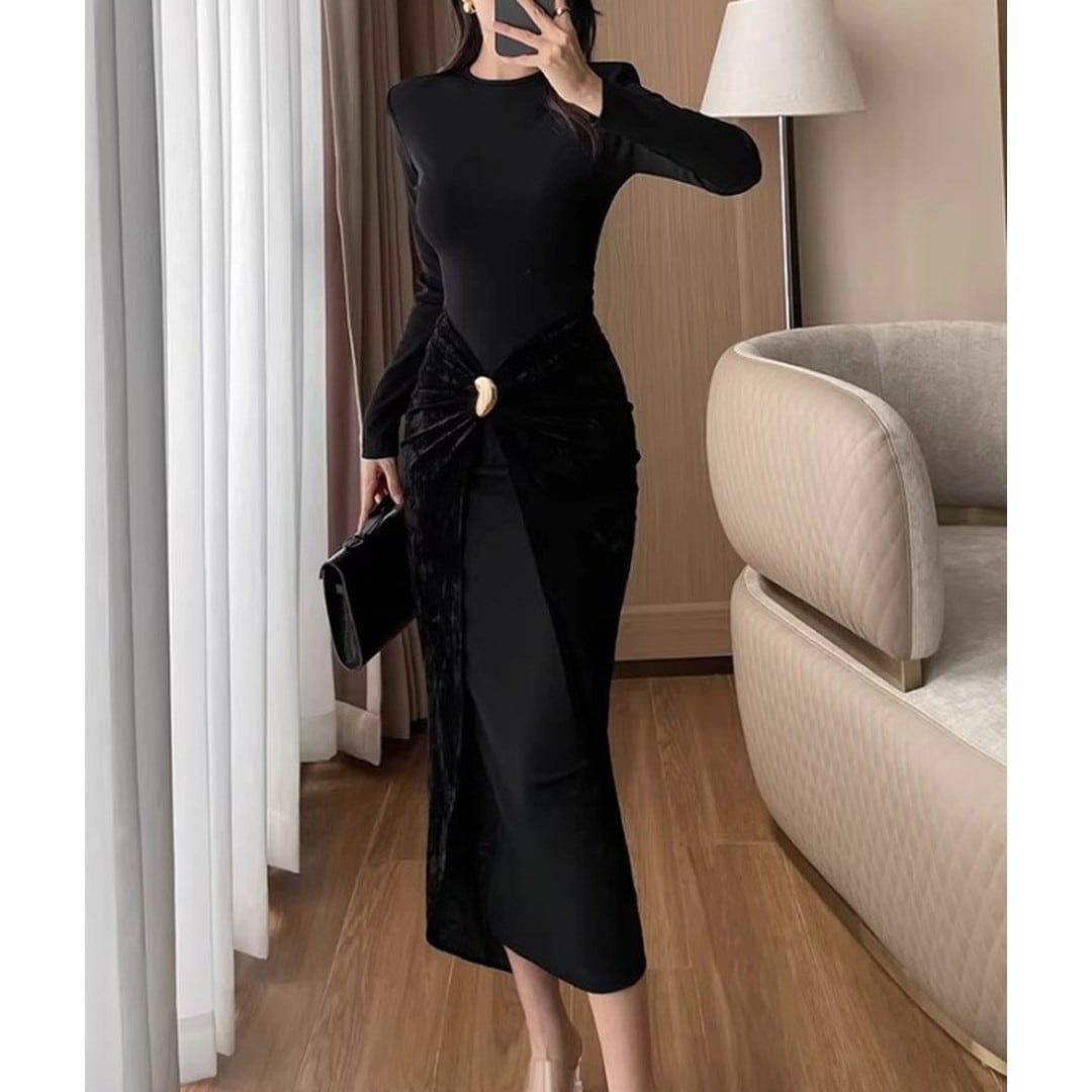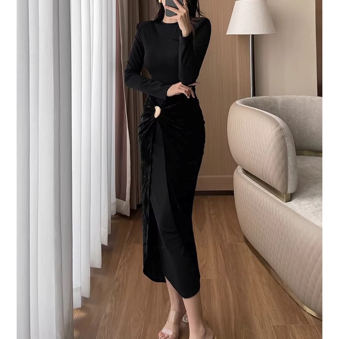 エレガントな装いを叶えるミディ丈の長袖ワンピース。ラップスタイルのデザインが、洗練された大人の女性らしさを演出します。全体を引き締めるブラックカラーに、深みのあるグリーンのラップ部分がアクセントとなり、華やかな印象に。パーティーシーンや特別な日のディナーなど、様々なシーンで活躍します。