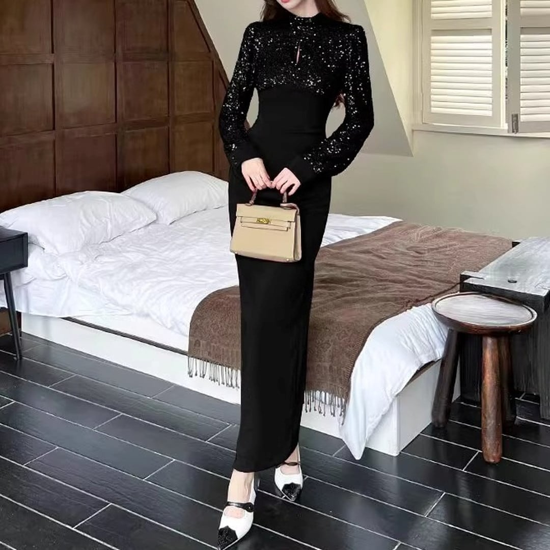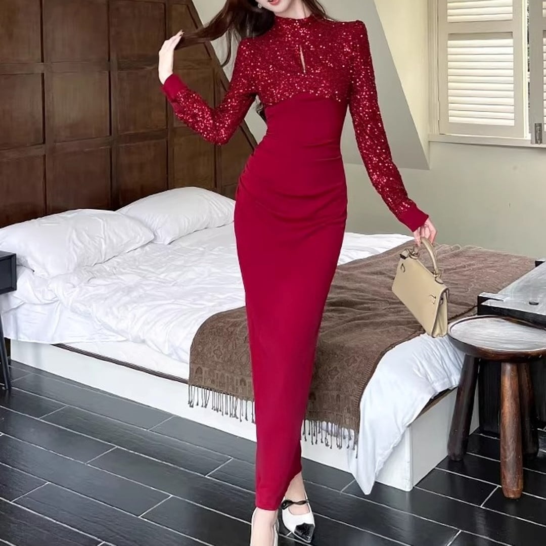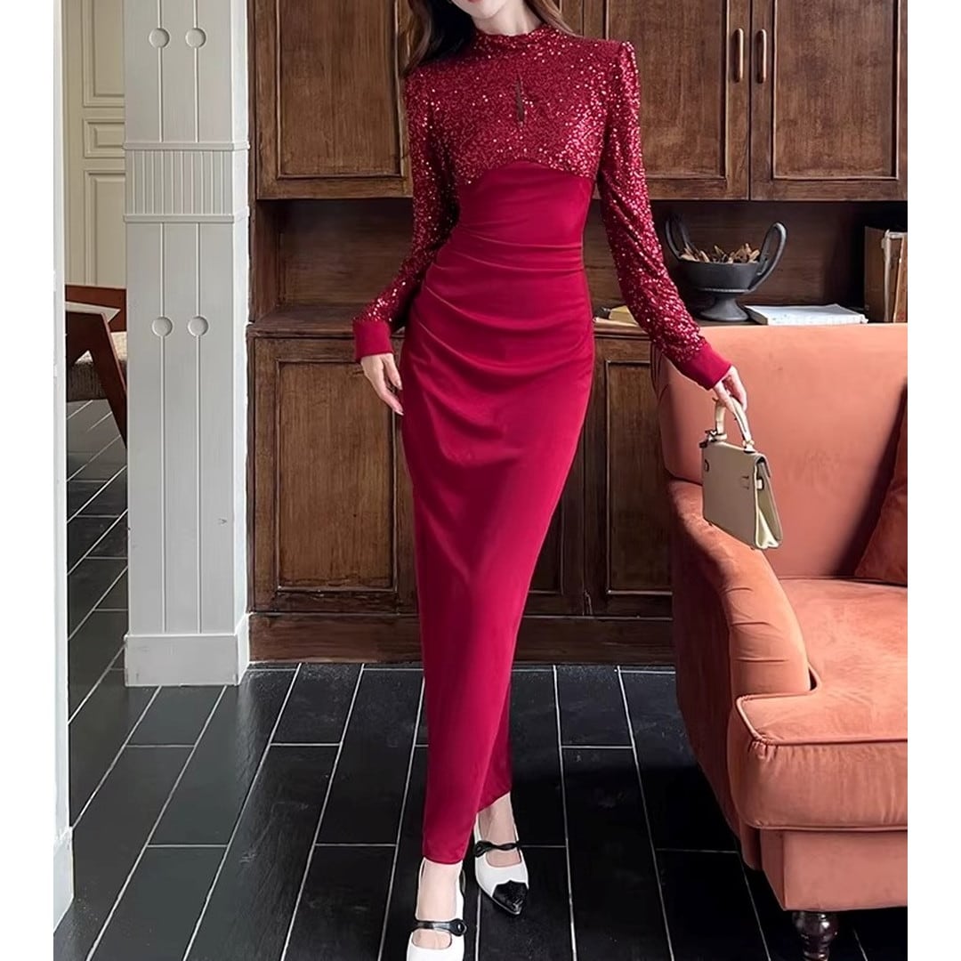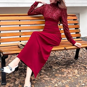 ハイネックとスリムなシルエットが、上品な印象を与えるマキシドレス。長袖なので、少し肌寒い季節にもぴったりです。特別な日の装いはもちろん、パーティーシーンにもおすすめです。
