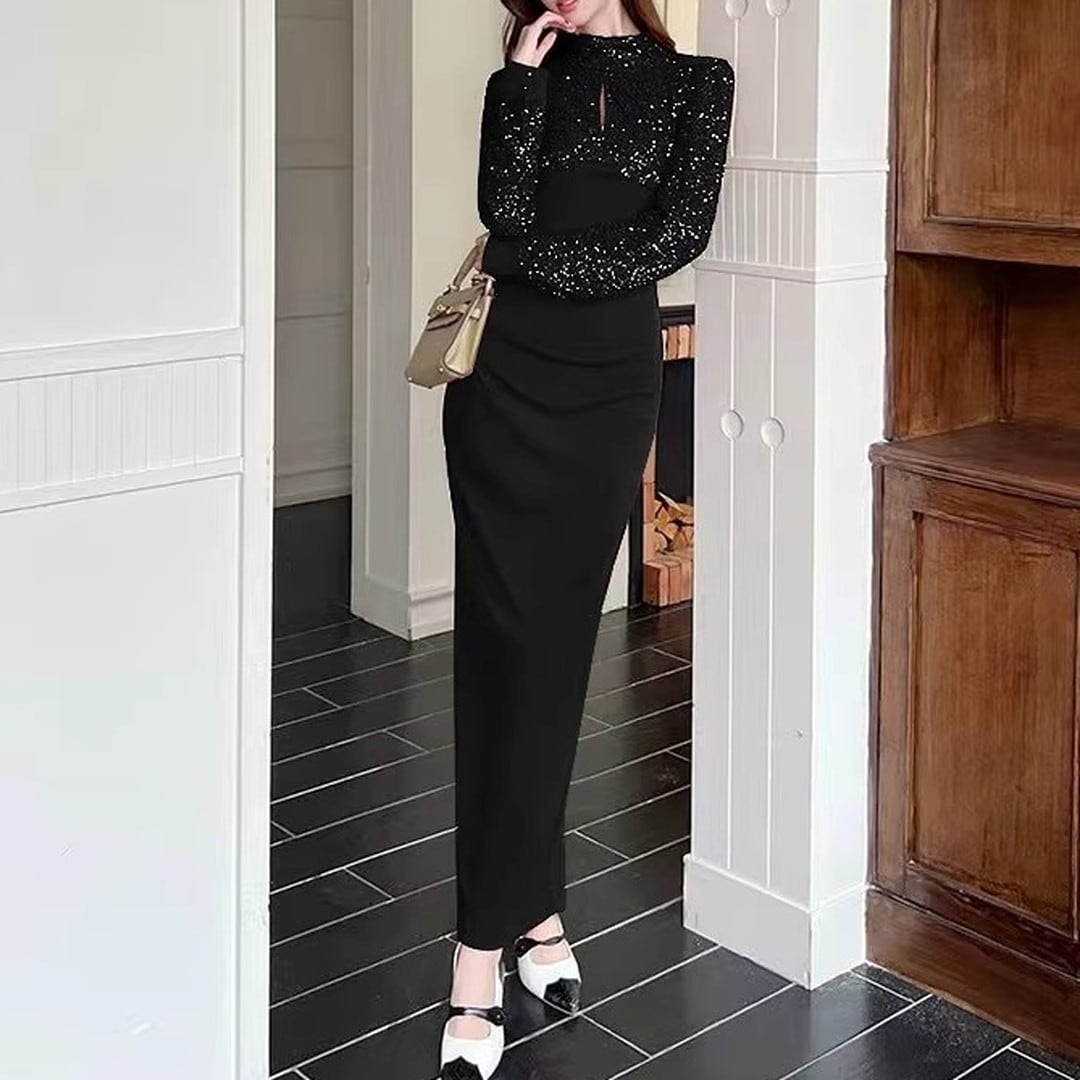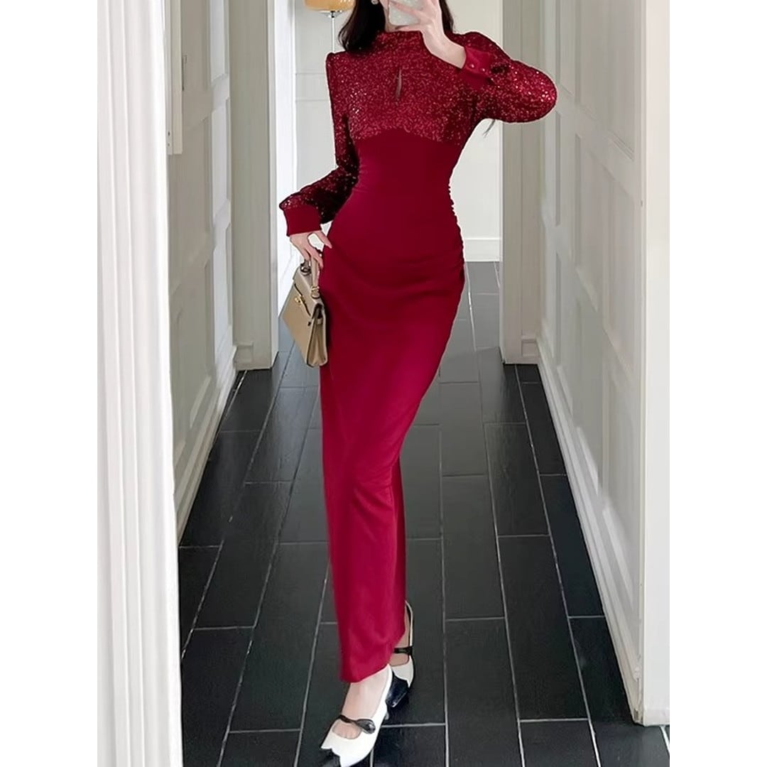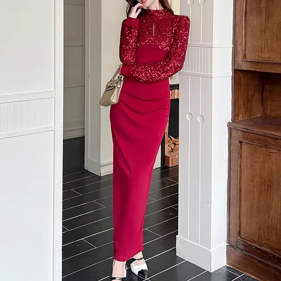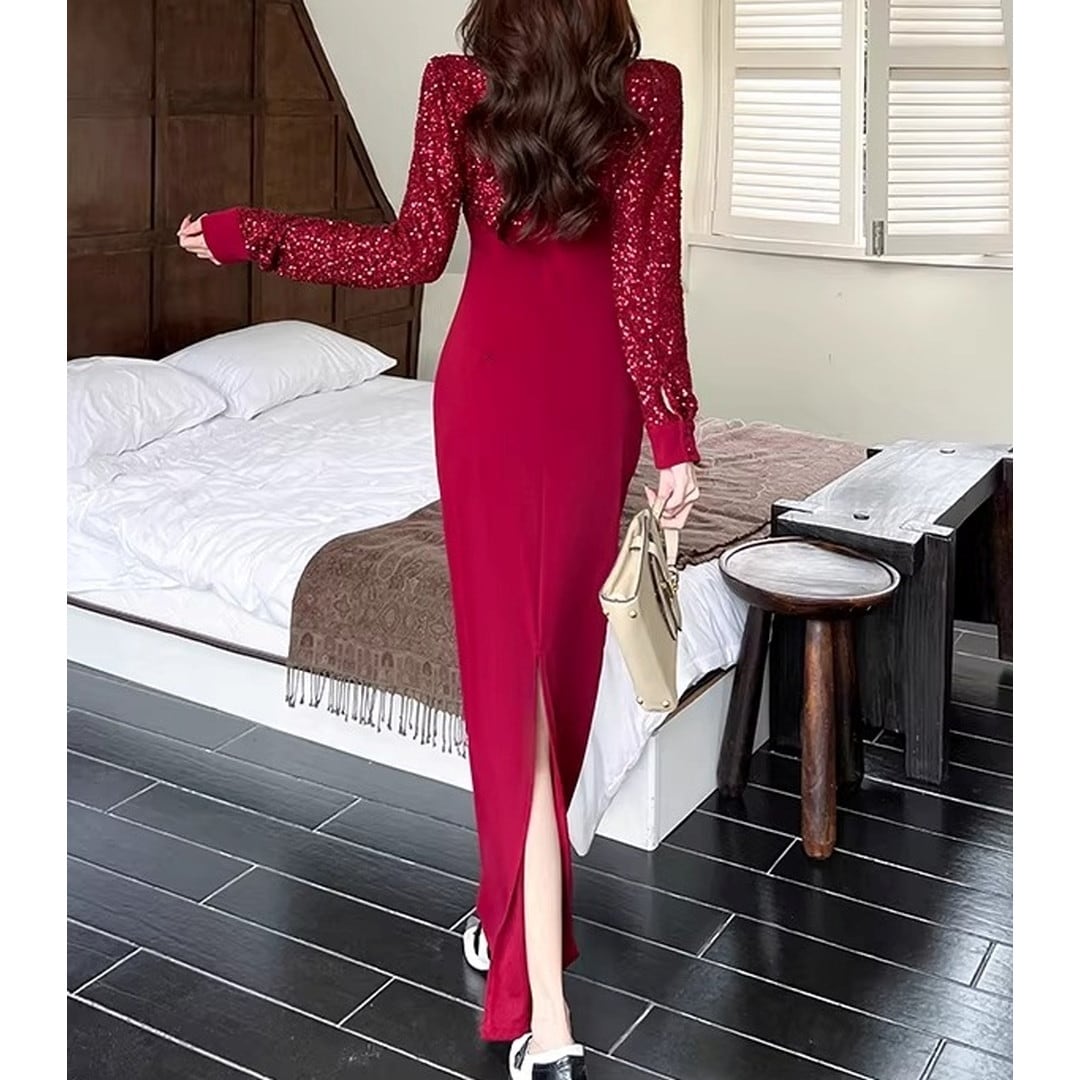 ハイネックとスリムなシルエットが、上品な印象を与えるマキシドレス。長袖なので、少し肌寒い季節にもぴったりです。特別な日の装いはもちろん、パーティーシーンにもおすすめです。