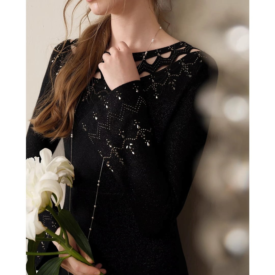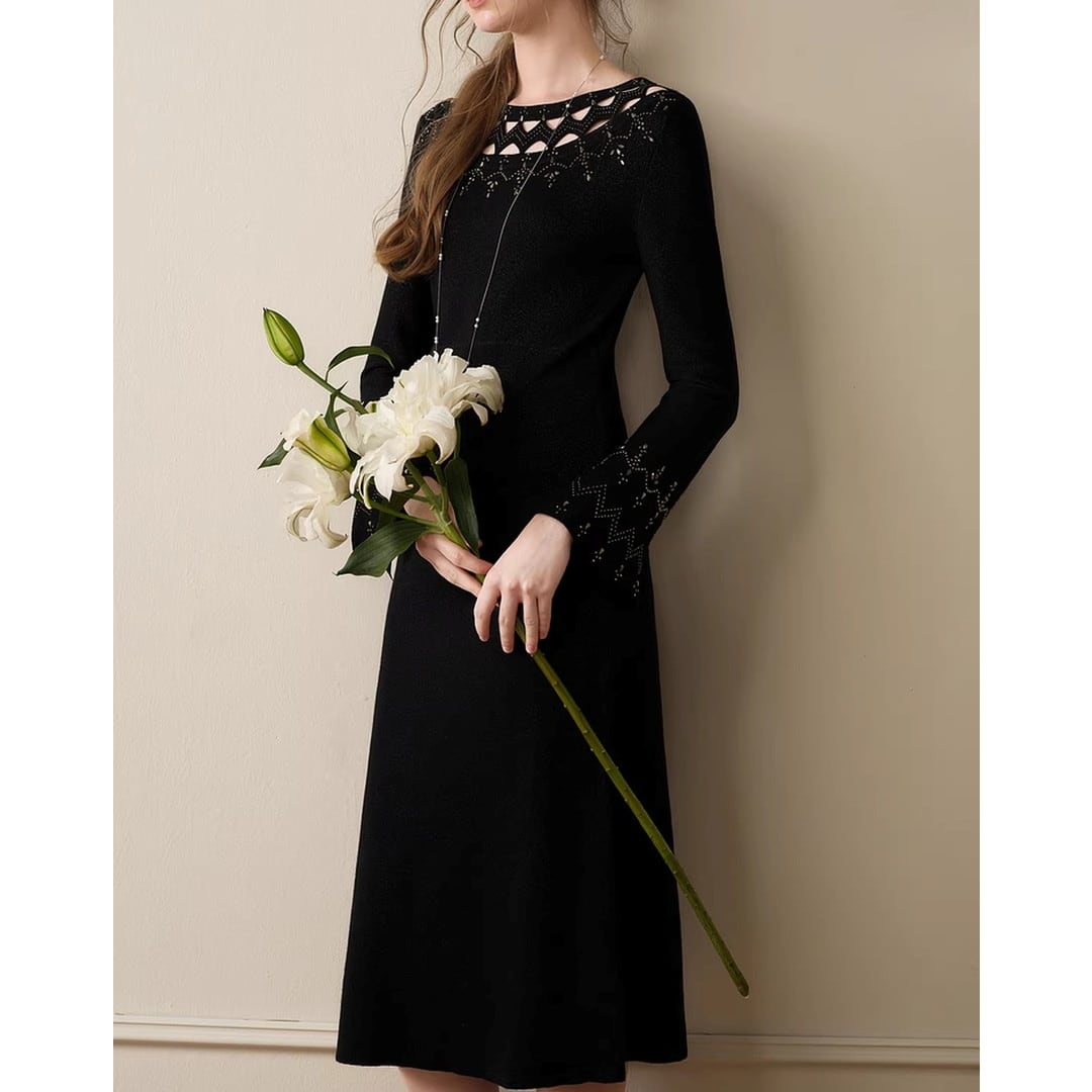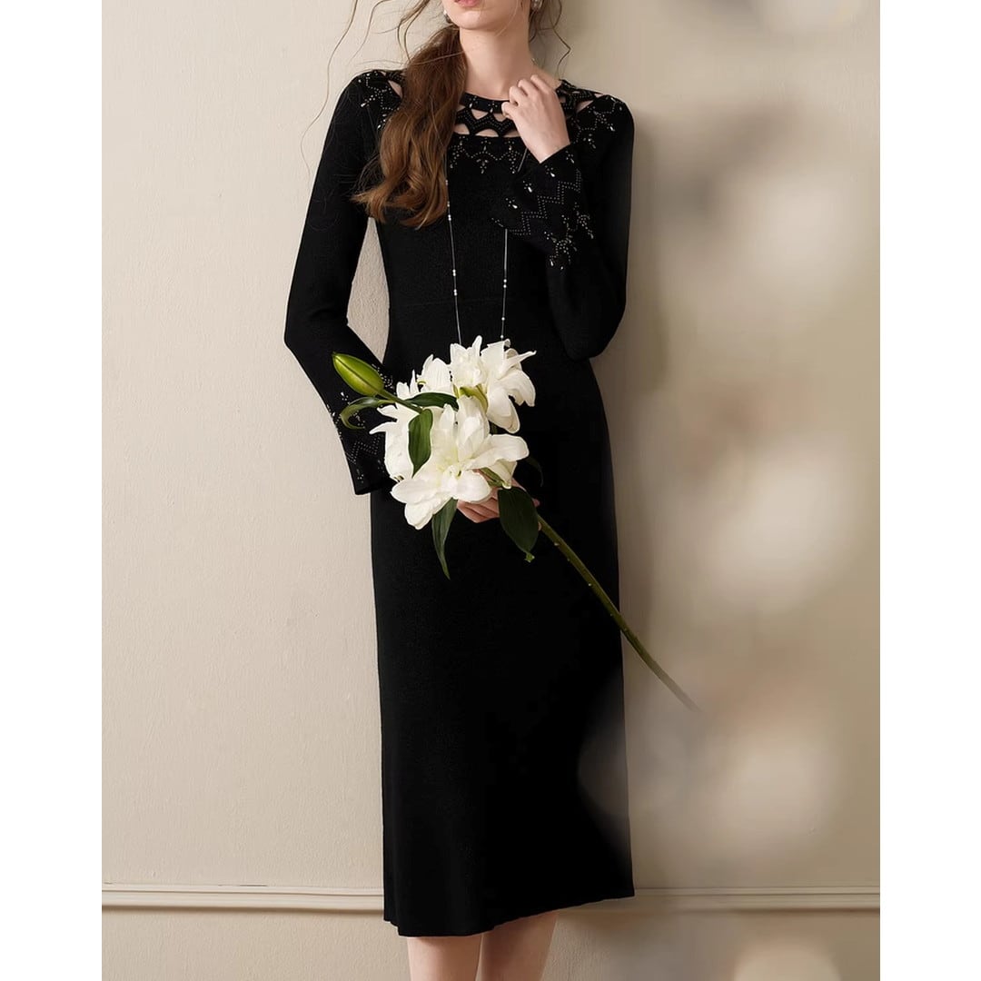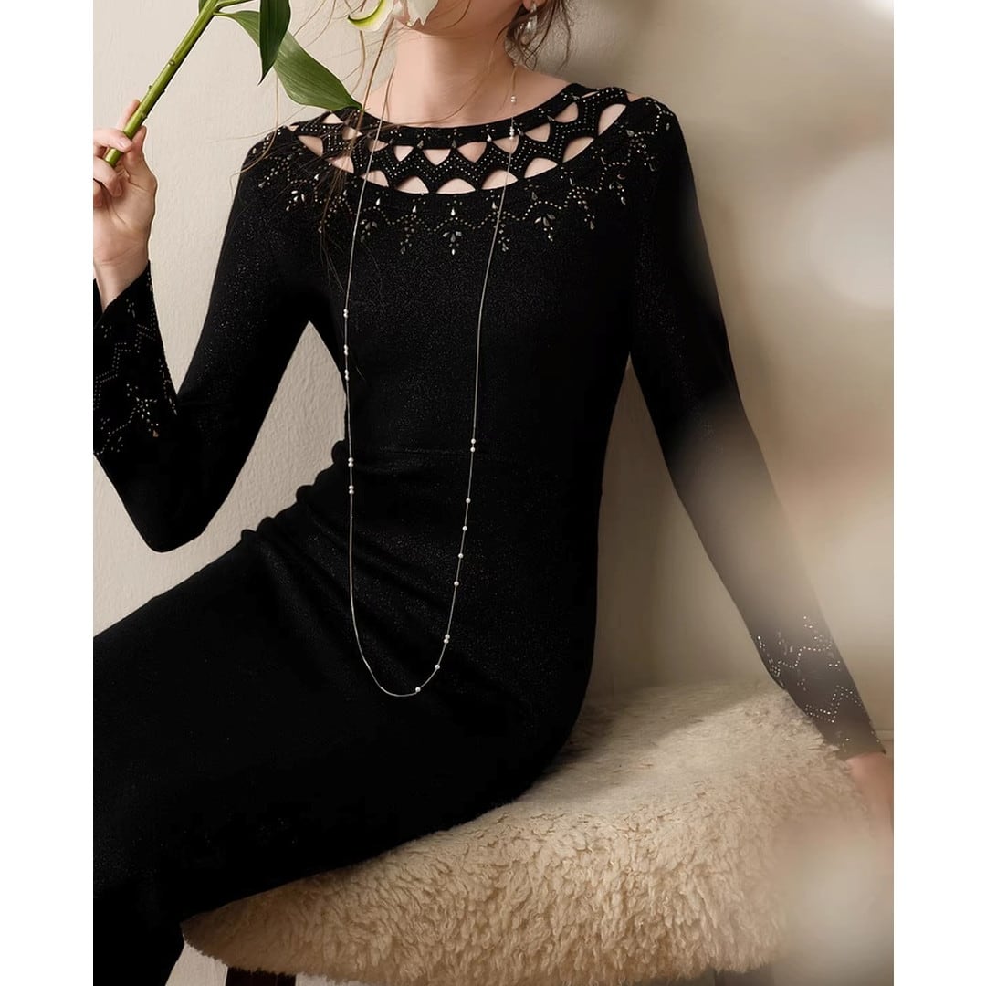 デコルテのカットアウトが印象的なミディ丈タイトドレス。長袖デザインで上品さを演出しつつ、ボディラインに沿ったシルエットが女性らしさを際立たせます。ちょっとしたお出かけや、改まったお席にもおすすめです。