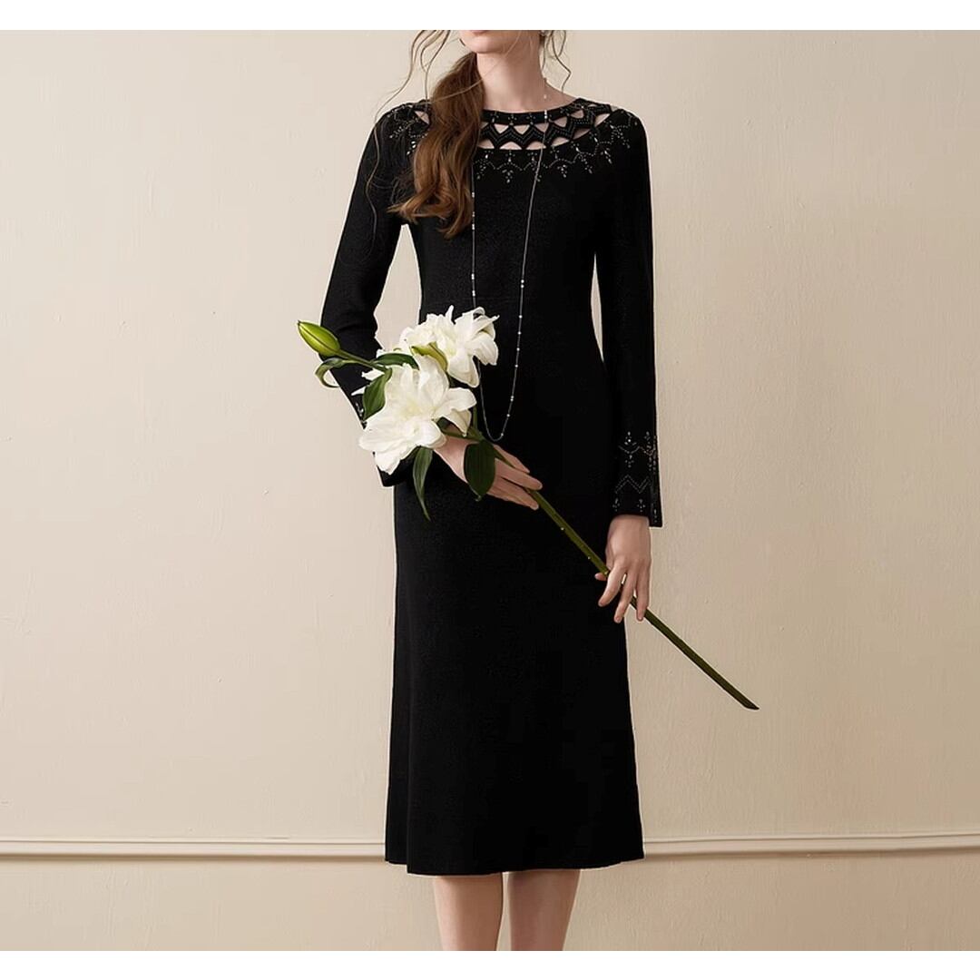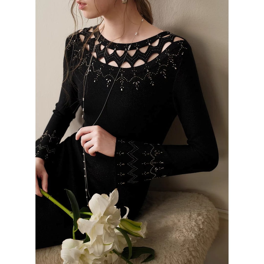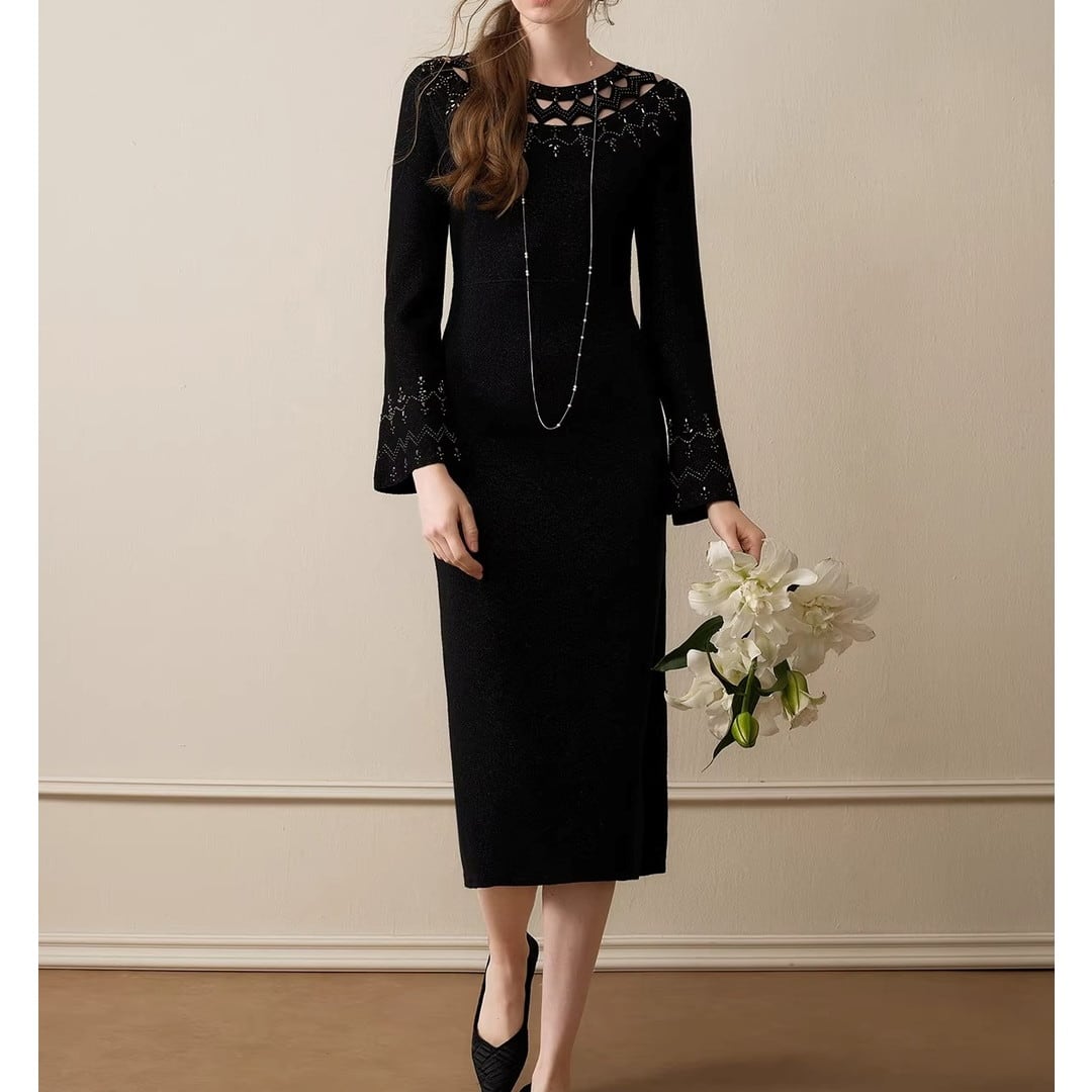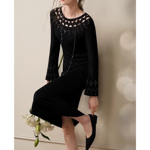 デコルテのカットアウトが印象的なミディ丈タイトドレス。長袖デザインで上品さを演出しつつ、ボディラインに沿ったシルエットが女性らしさを際立たせます。ちょっとしたお出かけや、改まったお席にもおすすめです。