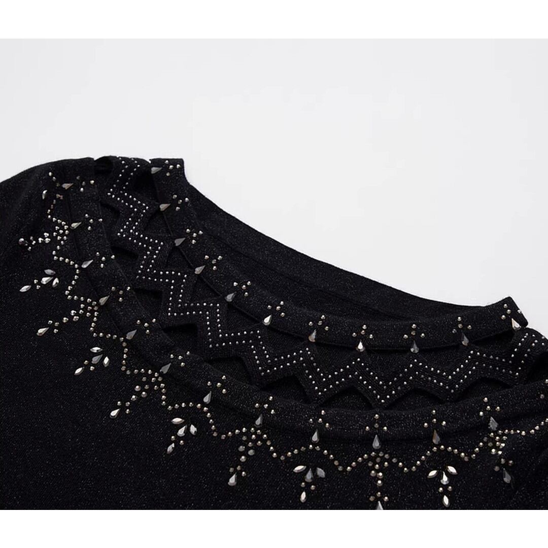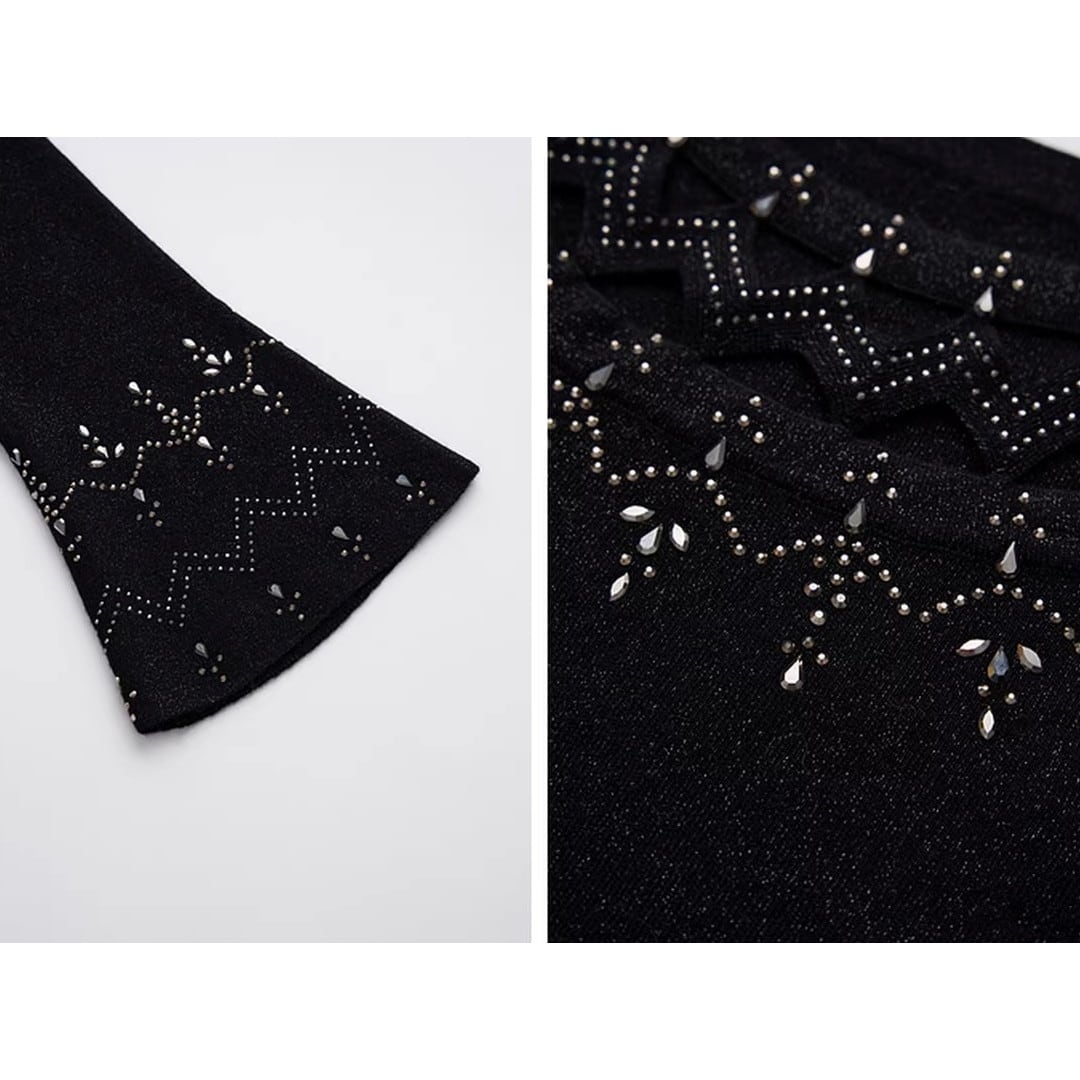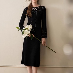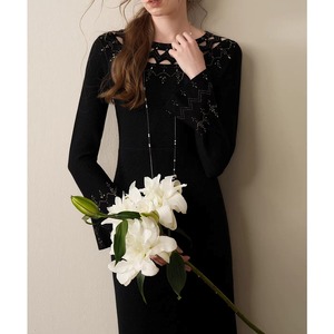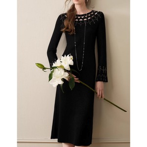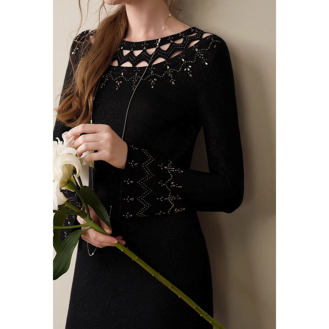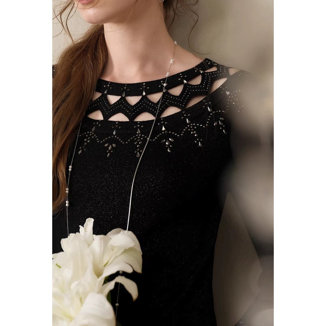 デコルテのカットアウトが印象的なミディ丈タイトドレス。長袖デザインで上品さを演出しつつ、ボディラインに沿ったシルエットが女性らしさを際立たせます。ちょっとしたお出かけや、改まったお席にもおすすめです。