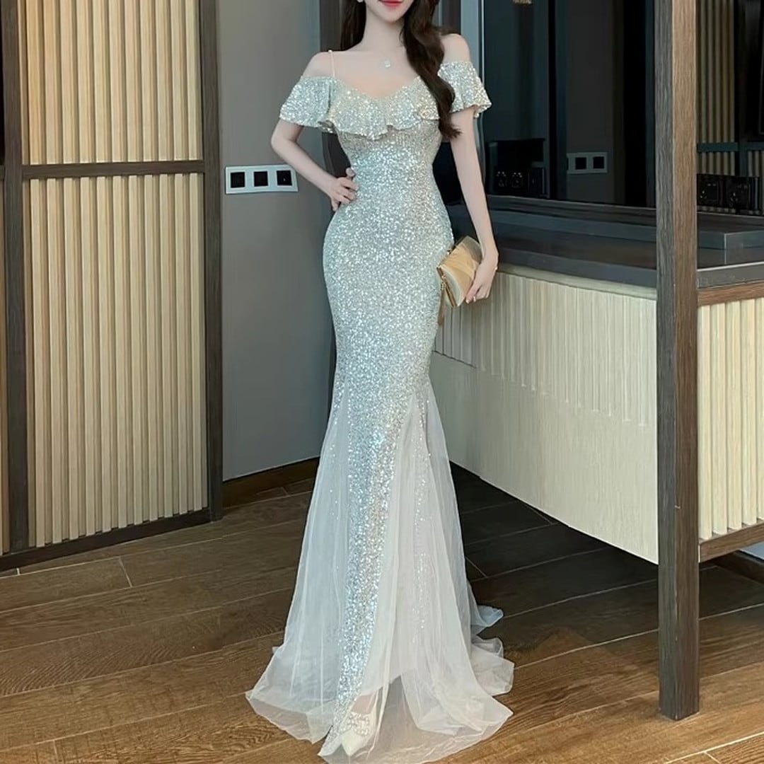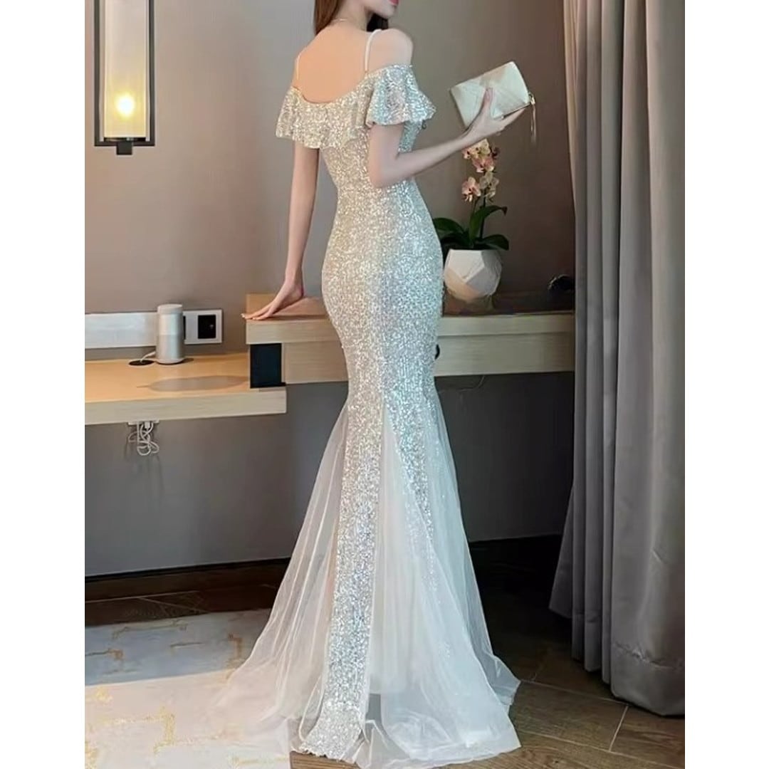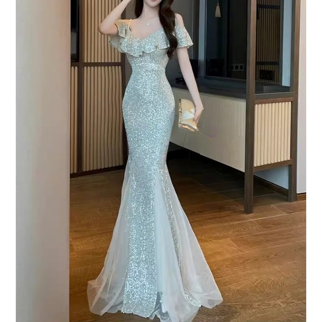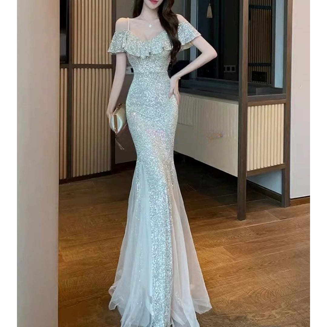 特別な夜にふさわしい、オフショルダーのマーメイドロングイブニングドレス。繊細なフリルがデコルテを美しく演出し、上品なオフショルダーデザインが肩のラインをすっきりと見せてくれます。ボディラインに沿ったマーメイドシルエットが、女性らしい曲線美を際立たせ、華やかな印象に。パーティや特別なイベントで、ひときわ輝きを放つスタイルを叶えます。