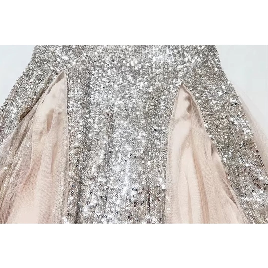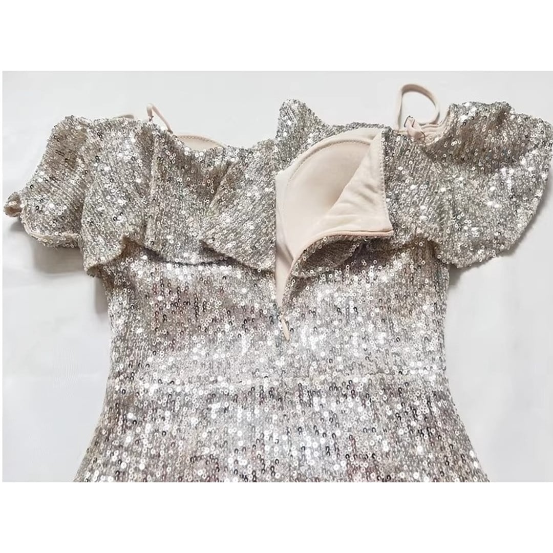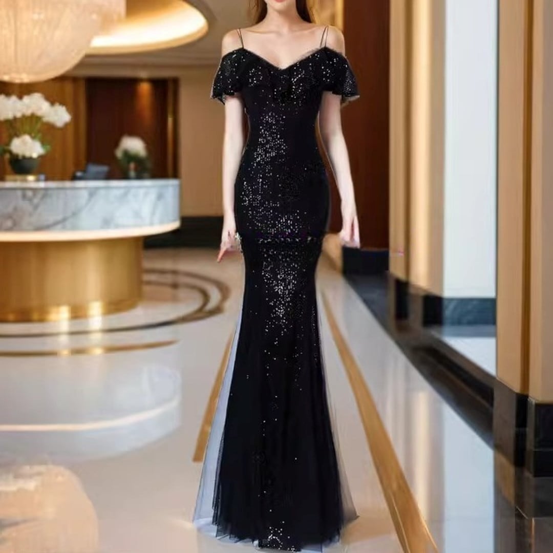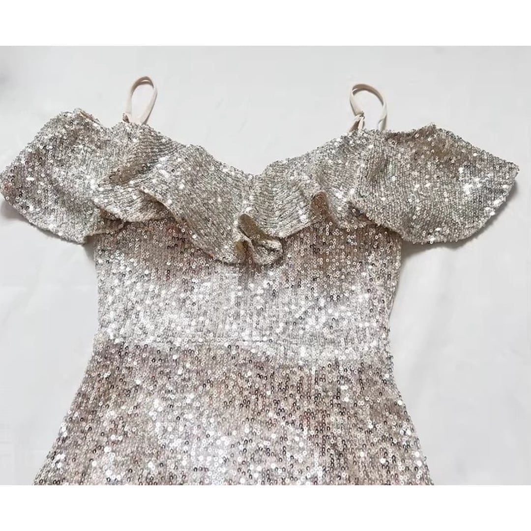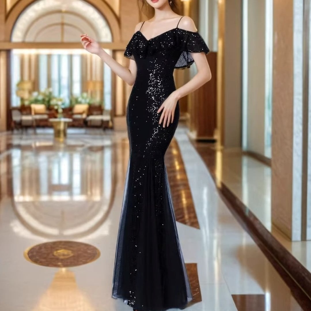特別な夜にふさわしい、オフショルダーのマーメイドロングイブニングドレス。繊細なフリルがデコルテを美しく演出し、上品なオフショルダーデザインが肩のラインをすっきりと見せてくれます。ボディラインに沿ったマーメイドシルエットが、女性らしい曲線美を際立たせ、華やかな印象に。パーティや特別なイベントで、ひときわ輝きを放つスタイルを叶えます。