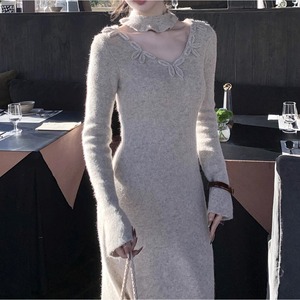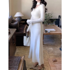 リラックスした雰囲気と洗練されたシルエットを両立するマキシニットドレス。長袖デザインで、落ち着いたカラーは、様々なシーンで活躍します。ちょっとしたお出かけから、お家でのリラックスタイムまで、快適な着心地であなたを包み込みます。