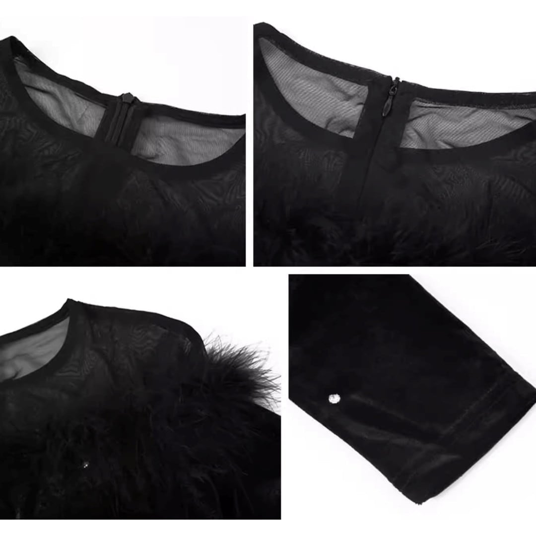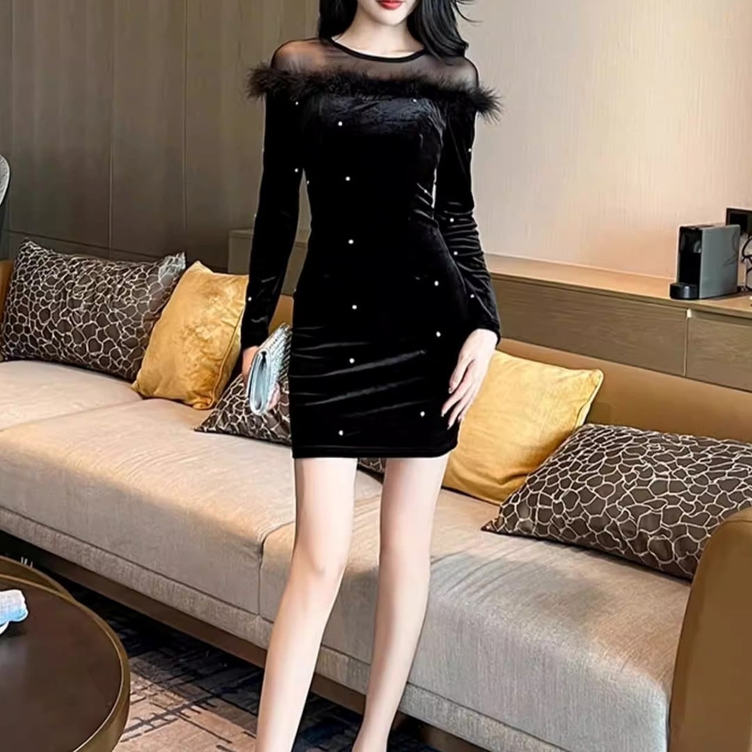 パーティーシーンに映えるミニドレス。長袖のデザインで、華やかさを演出しつつも上品な印象を与えます。ちょっとしたお呼ばれや特別な日の装いにおすすめです。