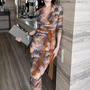 エレガントなシルエットを演出するラップスタイル。深めのVネックがデコルテを美しく見せ、大人の魅力を引き立てます。長袖なので、一枚ではもちろん、ジャケットやカーディガンを羽織っても素敵に着こなせます。