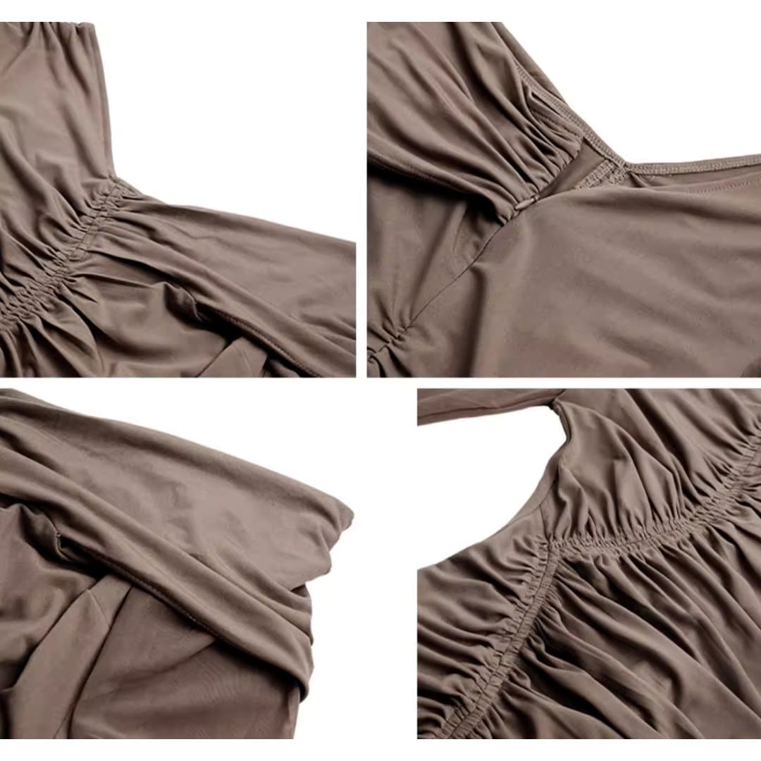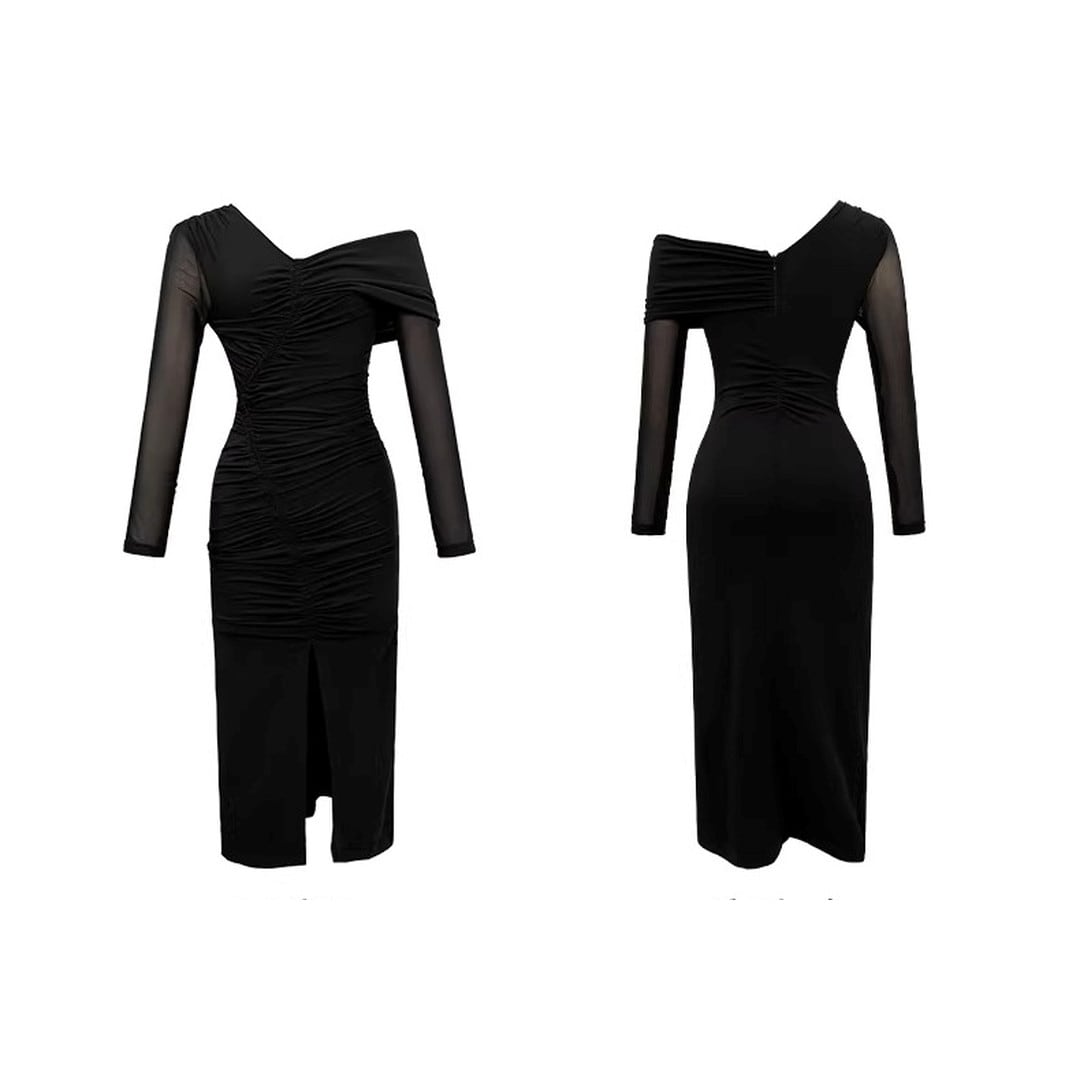 アシンメトリーなネックラインが目を引くミディ丈の長袖ドレス。片方の肩を大胆に見せるデザインで、大人の女性らしさを演出します。スリット入りで足さばきも良く、エレガントなシルエットながらも快適な着心地。パーティーシーンはもちろん、ディナーやイベントなど、特別な日にぴったりの一着です。