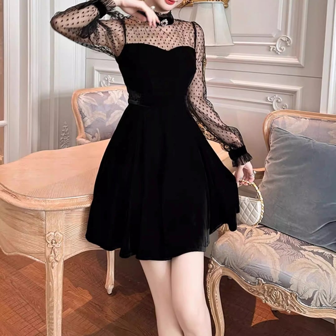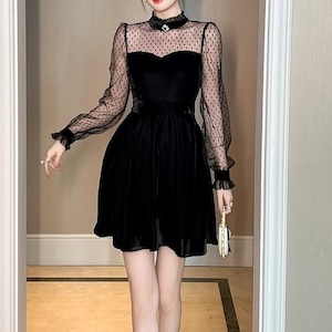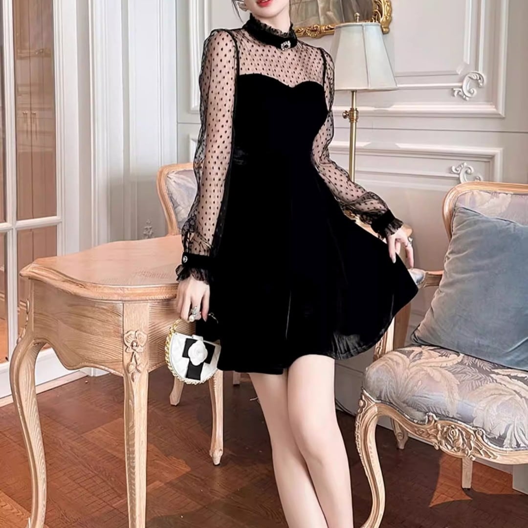 ドット柄の長袖とミニ丈の組み合わせが目を引くドレスです。パーティーやイベントなど、華やかなシーンにぴったり。上品なデザインなので、特別な日の装いに最適です。