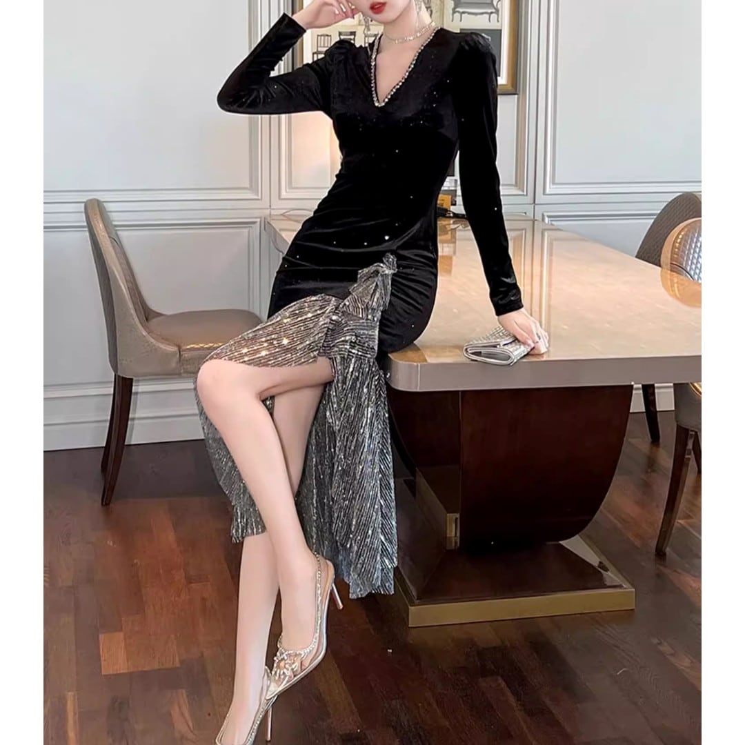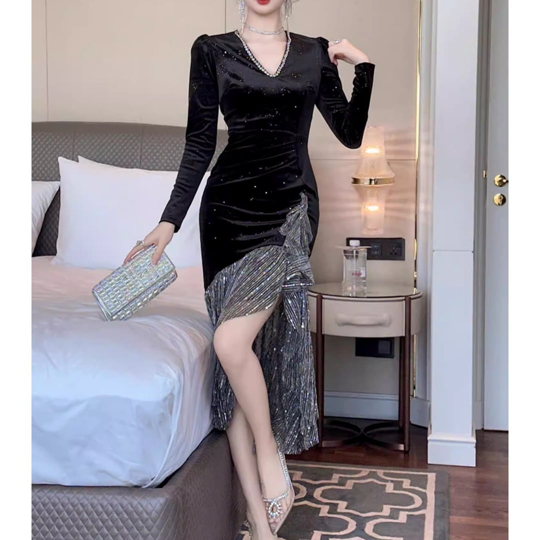アシンメトリーな裾が特徴的なミディ丈ドレスです。長袖デザインで上品な印象を与えつつ、片側に施されたラッフルが華やかさをプラス。パーティーシーンや特別な日の装いにおすすめの一着です。