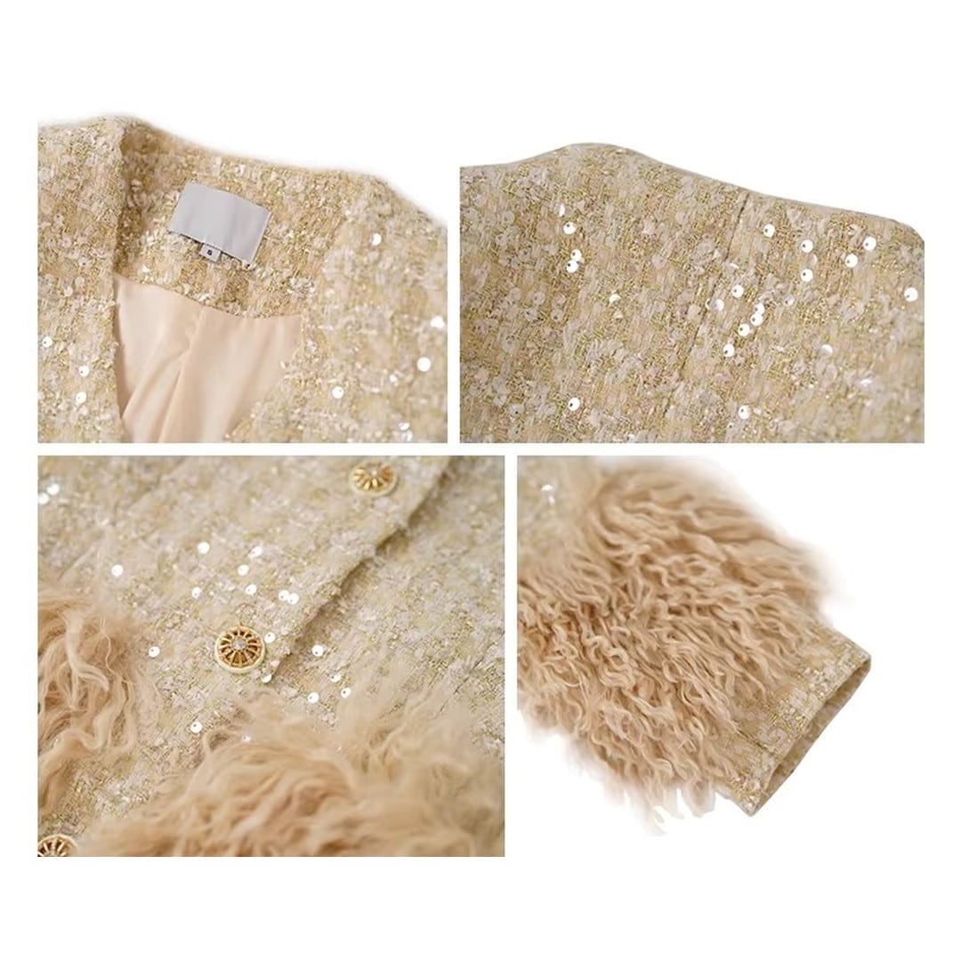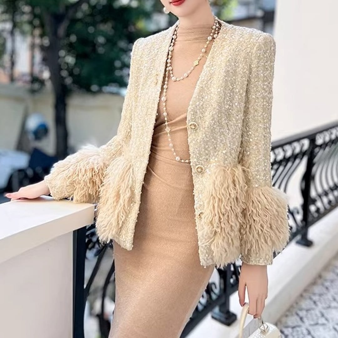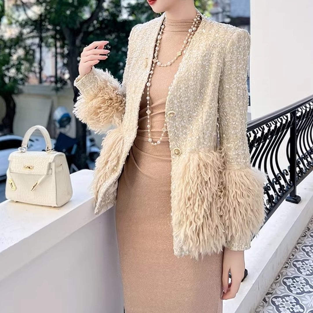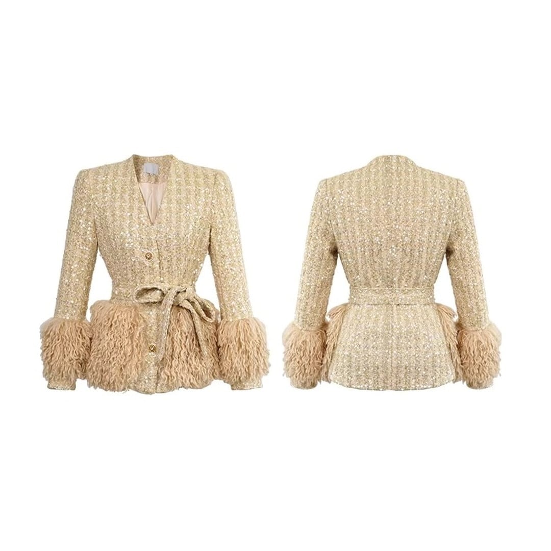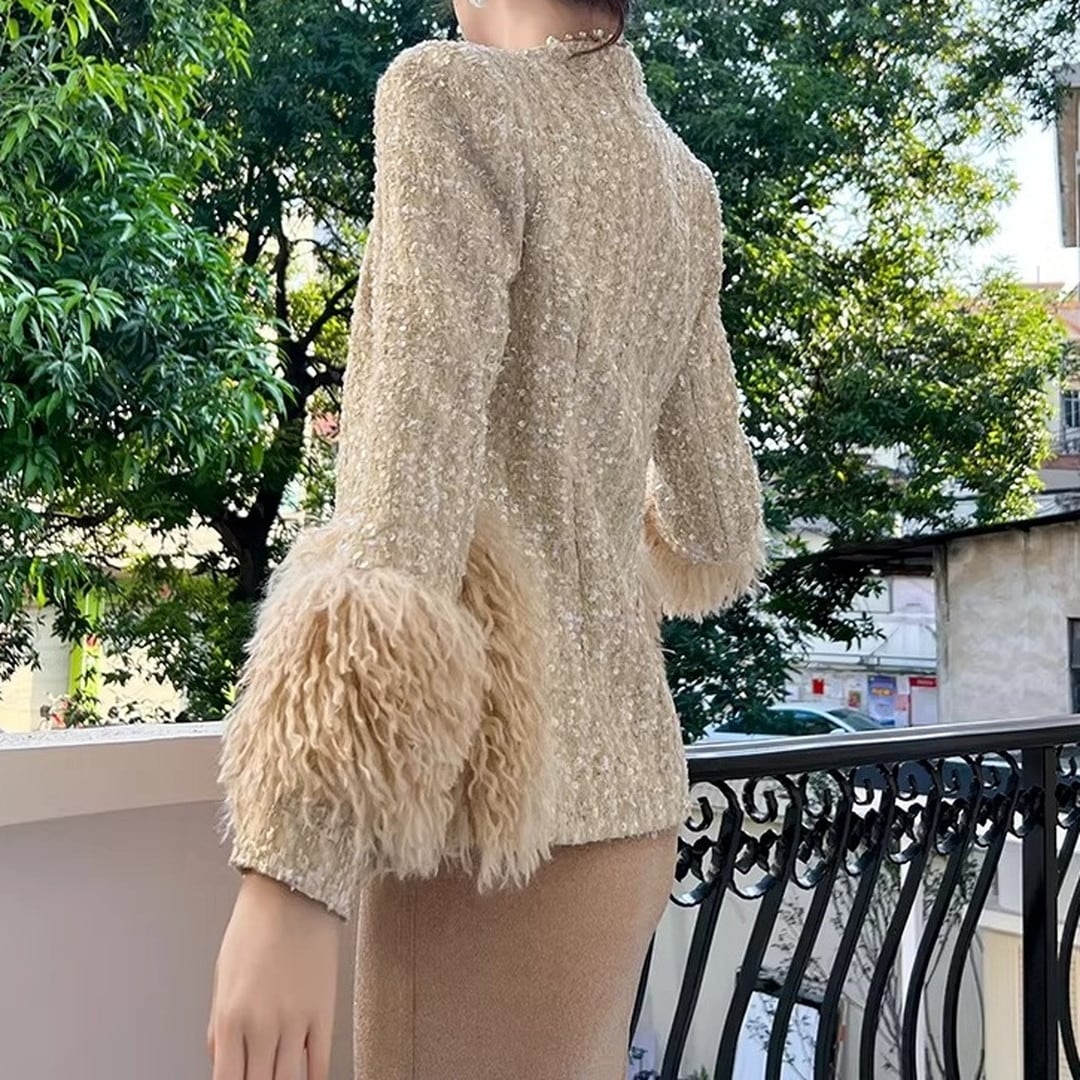 ノーカラーのデザインが首元をすっきりと見せてくれるジャケットです。ウエスト丈なので、ワンピースやスカートとの相性も抜群。袖口にあしらわれたファーが、上品で華やかな印象をプラスしてくれます。ちょっとしたお出かけやパーティーシーンにもおすすめです。