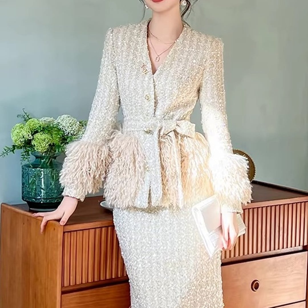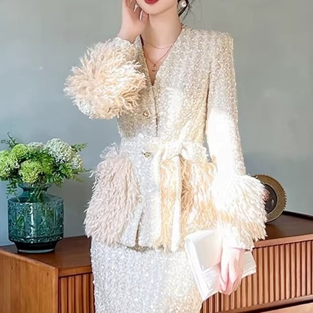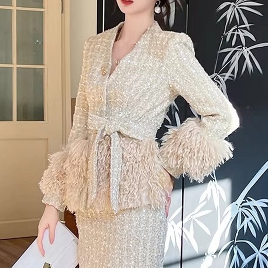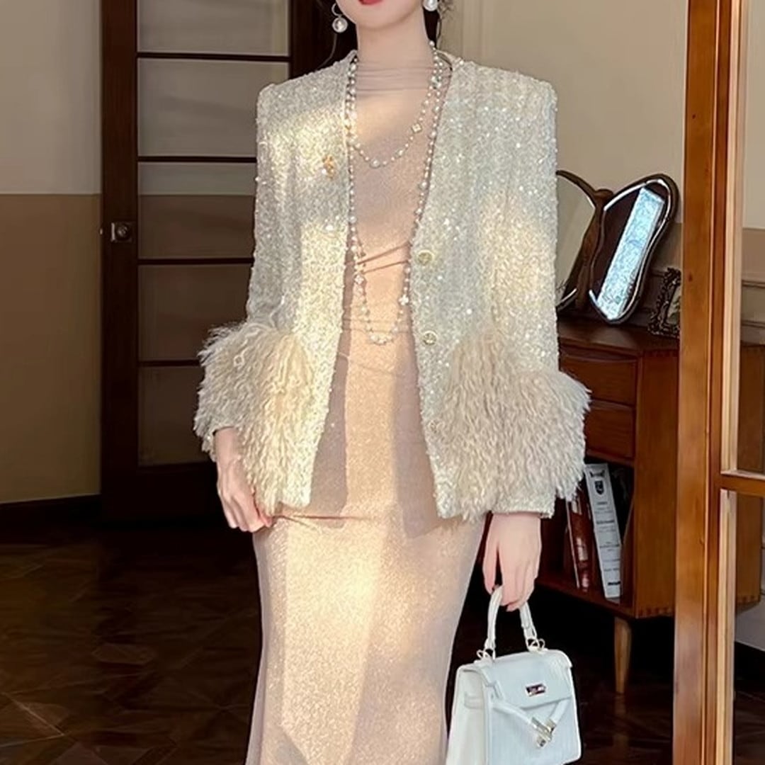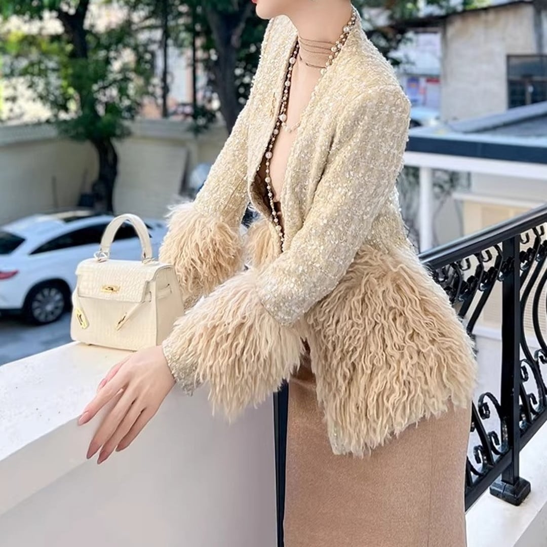ノーカラーのデザインが首元をすっきりと見せてくれるジャケットです。ウエスト丈なので、ワンピースやスカートとの相性も抜群。袖口にあしらわれたファーが、上品で華やかな印象をプラスしてくれます。ちょっとしたお出かけやパーティーシーンにもおすすめです。