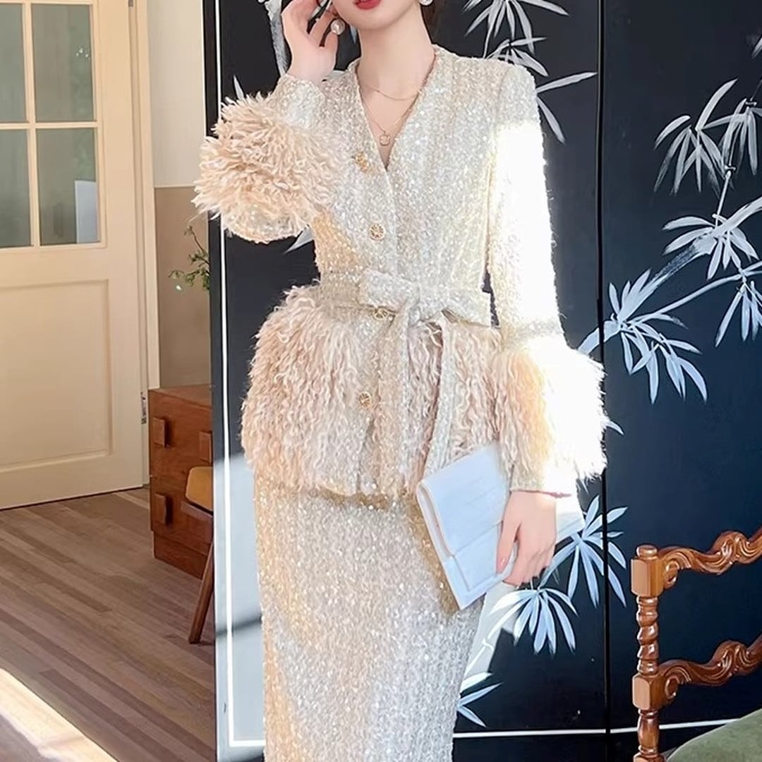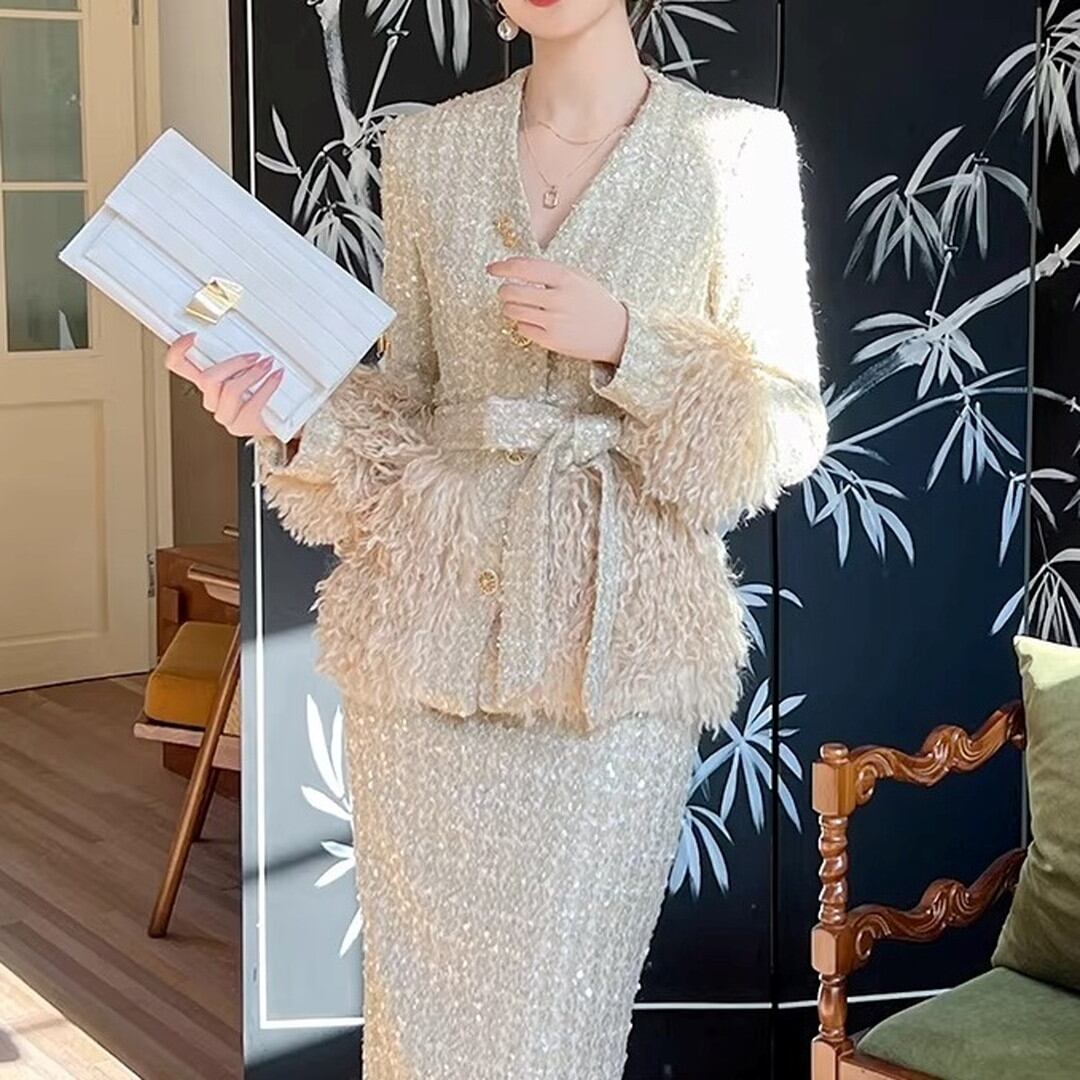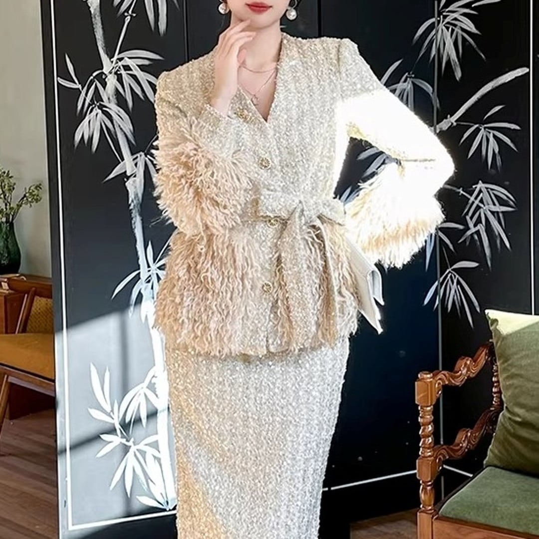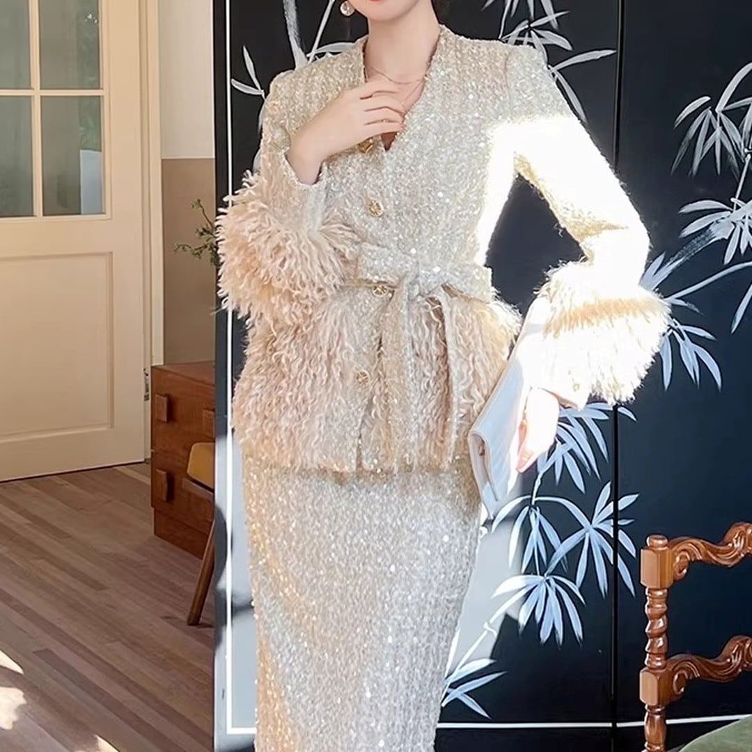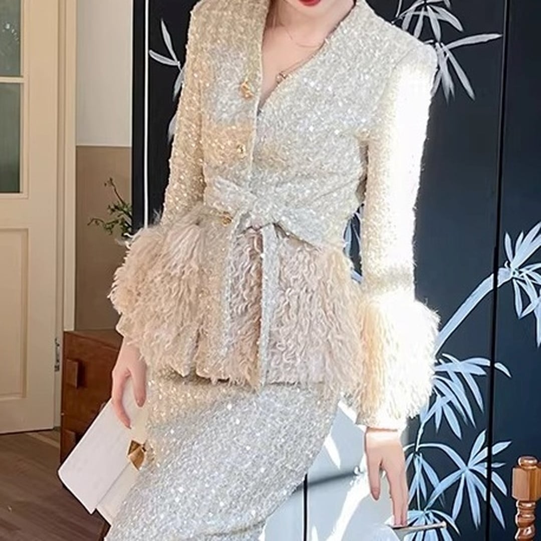 ノーカラーのデザインが首元をすっきりと見せてくれるジャケットです。ウエスト丈なので、ワンピースやスカートとの相性も抜群。袖口にあしらわれたファーが、上品で華やかな印象をプラスしてくれます。ちょっとしたお出かけやパーティーシーンにもおすすめです。