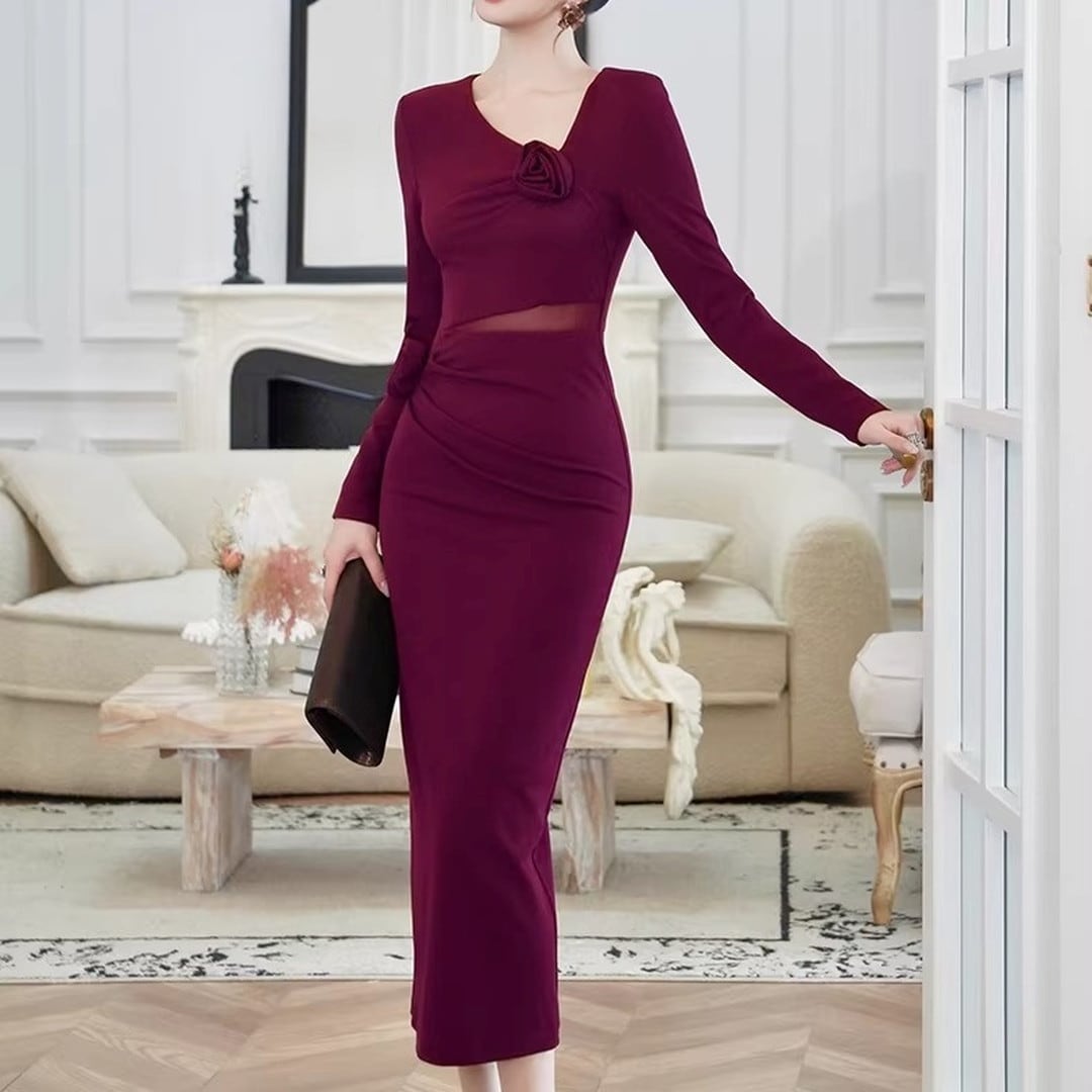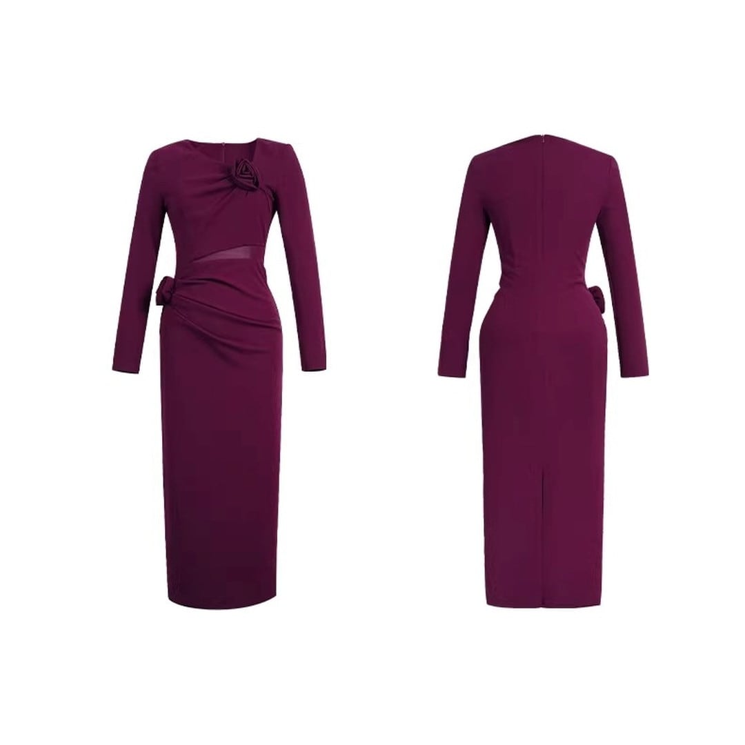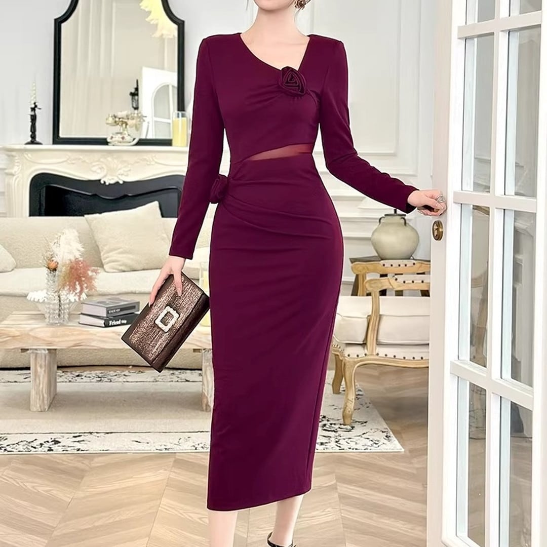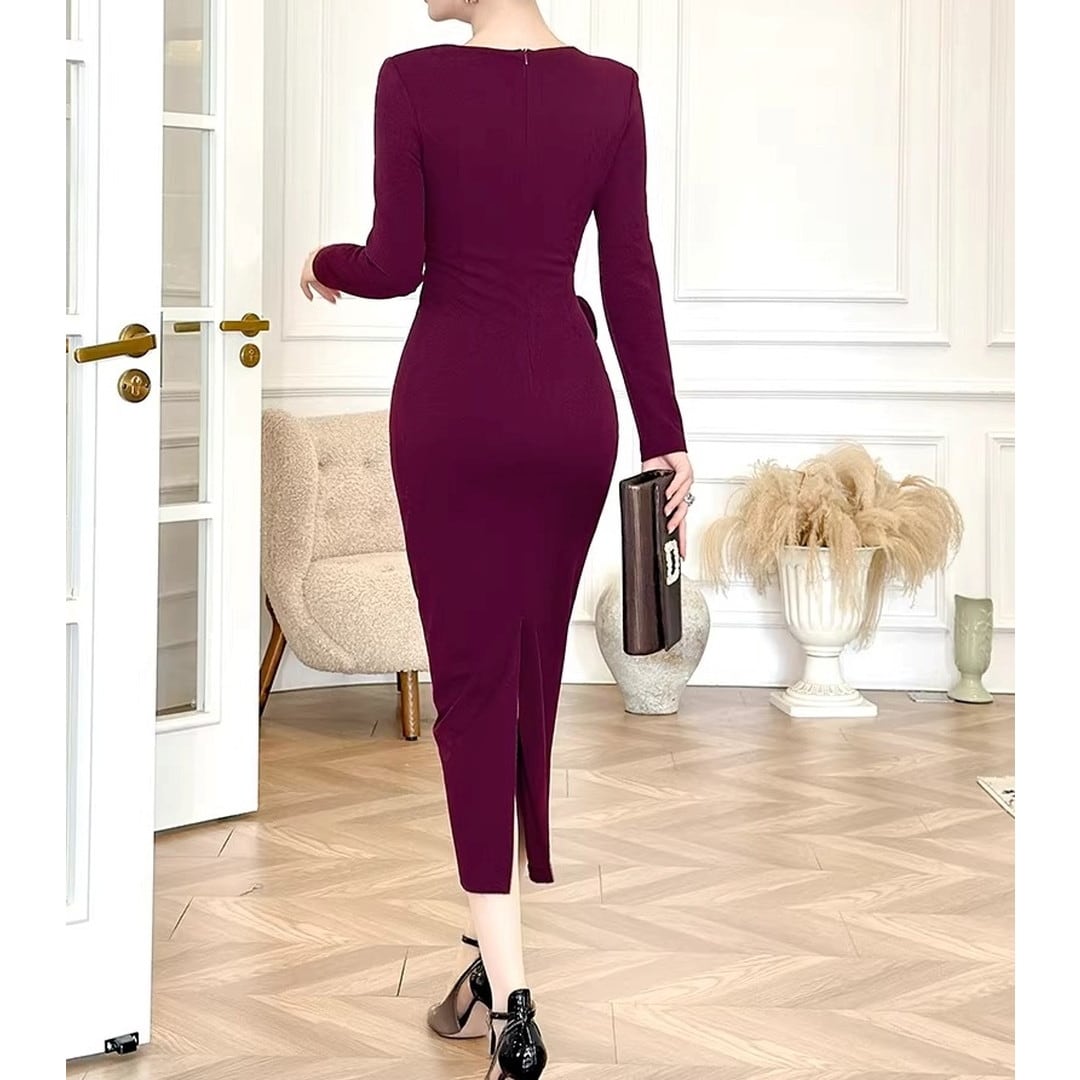 エレガントなシルエットが魅力の長袖ミディ丈タイトドレス。美しいボディラインを演出し、大人の女性らしさを引き立てます。胸元のデザインがアクセントとなり、華やかさをプラス。ちょっとしたお呼ばれやパーティーシーンにもおすすめです。