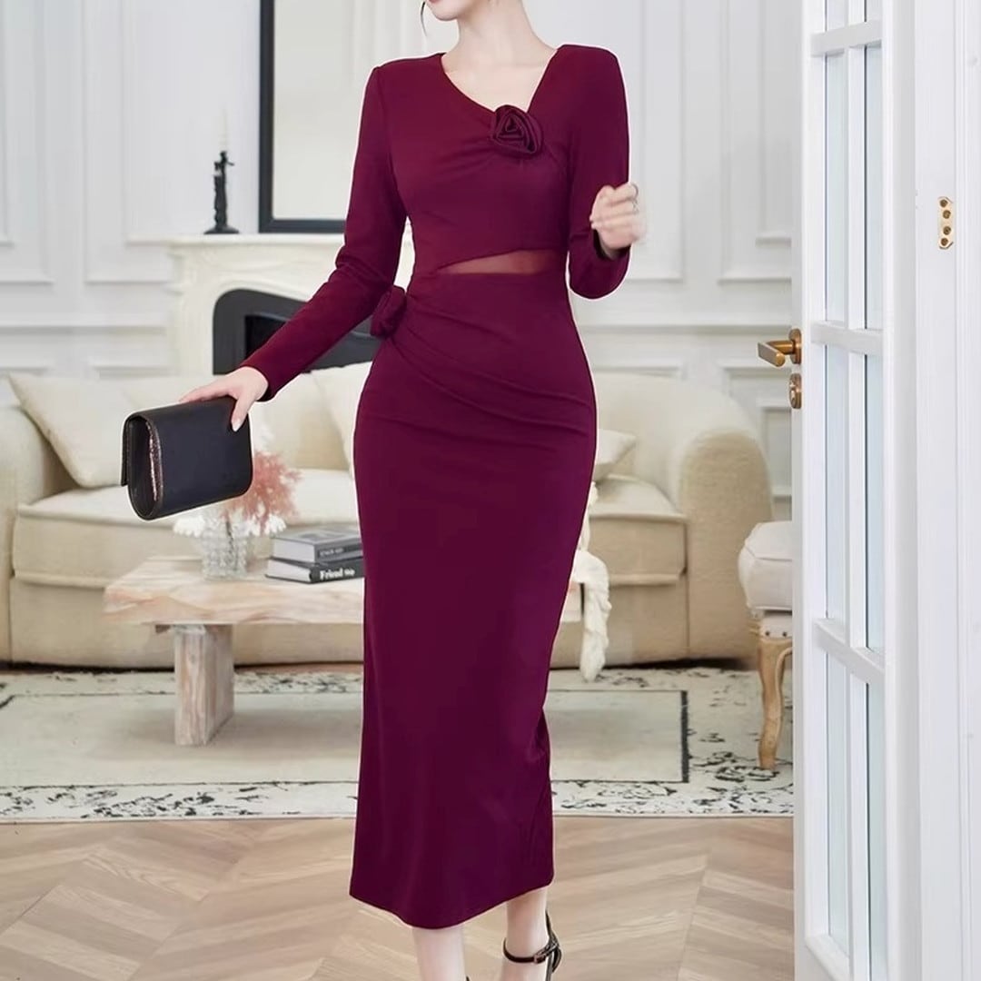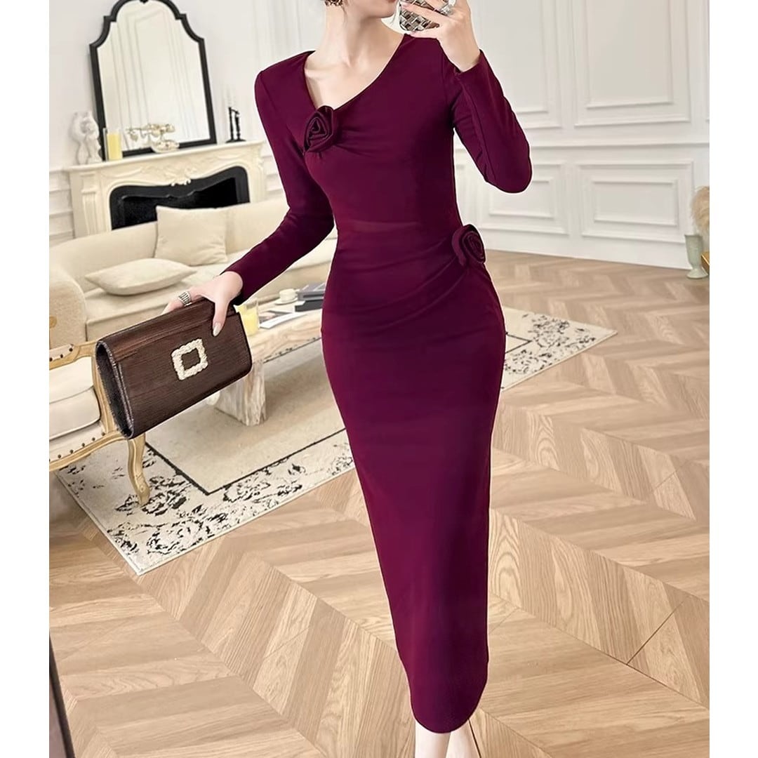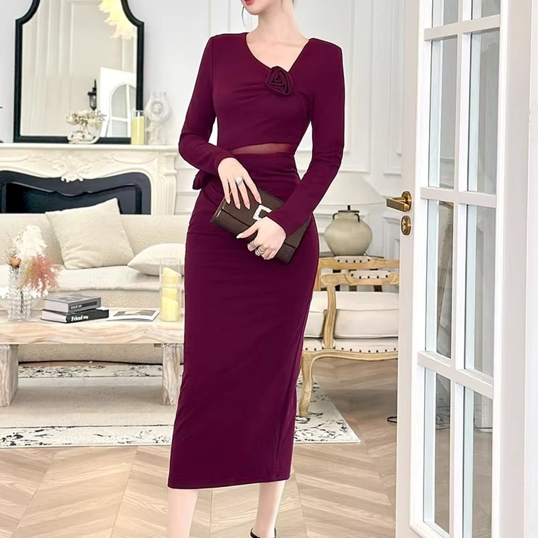 エレガントなシルエットが魅力の長袖ミディ丈タイトドレス。美しいボディラインを演出し、大人の女性らしさを引き立てます。胸元のデザインがアクセントとなり、華やかさをプラス。ちょっとしたお呼ばれやパーティーシーンにもおすすめです。